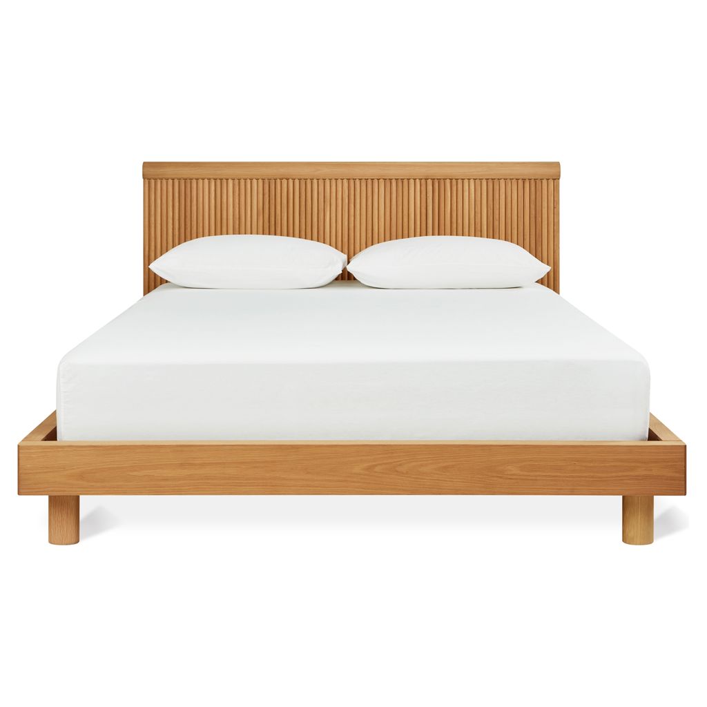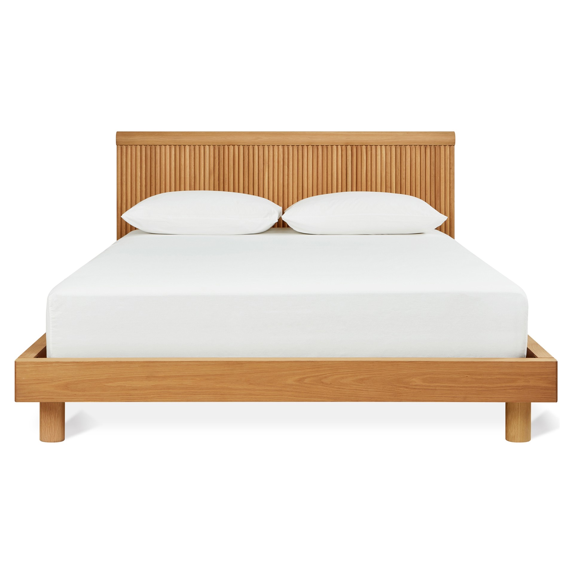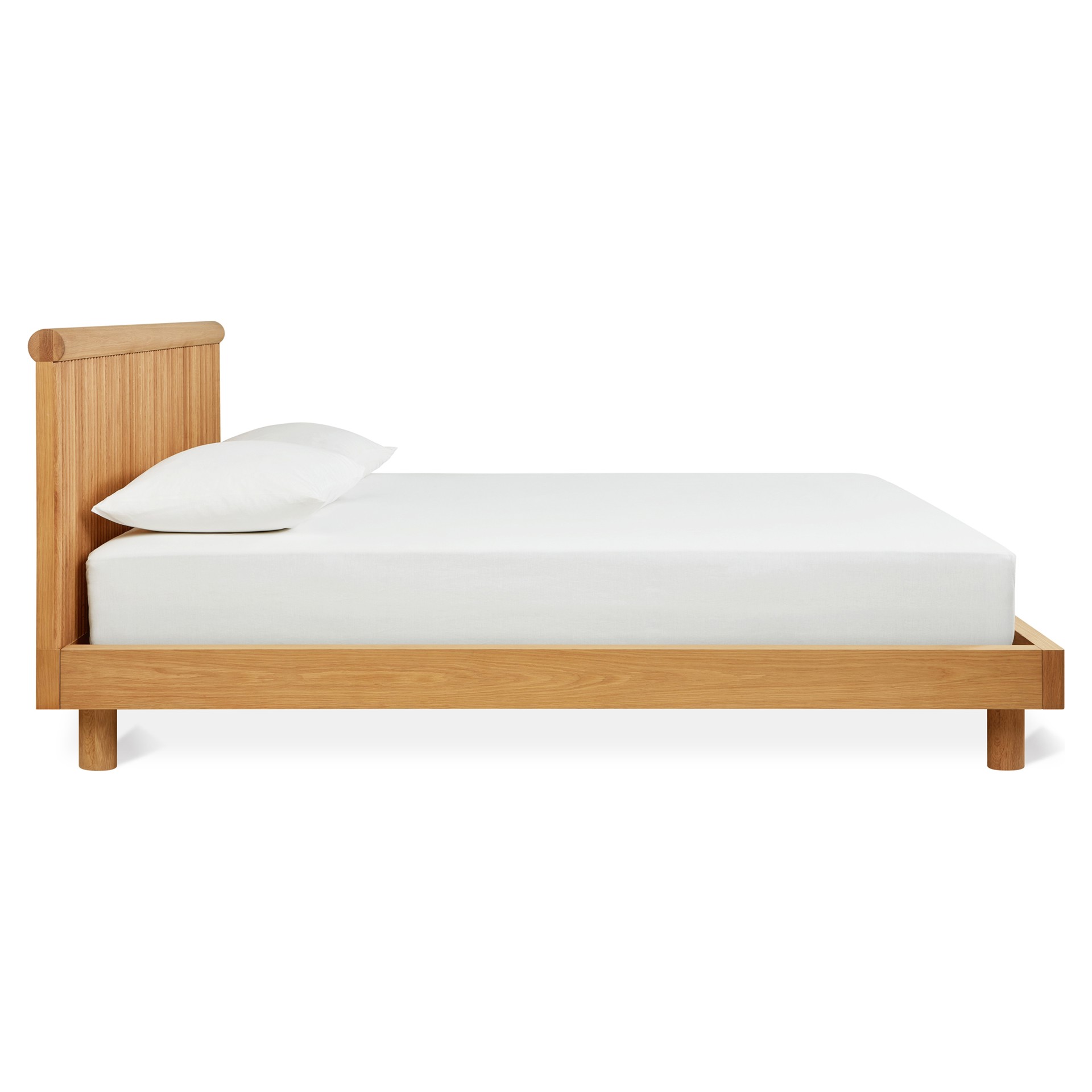 Sous tous les angles, cette conception révèle des qualités qui se juxtaposent et interagissent doucement : une tête de lit festonnée avec un manteau en bois massif ; grain de bois texturé et biologique; des courbes douces équilibrées par des lignes ciselées.