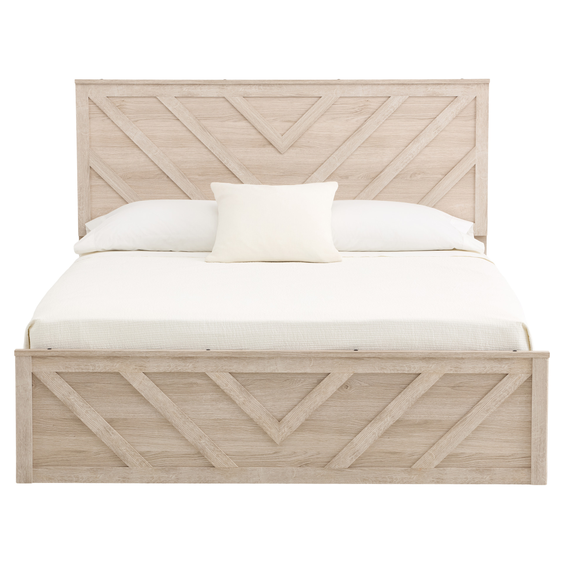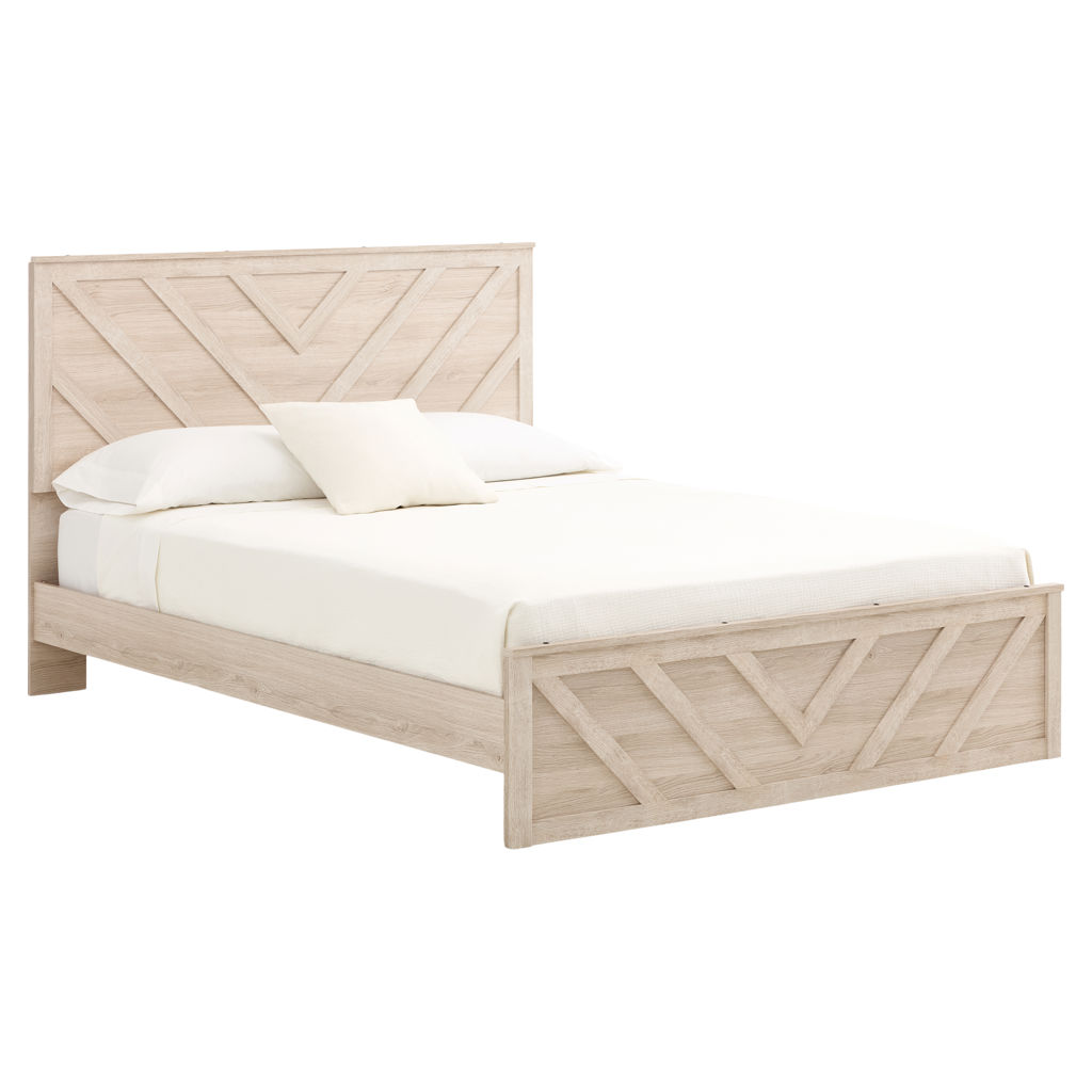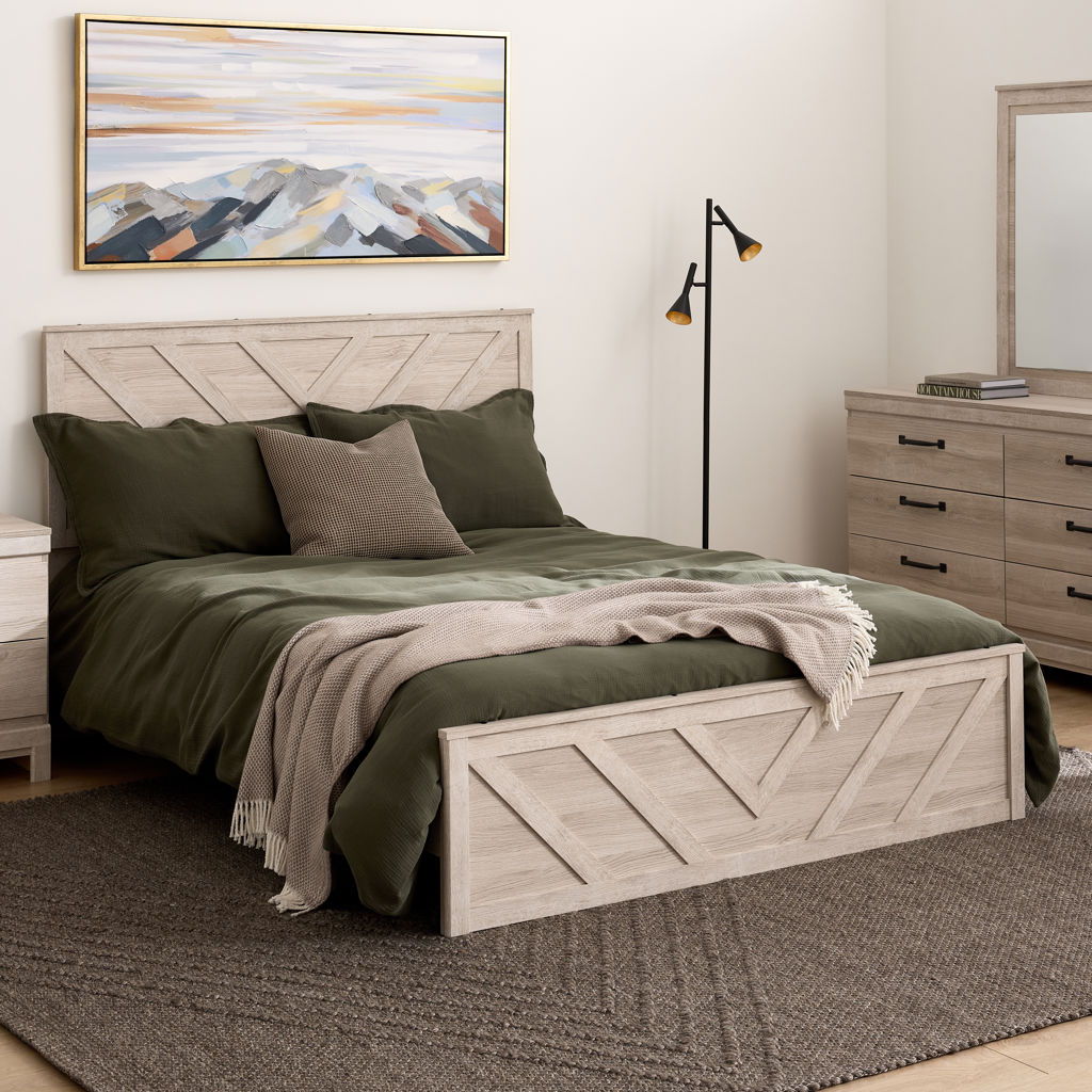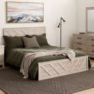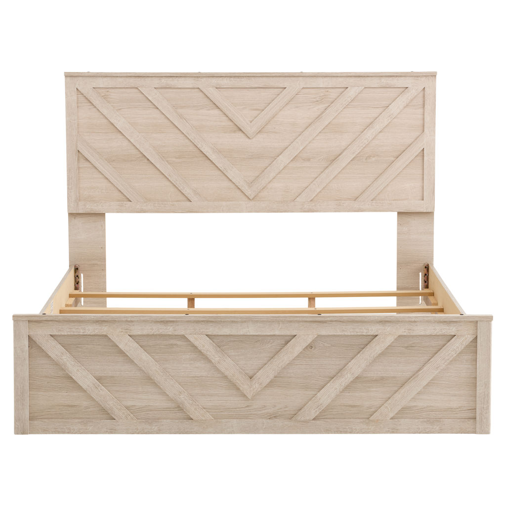 Sa finition effet bois naturel apporte chaleur et sérénité, tandis que sa construction robuste garantit stabilité et durabilité pour des années de confort. Le design réfléchi de la tête et du pied de lit ajoute une dimension visuelle unique qui rehausse instantanément l'ambiance de votre chambre.