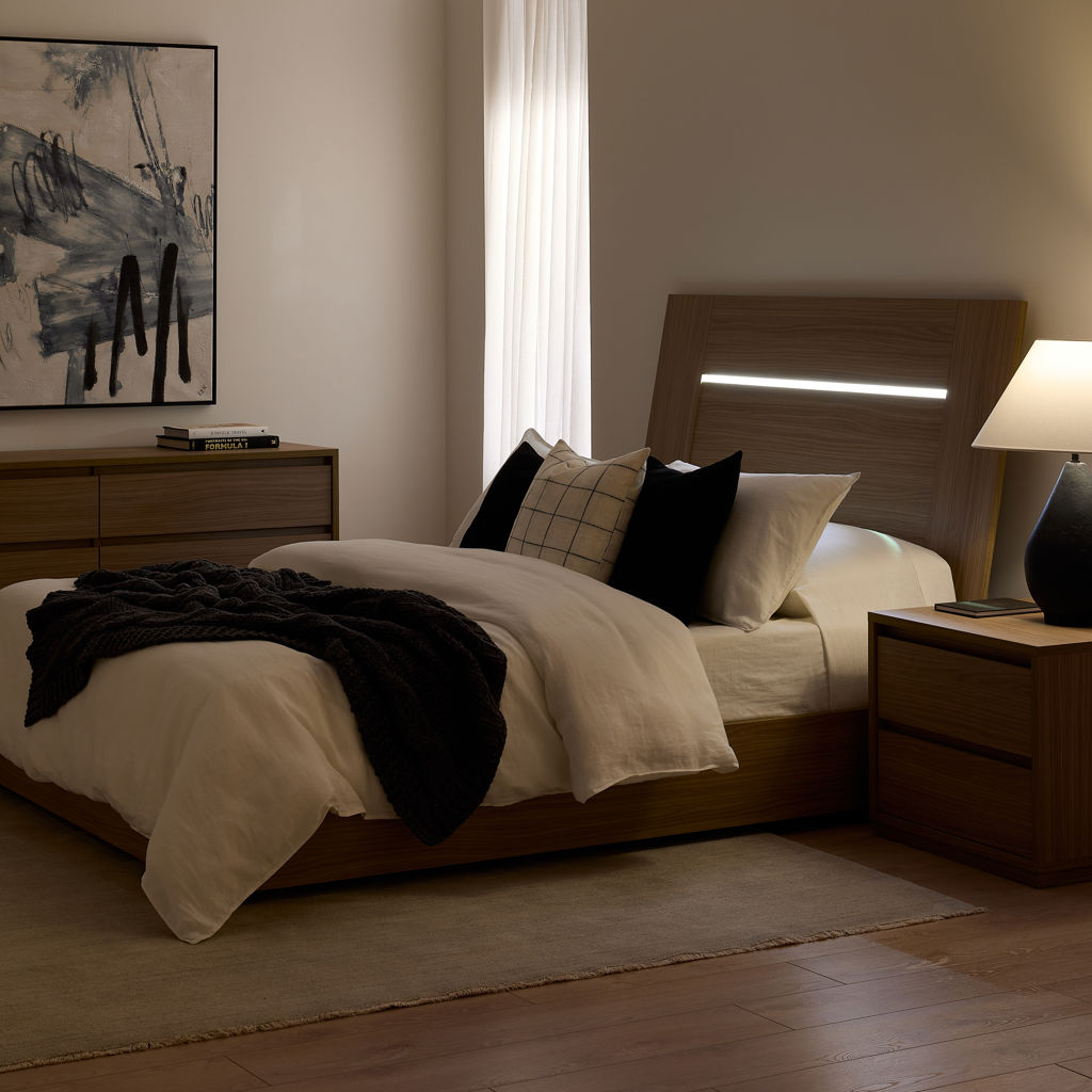 Apportez une touche moderne et chaleureuse à votre chambre à coucher avec ce lit au design contemporain, rehaussé par une lumière intégrée directement dans la tête de lit.