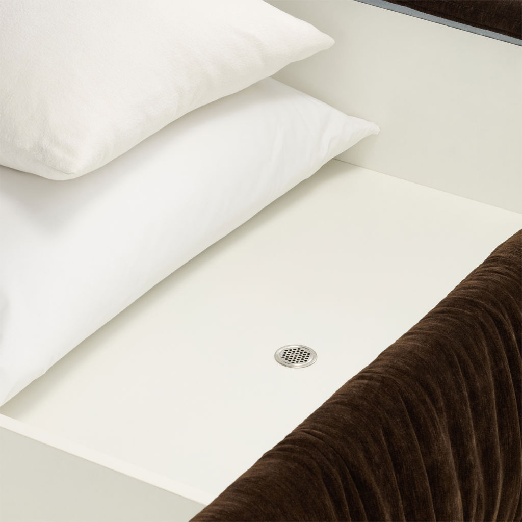 Pratique, ce lit cache un espace de rangement spacieux sous le matelas, accessible grâce à un système hydraulique facile à utiliser.