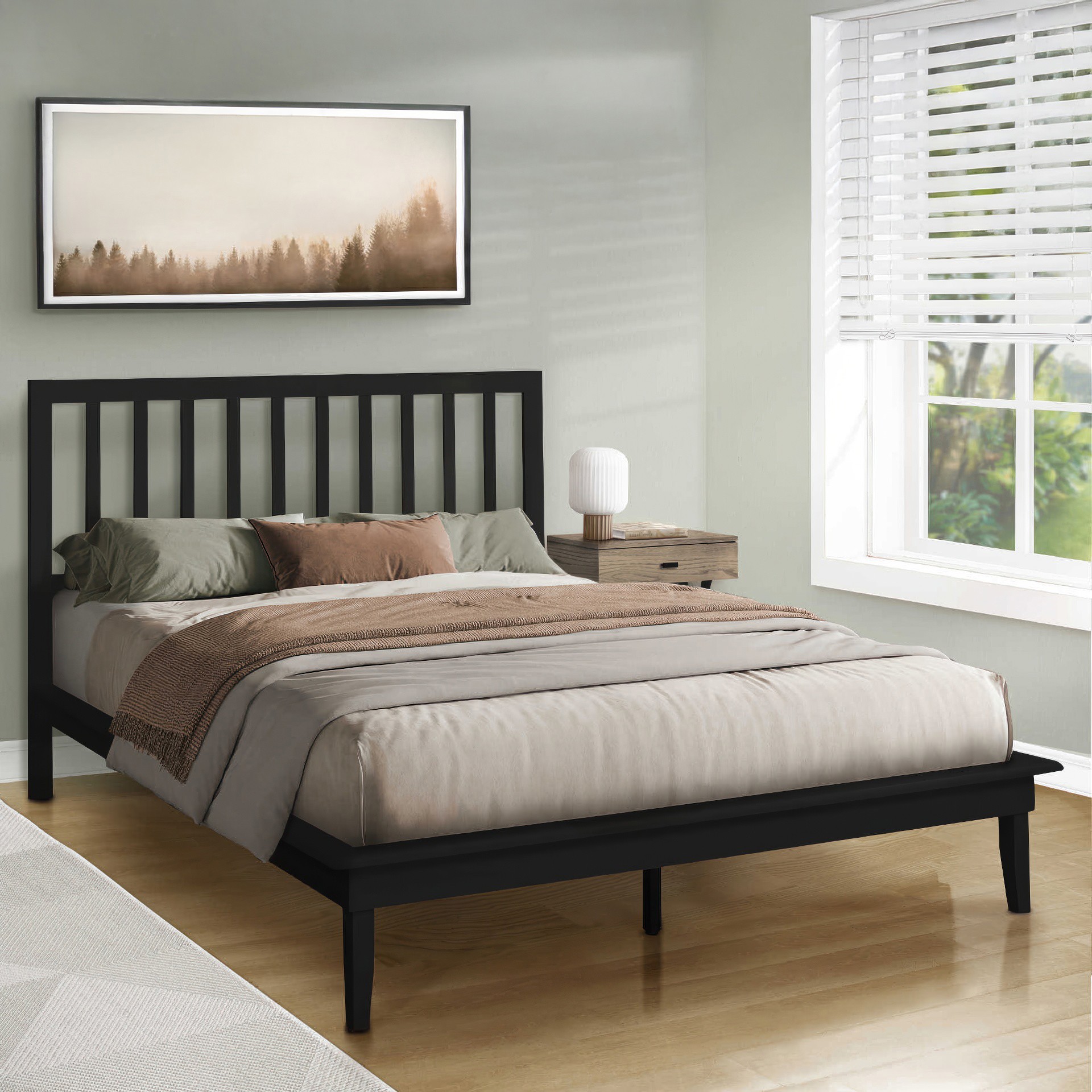 La construction solide du cadre en bois noir comprend des lattes en bois complètes au bas pour poser un matelas de taille "queen" standard sans avoir besoin de sommier.