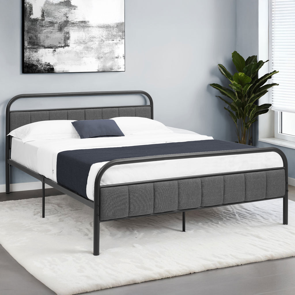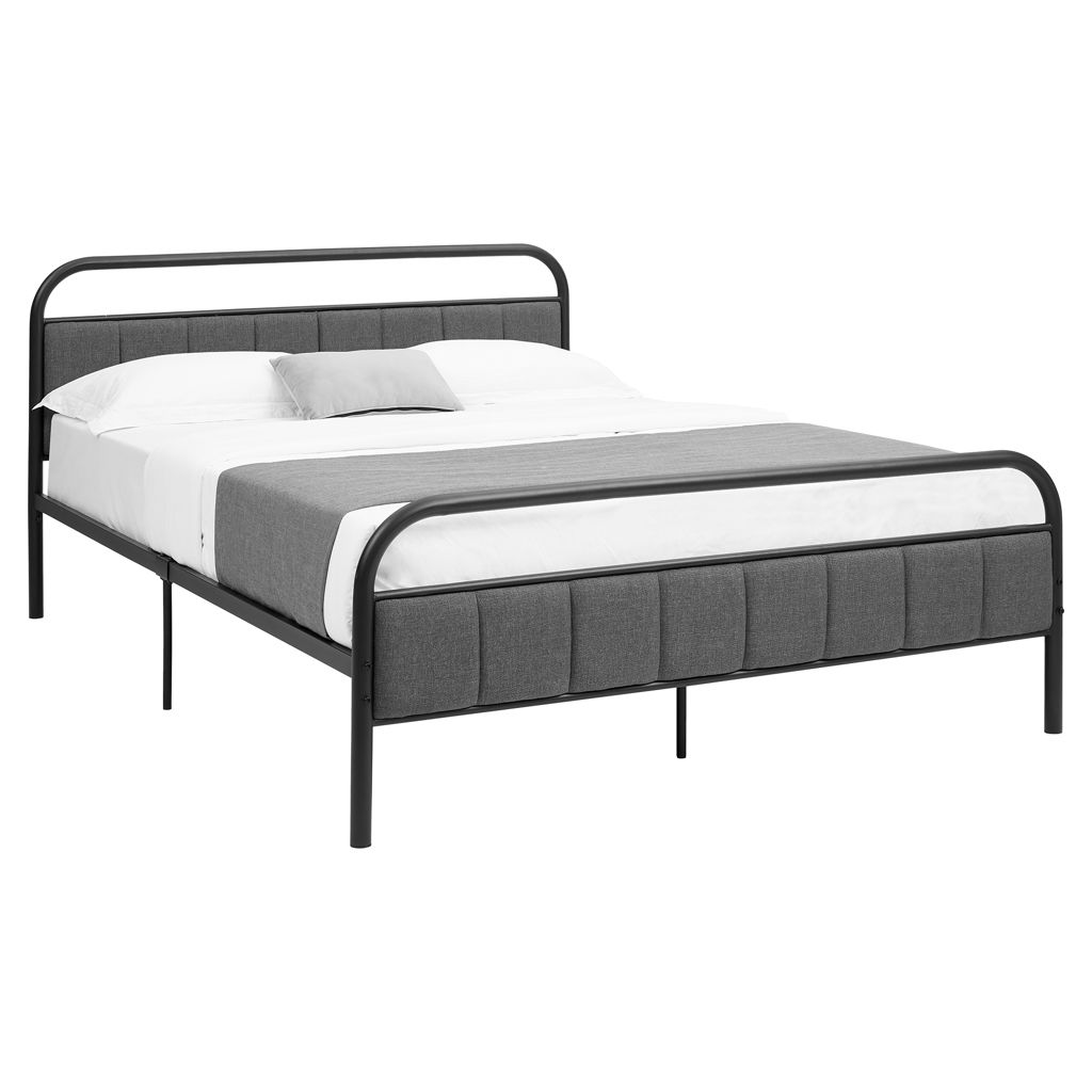 Nous vous présentons notre version moderne et élégante du lit plateforme en métal de taille grand lit qui transformera votre chambre en un sanctuaire chic. Le cadre en métal noir offre une construction solide et est rehaussé d'une tête de lit et d'un pied de lit rembourrés dans un tissu au look lin gris, doux au toucher, avec un garnissage en mousse, ajoutant une touche de style à toute chambre moderne.