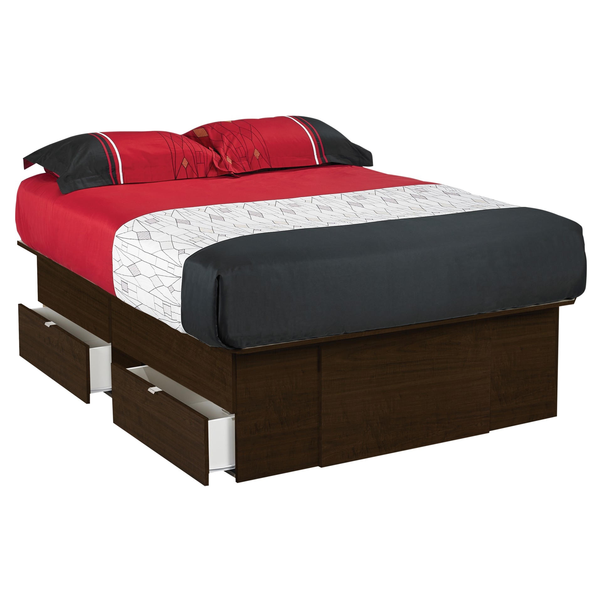 Ce lit de type plateforme d’une hauteur de 20 pouces est particulièrement pratique puisqu'il possède quatre tiroirs pouvant être installés à droite ou à gauche, vous offrant ainsi des espaces de rangement supplémentaires pour votre chambre à coucher.