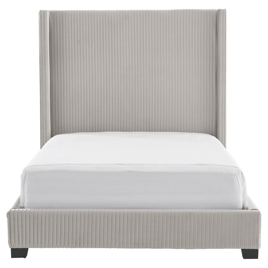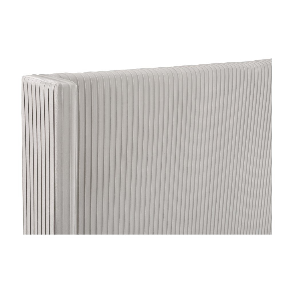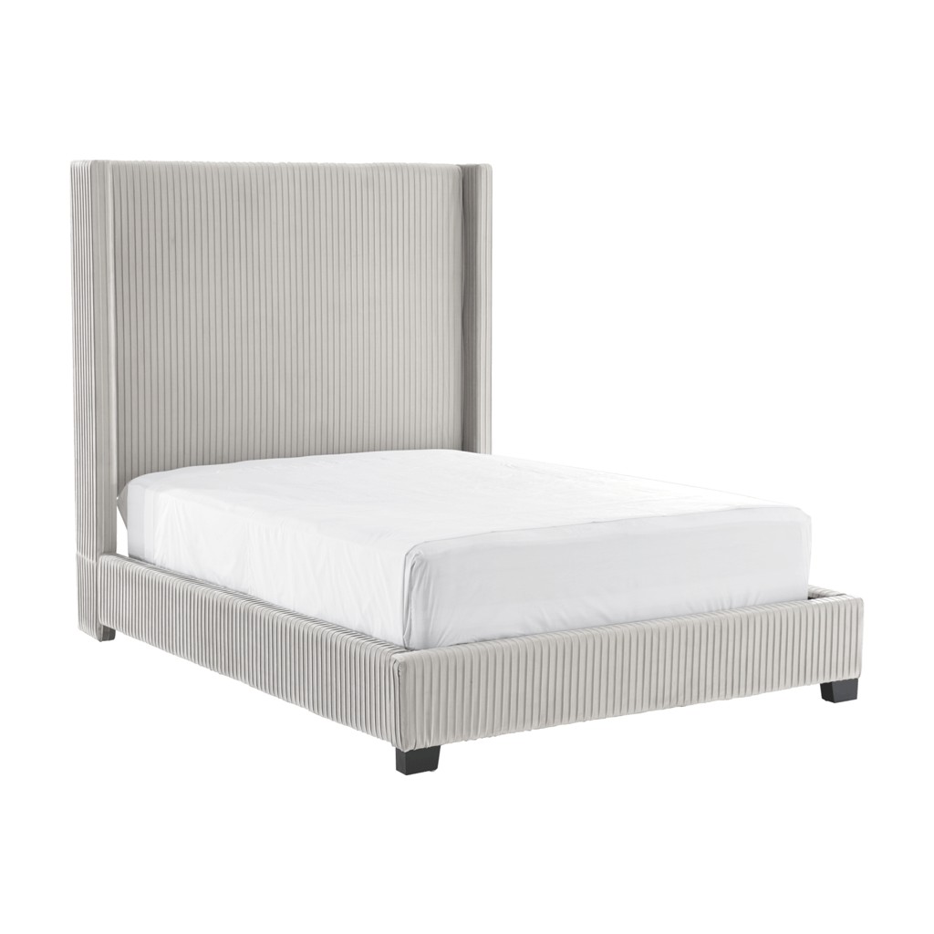 Associées au luxe, les têtes de lit élevées habillent la pièce et lui confèrent une aura de sophistication. Présentant un capitonnage vertical sur un velours gris clair contribuant à sa présence imposante, ce très grand lit contribue à l'élégance d'une chambre à coucher audacieuse.