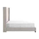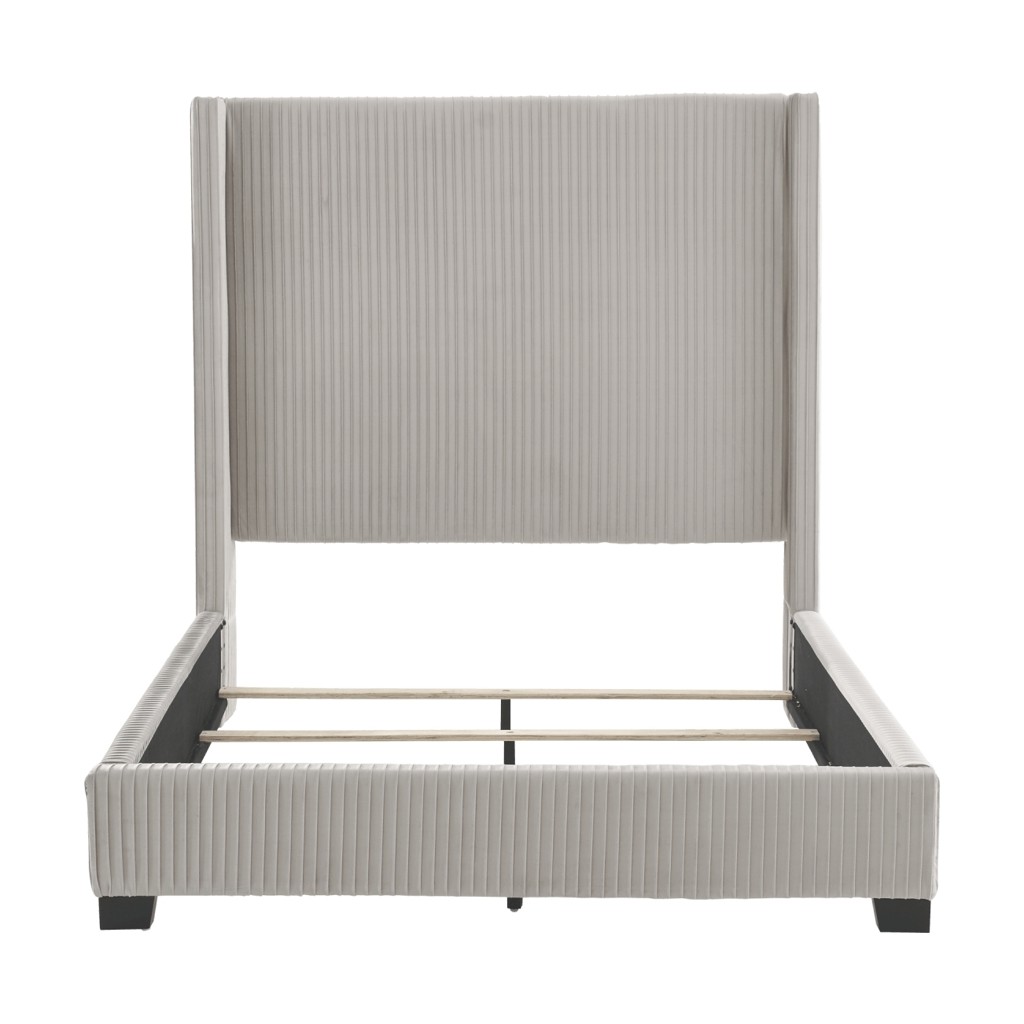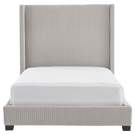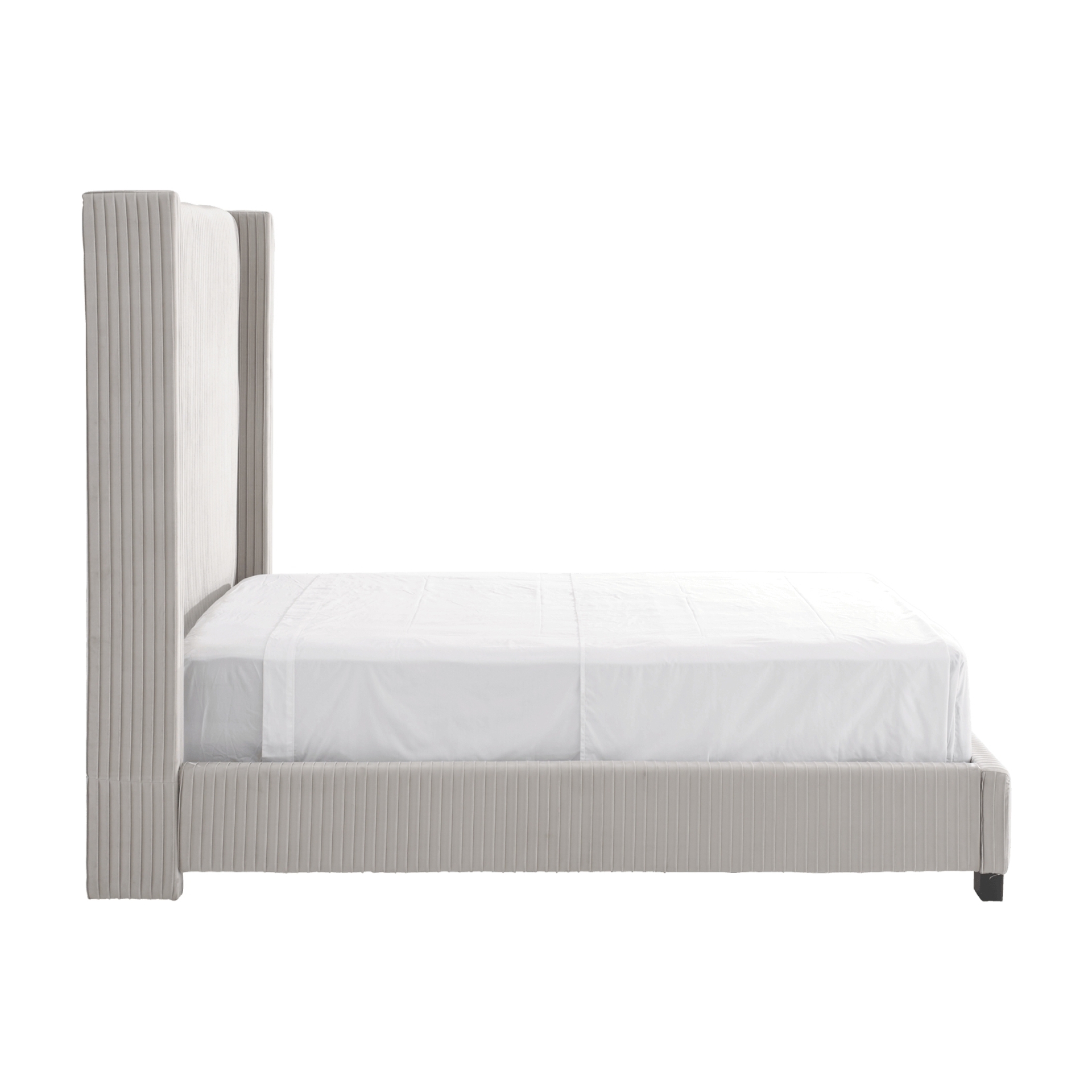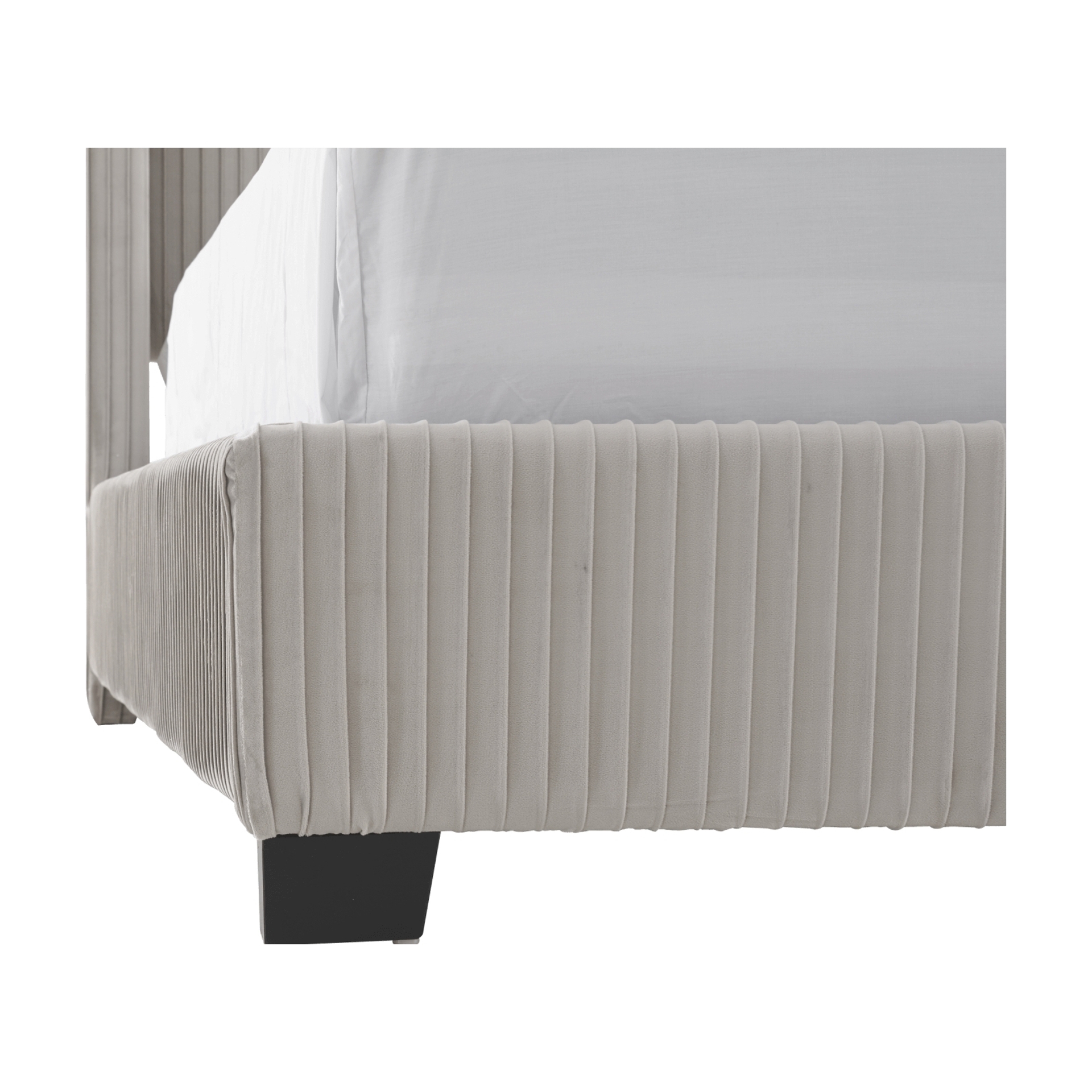 Associées au luxe, les têtes de lit élevées habillent la pièce et lui confèrent une aura de sophistication. Présentant un capitonnage vertical sur un velours gris clair contribuant à sa présence imposante, ce très grand lit contribue à l'élégance d'une chambre à coucher audacieuse.