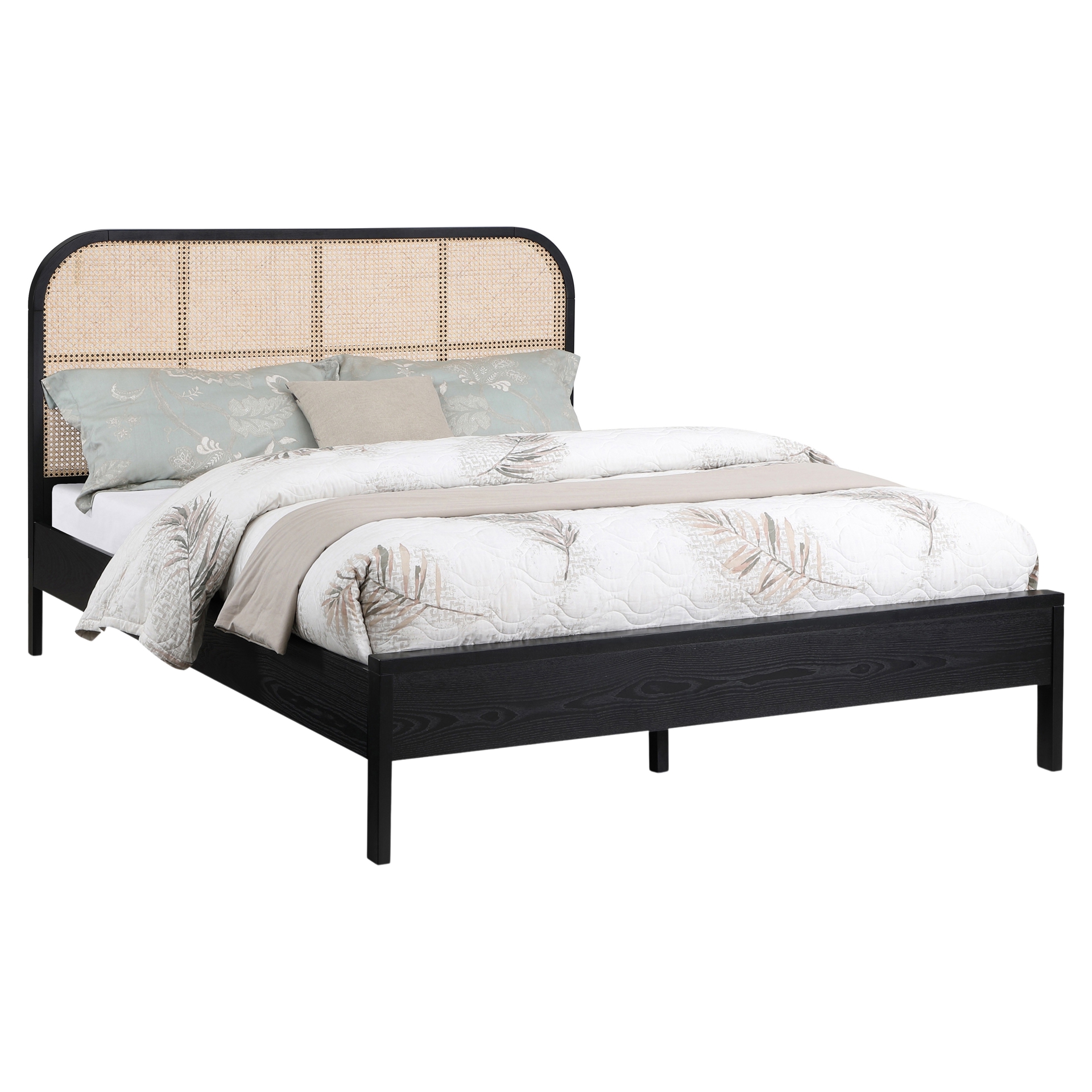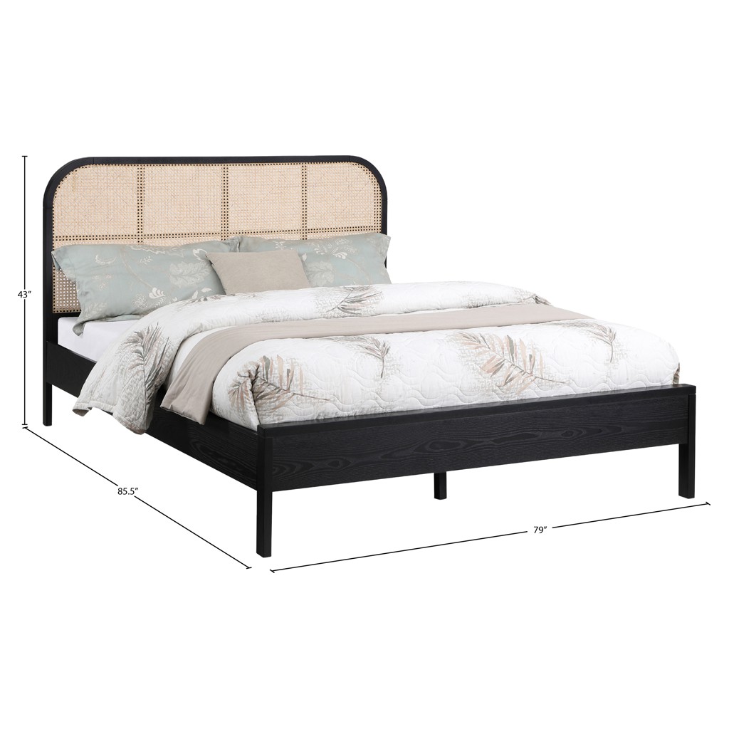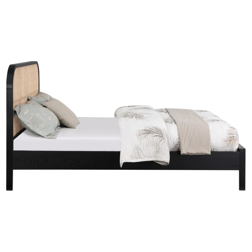 La riche finition noire du placage de frêne lui confère une belle esthétique, tandis que l'insert en canne naturelle sur la tête de lit ajoute un contraste saisissant qui souligne l'élégance et le raffinement du lit.