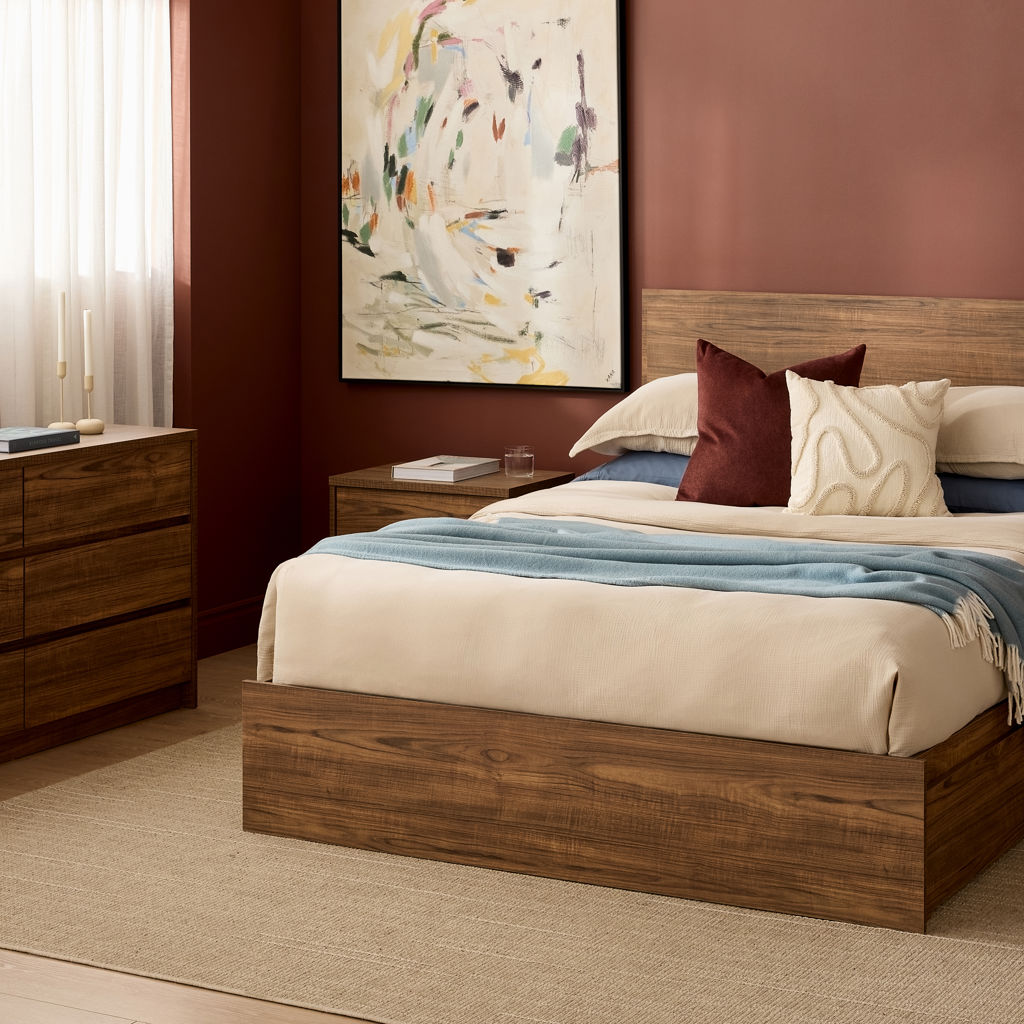 Alliez élégance moderne et fonctionnalité avec ce lit en bois d’ingénierie au design épuré. Ses lignes droites et sa finition chaleureuse s’harmonisent facilement à tout décor de chambre.