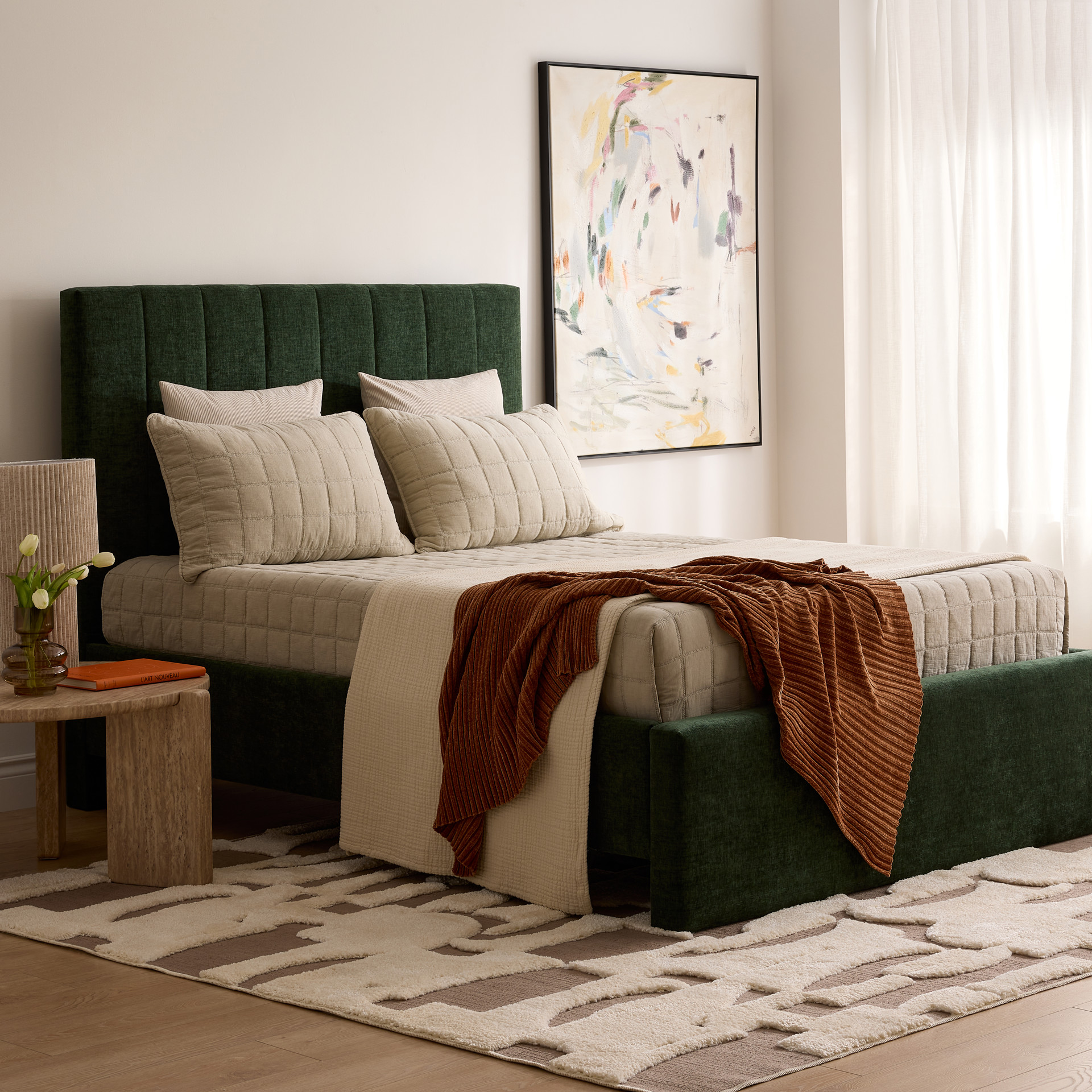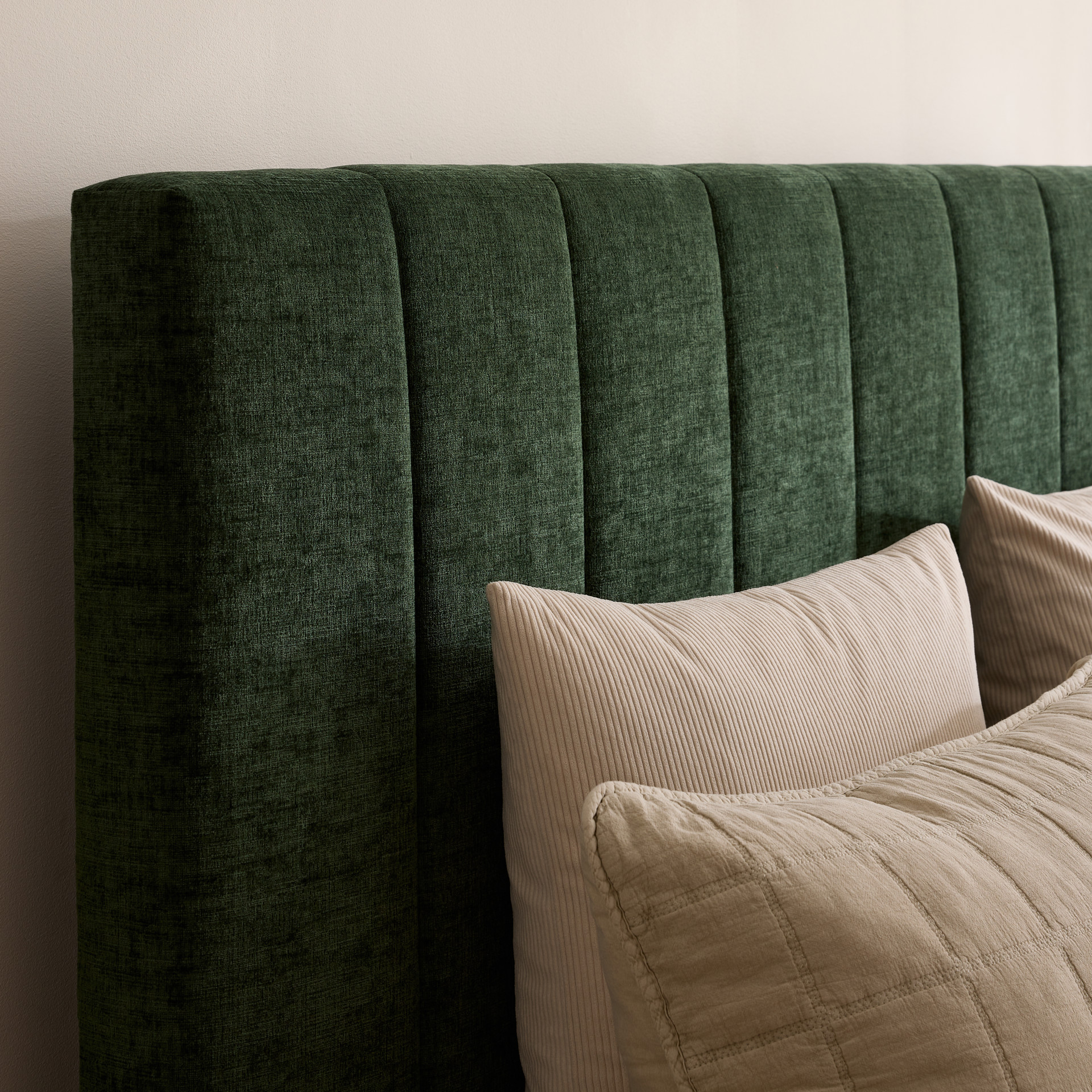 Sa tête de lit capitonnée verticale ajoute une présence raffinée tout en offrant un bon soutien pour s’adosser.