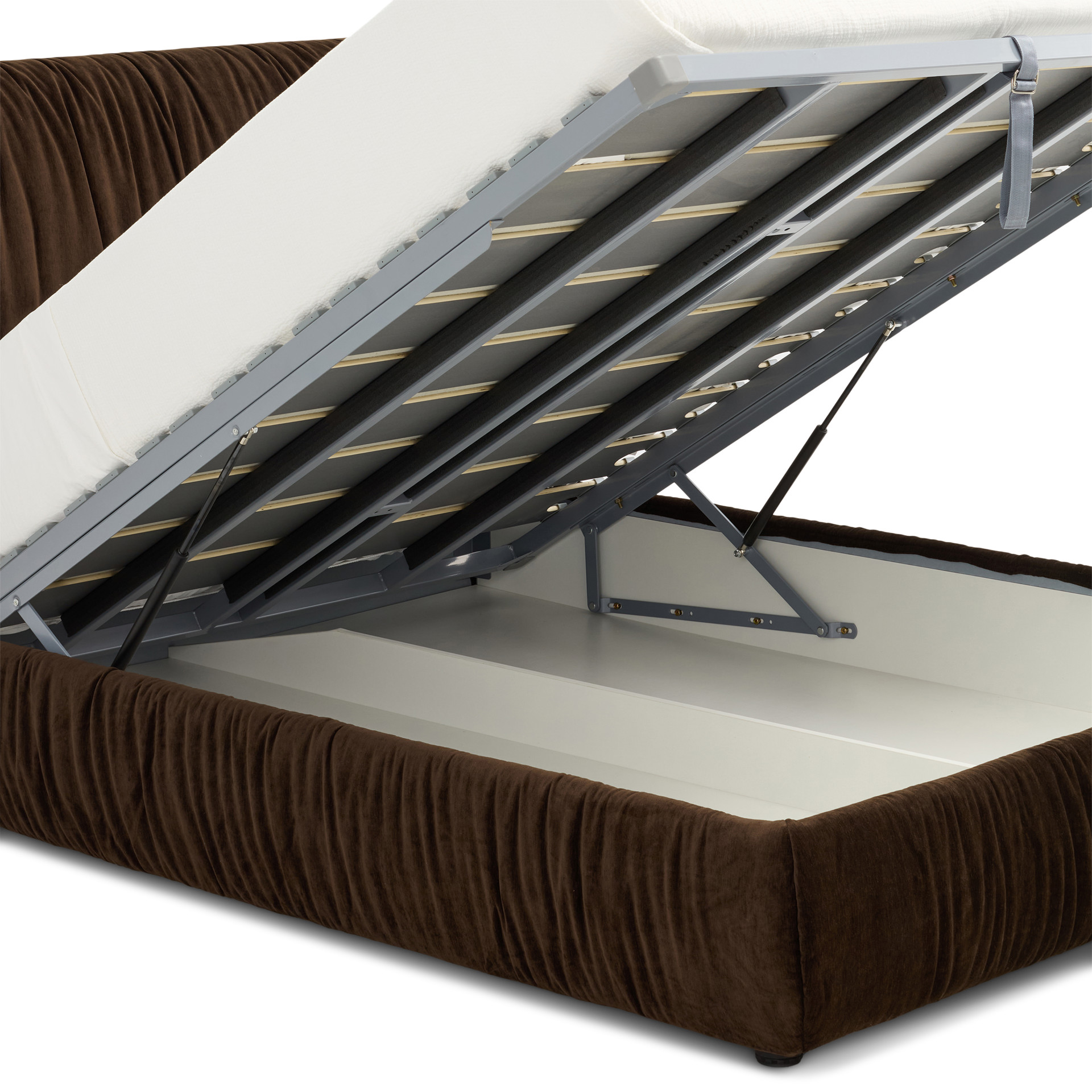 Pratique, ce lit cache un espace de rangement spacieux sous le matelas, accessible grâce à un système hydraulique facile à utiliser.