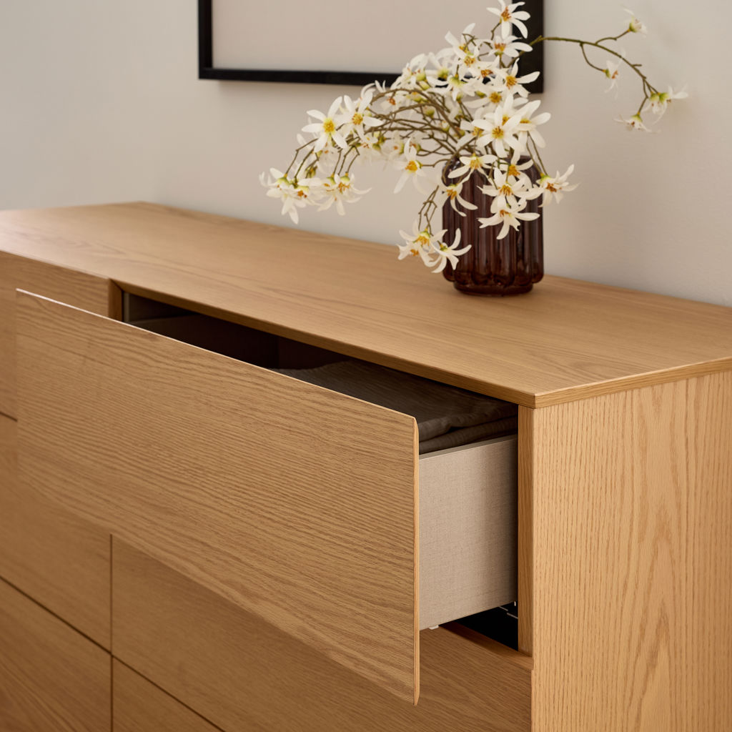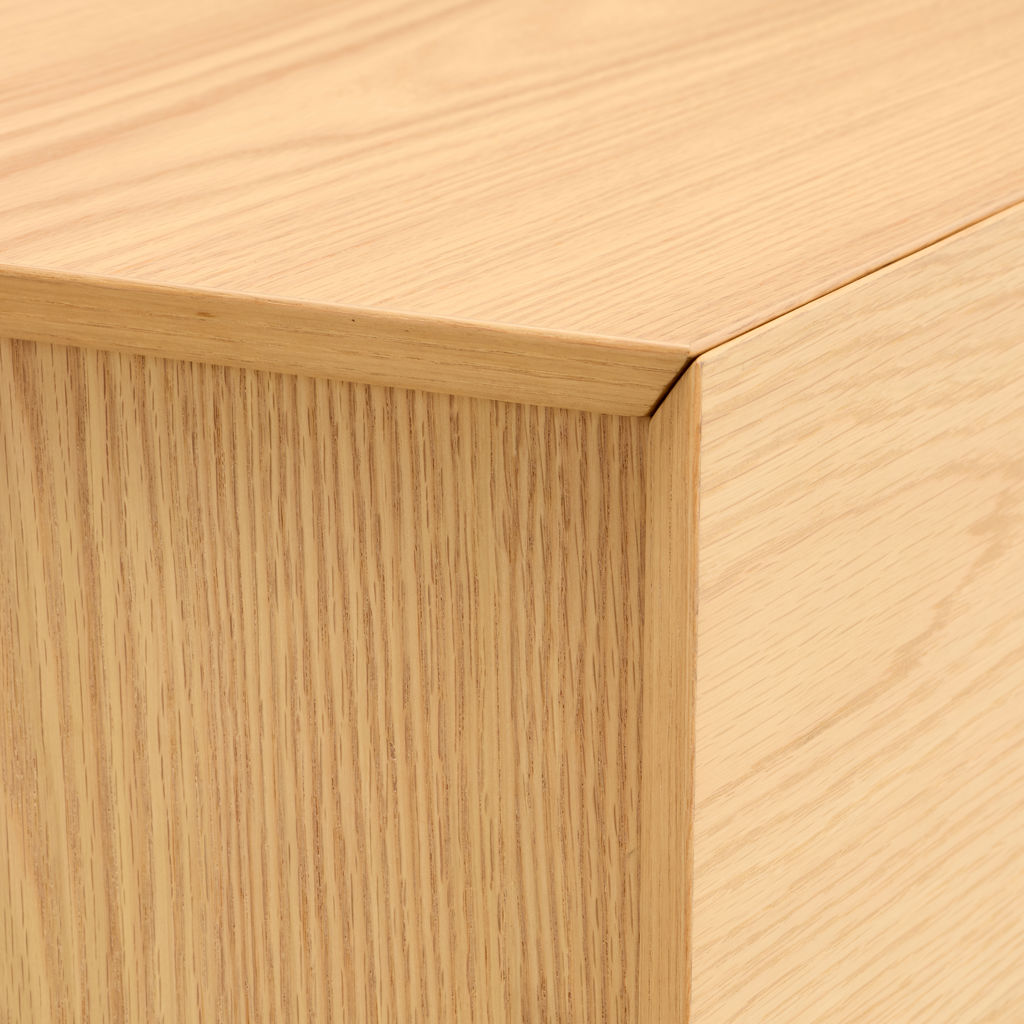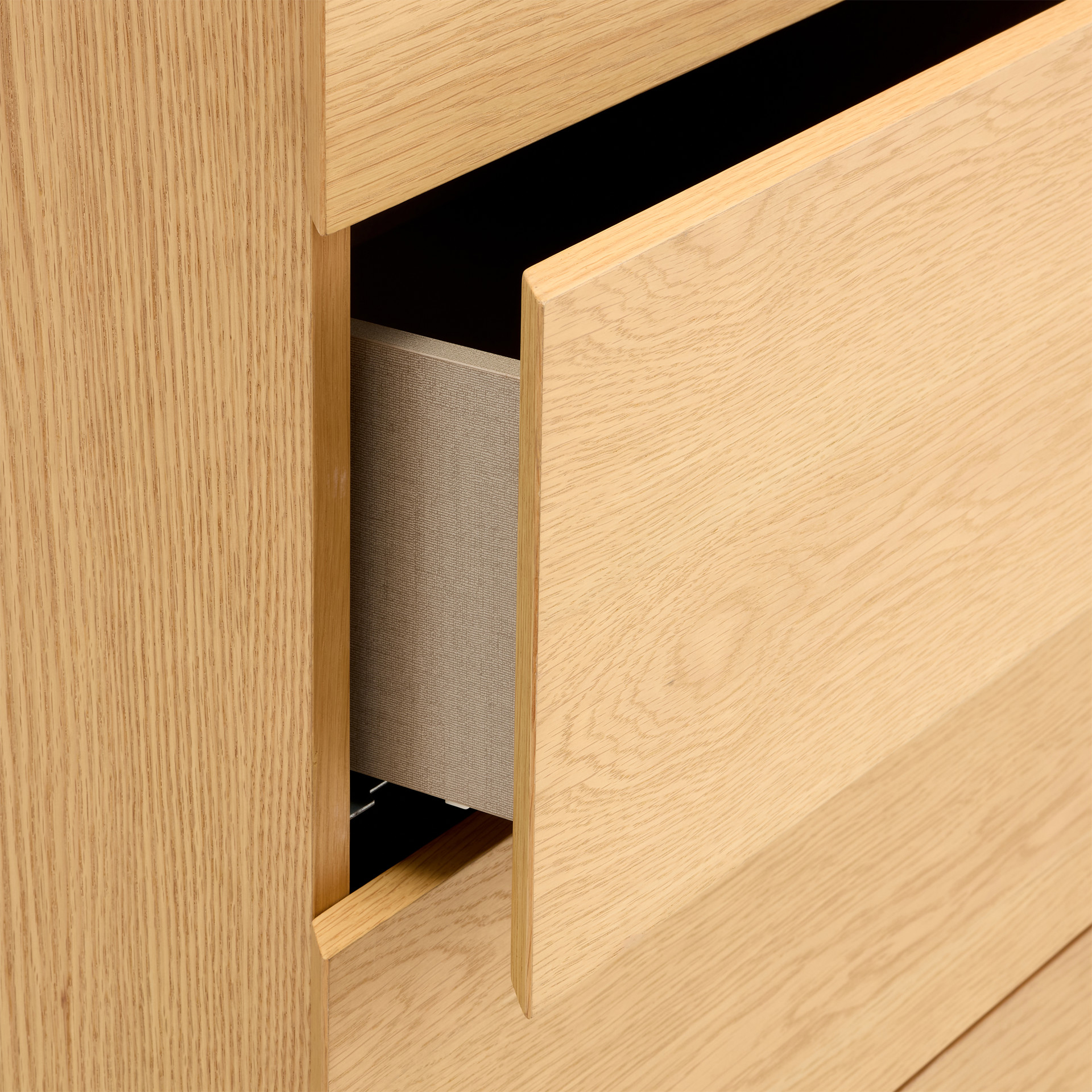 Elle est faite d'un placage de chêne, avec des détails d'angle en onglet. Il n'y a pas de quincaillerie ornementale pour les tiroirs, mais une tirette latérale invisible unique, à la fois fonctionnelle et tactile.