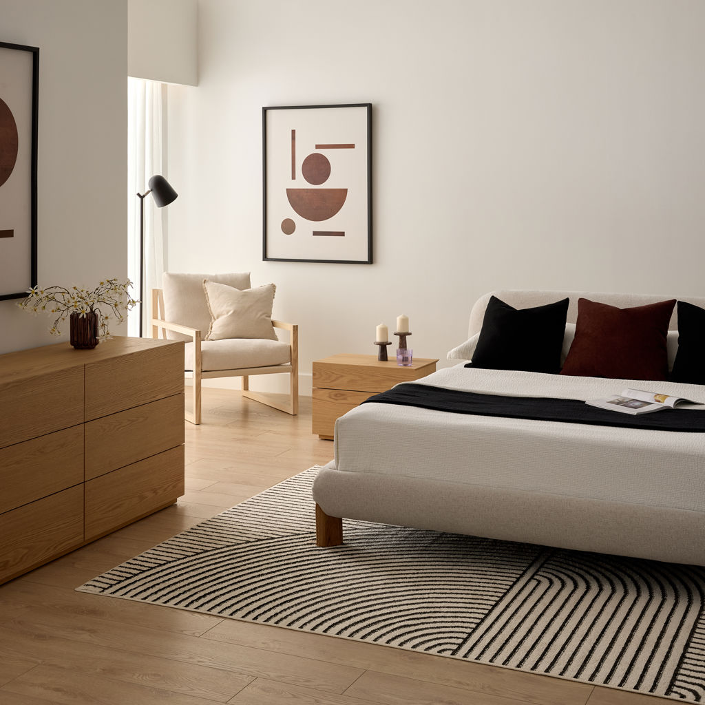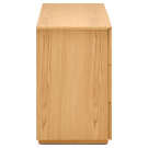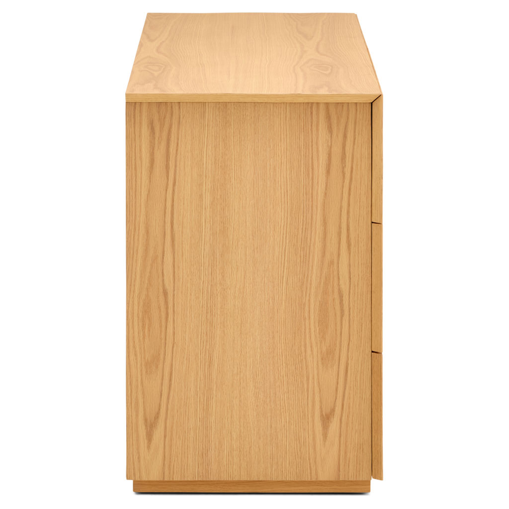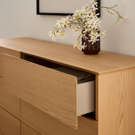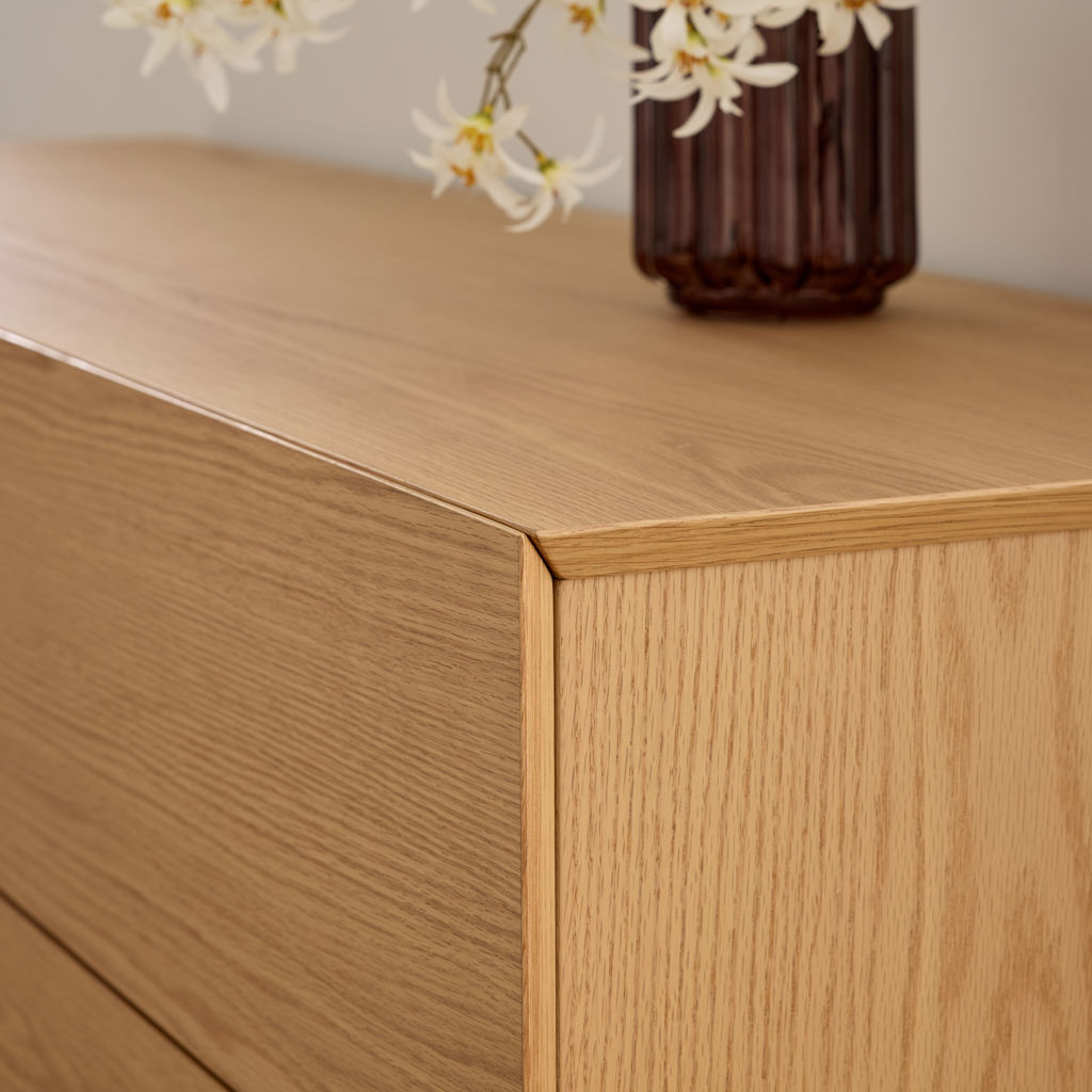Elle est faite d'un placage de chêne, avec des détails d'angle en onglet. Il n'y a pas de quincaillerie ornementale pour les tiroirs, mais une tirette latérale invisible unique, à la fois fonctionnelle et tactile.