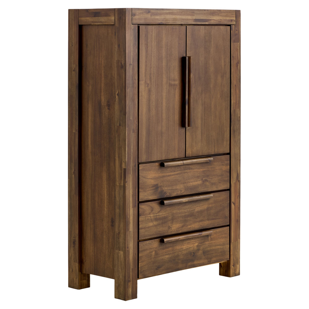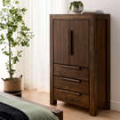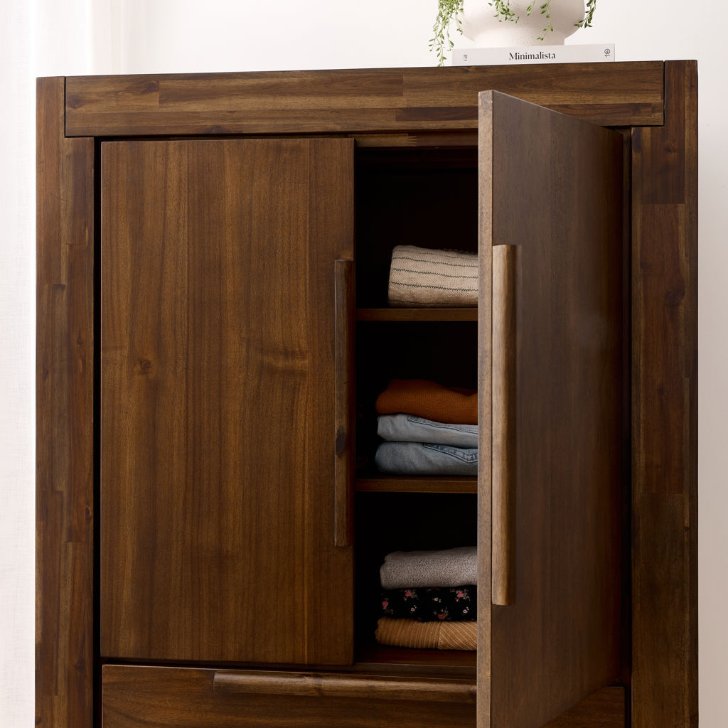 Profitez d'un rangement généreux avec ses deux portes battantes révélant des étagères spacieuses, parfaites pour vos vêtements. Les trois tiroirs inférieurs offrent un espace supplémentaire pour organiser vos essentiels en toute discrétion.