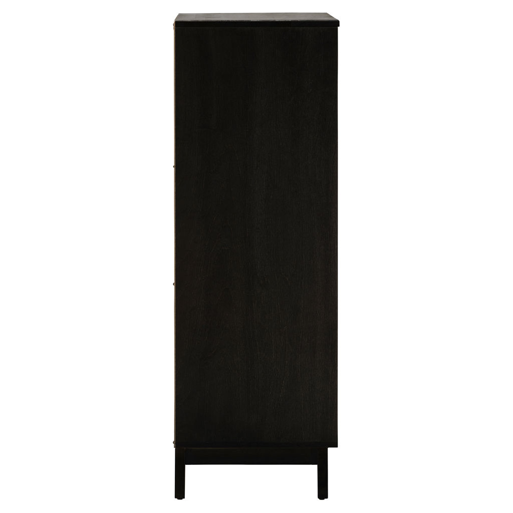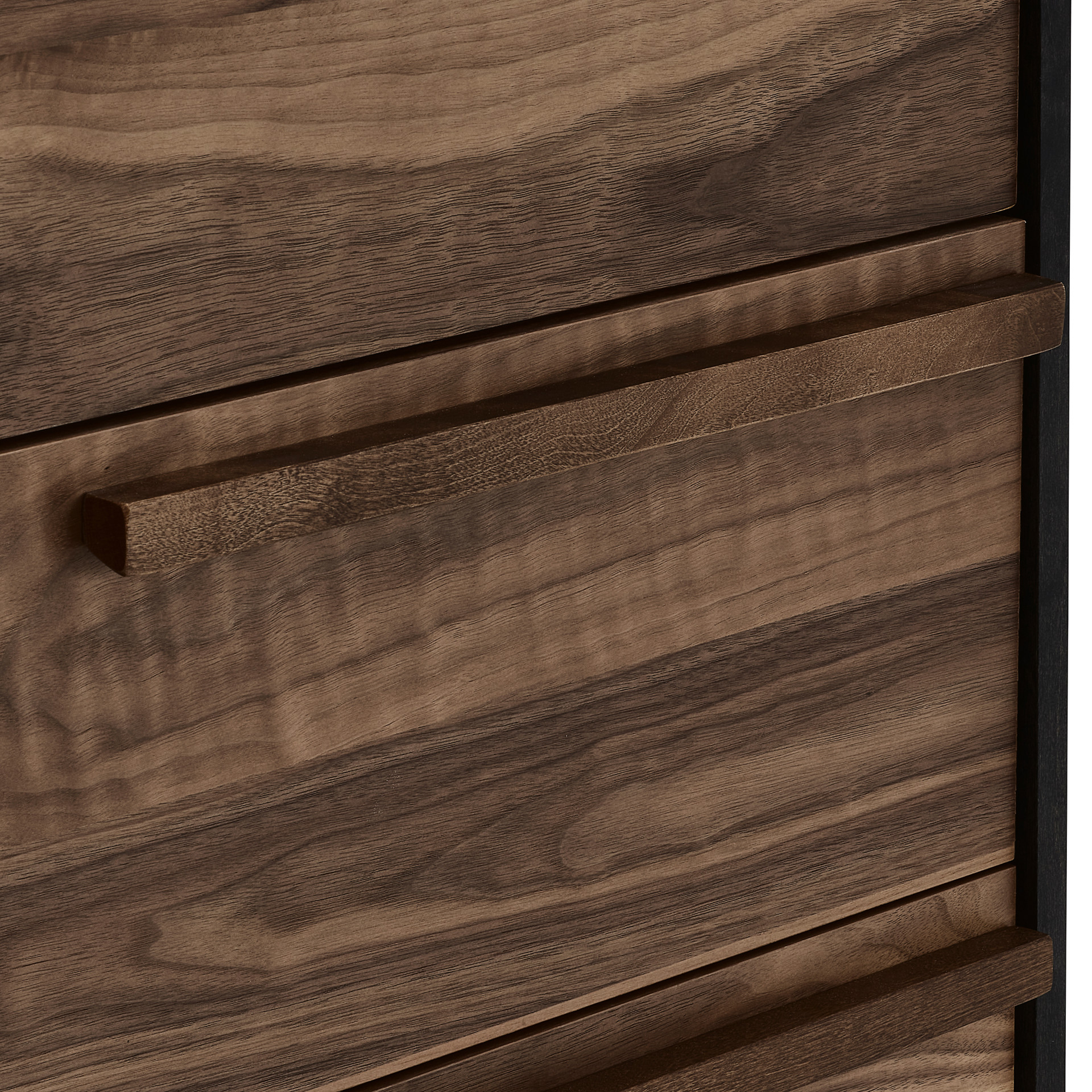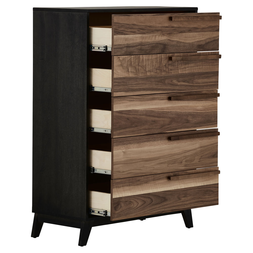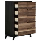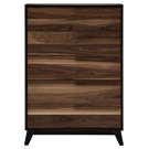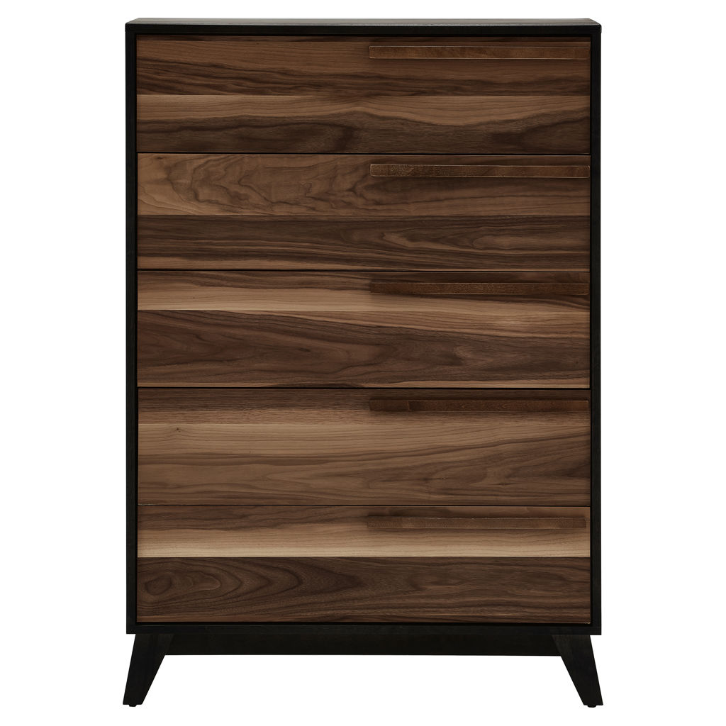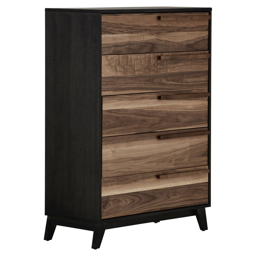 Cette commode en bois allie élégance naturelle et praticité au quotidien. Ses cinq tiroirs spacieux offrent un rangement généreux pour vos vêtements et accessoires, tandis que les façades en bois véritable créent un contraste chaleureux et sophistiqué avec la structure sombre.