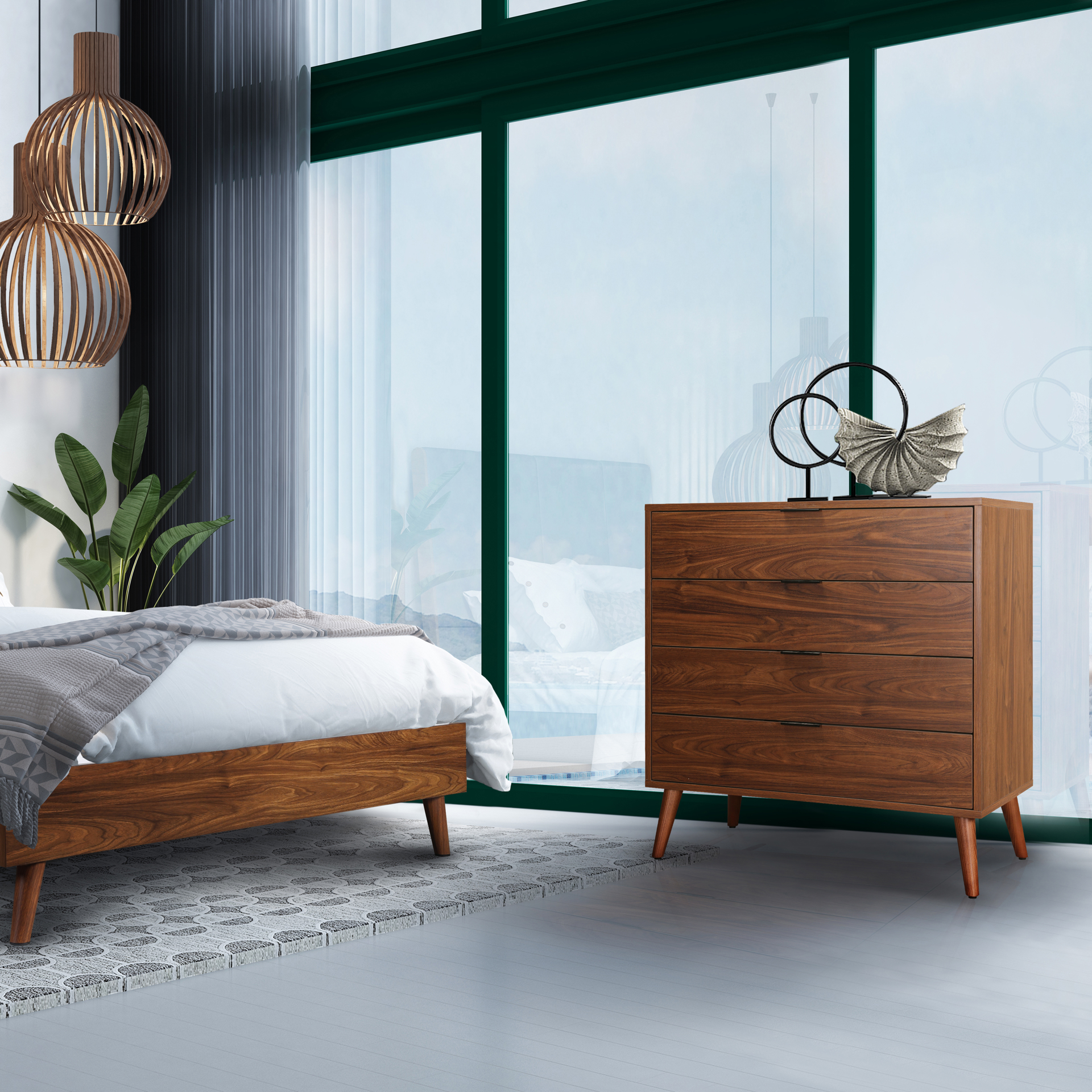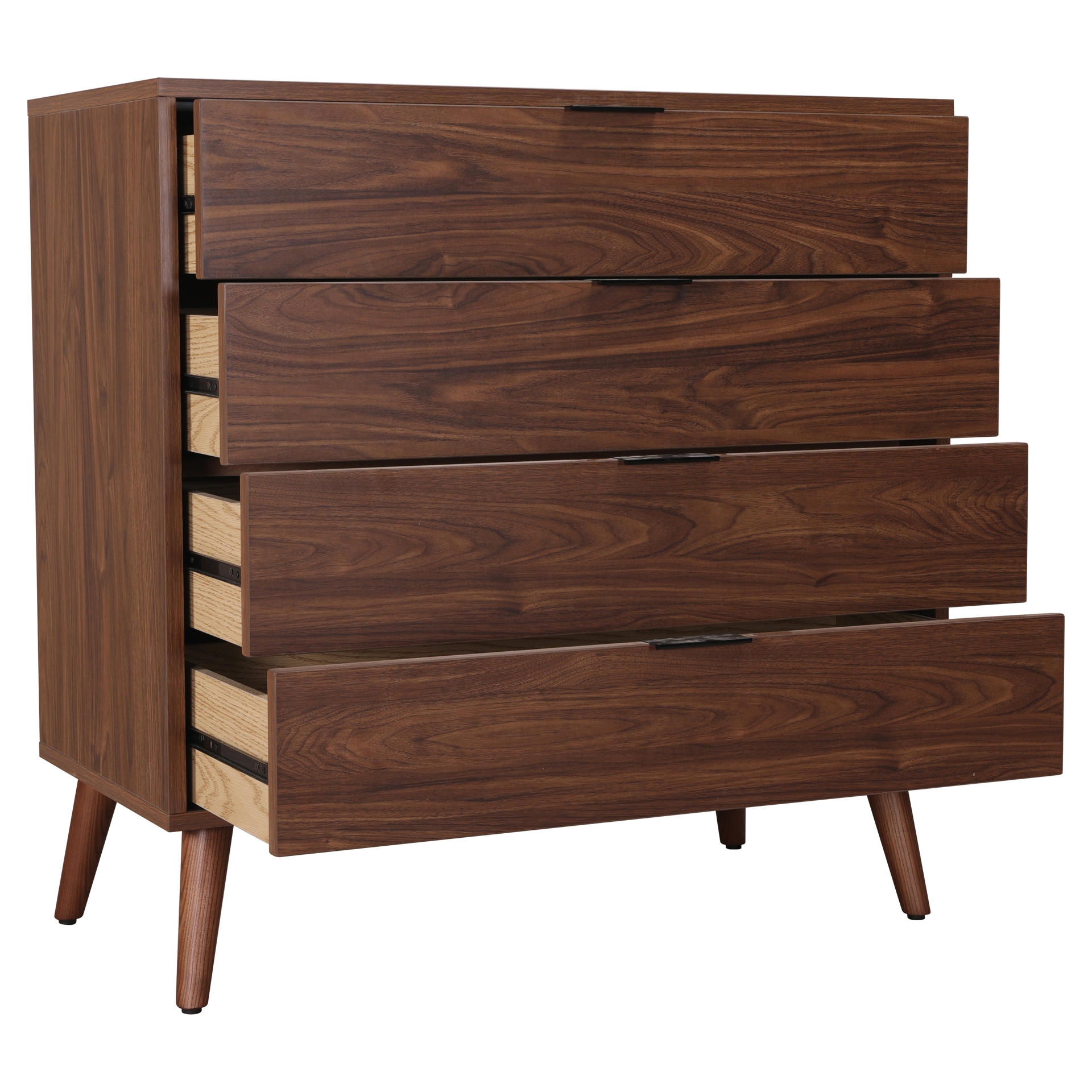 Ses quatre tiroirs spacieux offrent un rangement généreux pour vos vêtements et effets personnels, tandis que leurs poignées discrètes et intégrées préservent des lignes épurées. Les tiroirs glissent en douceur grâce à un système de coulisses robuste, facilitant l'accès au quotidien.