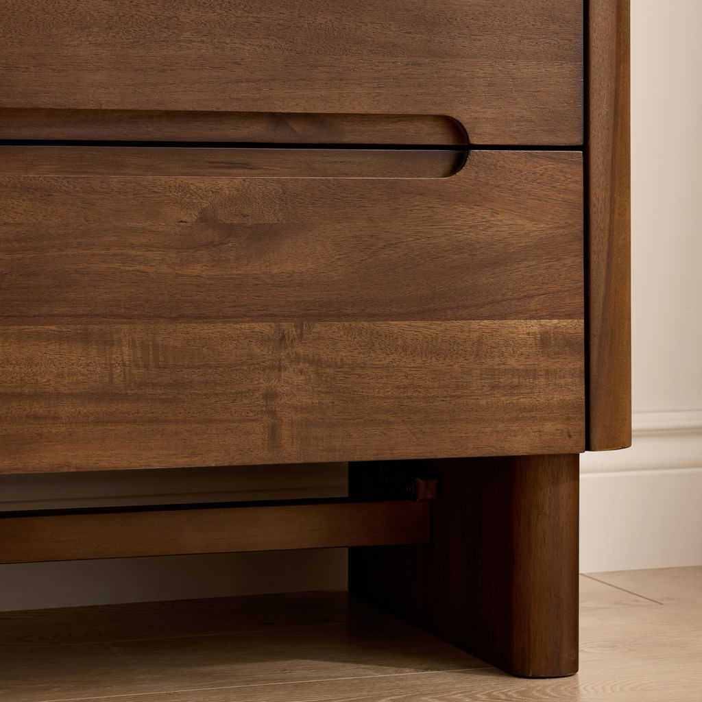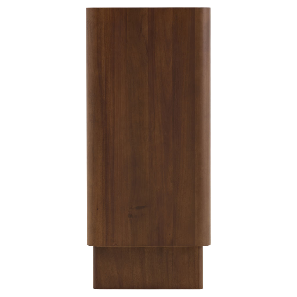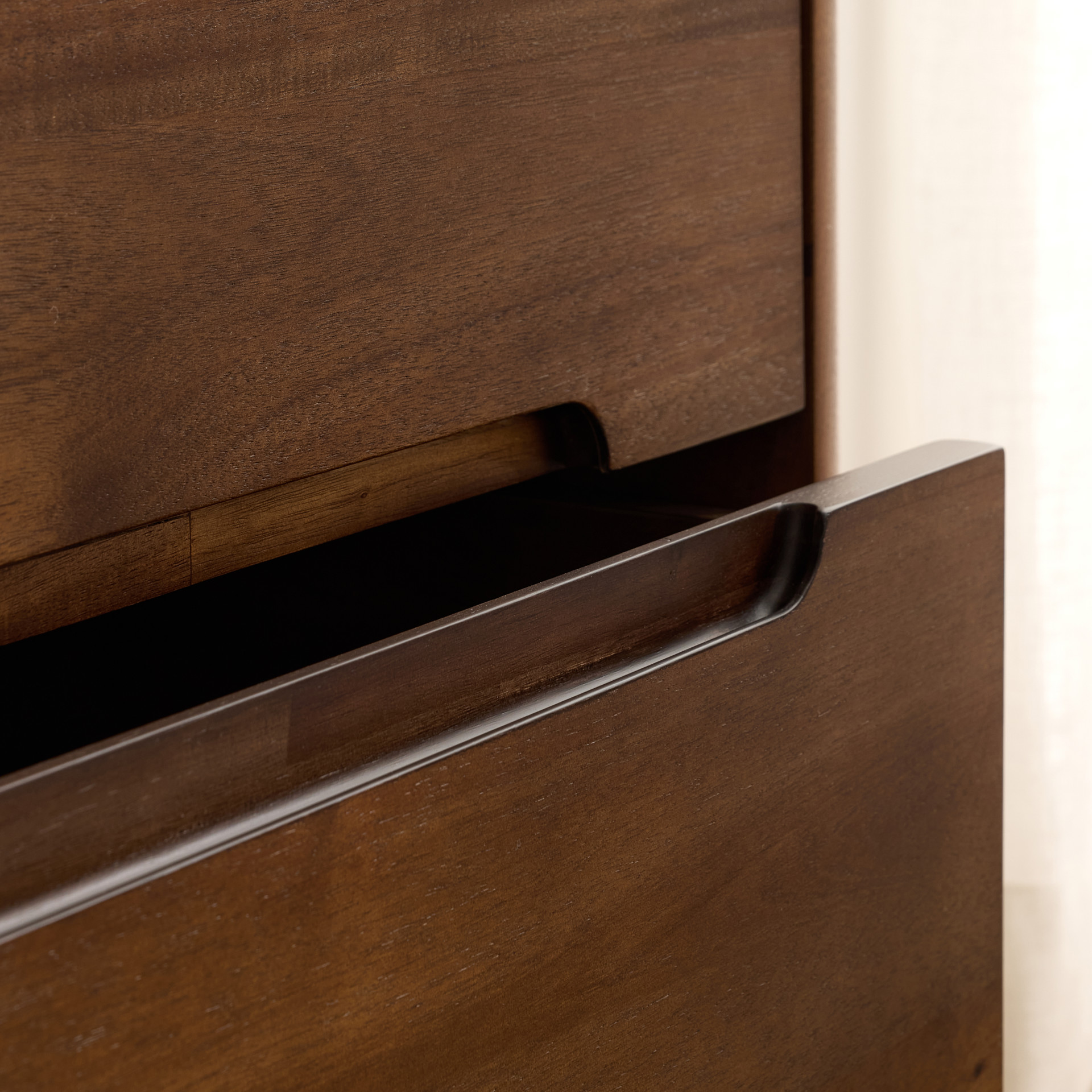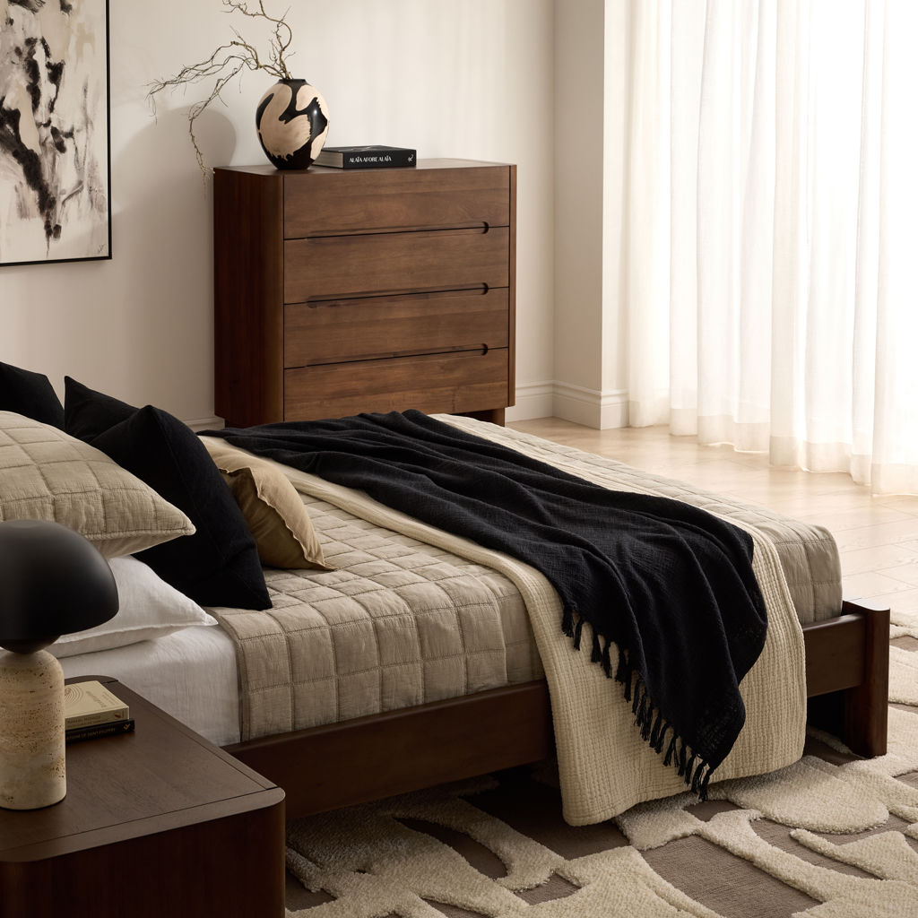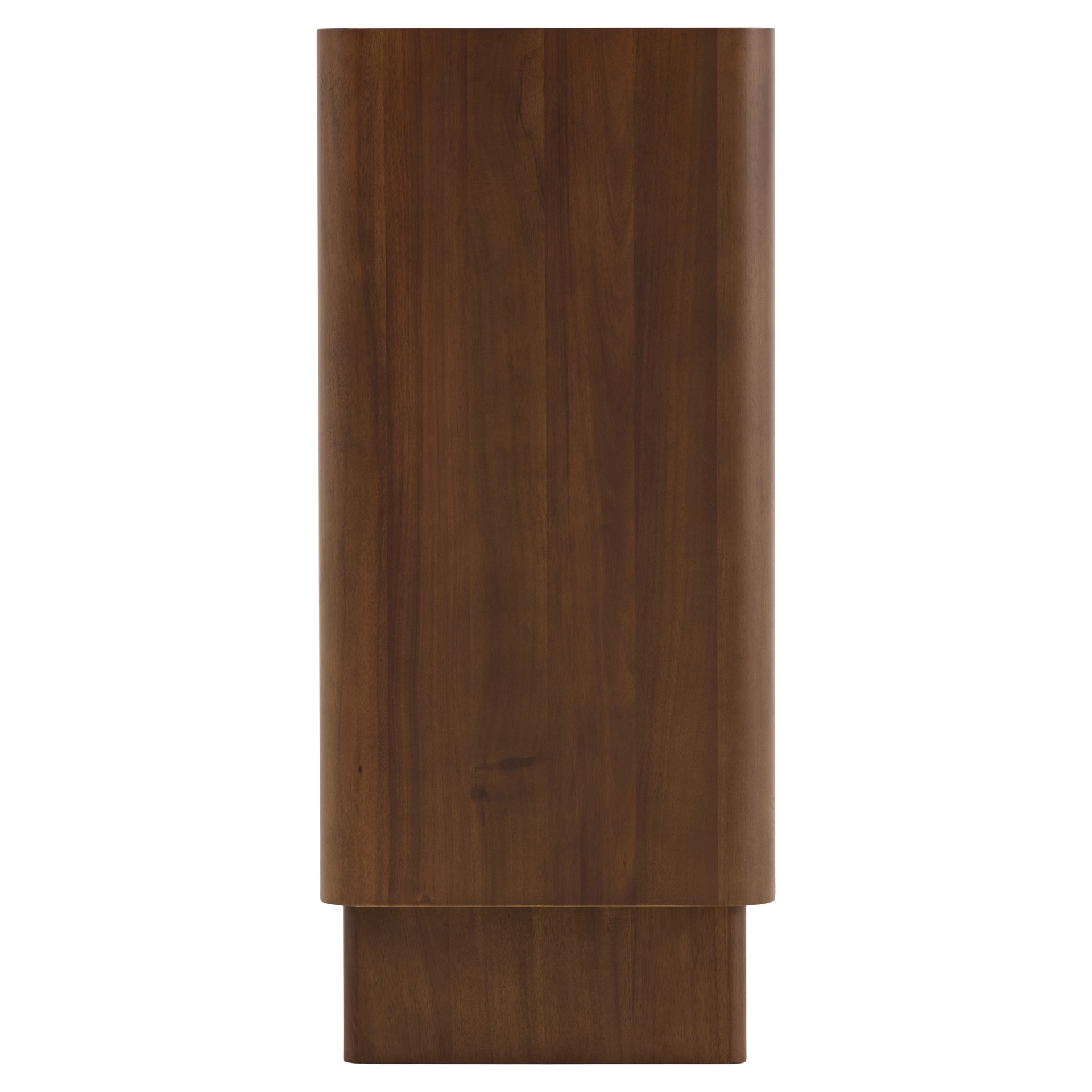 Cette commode haute combine style chaleureux et fonctionnalité pour optimiser le rangement dans votre chambre.