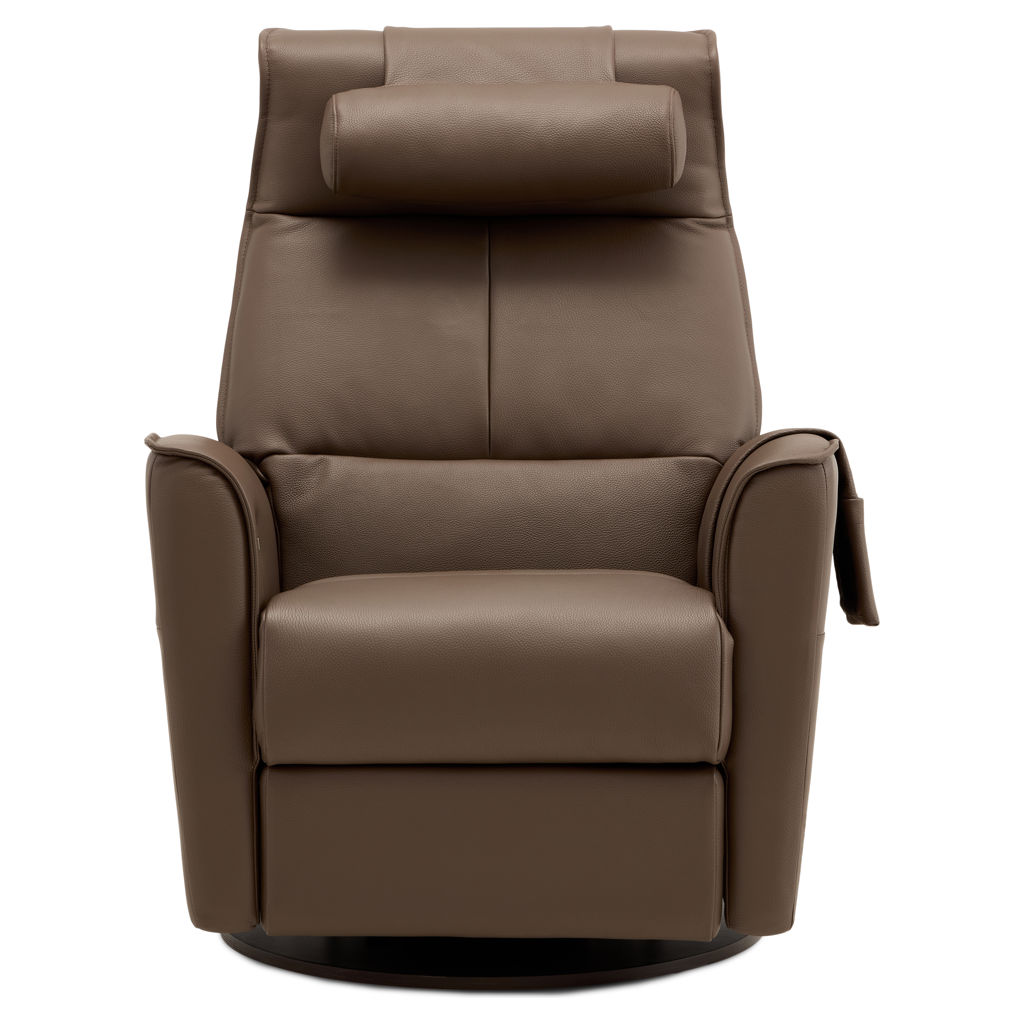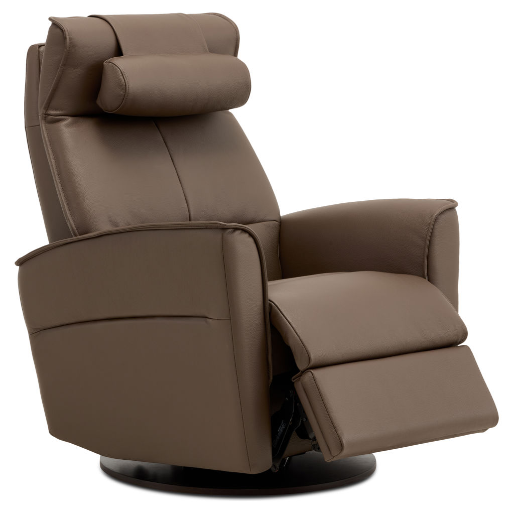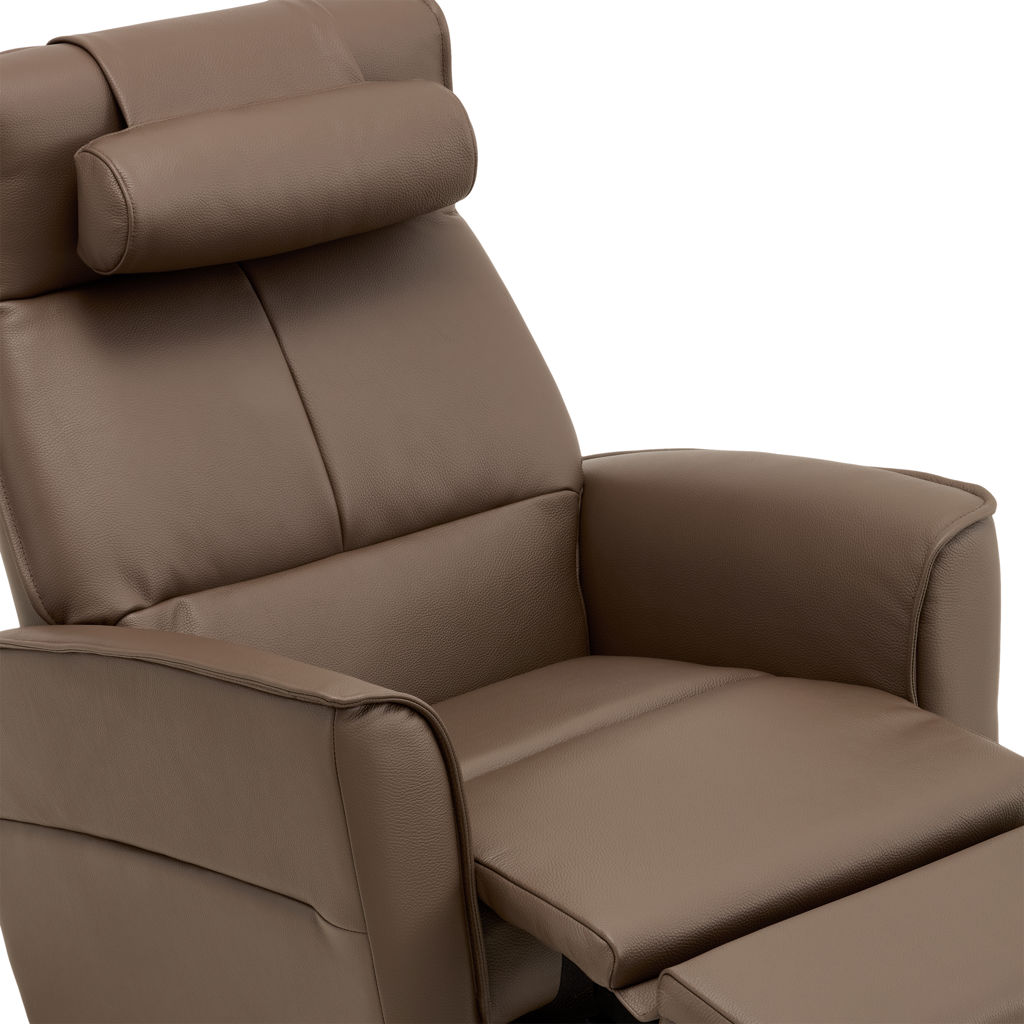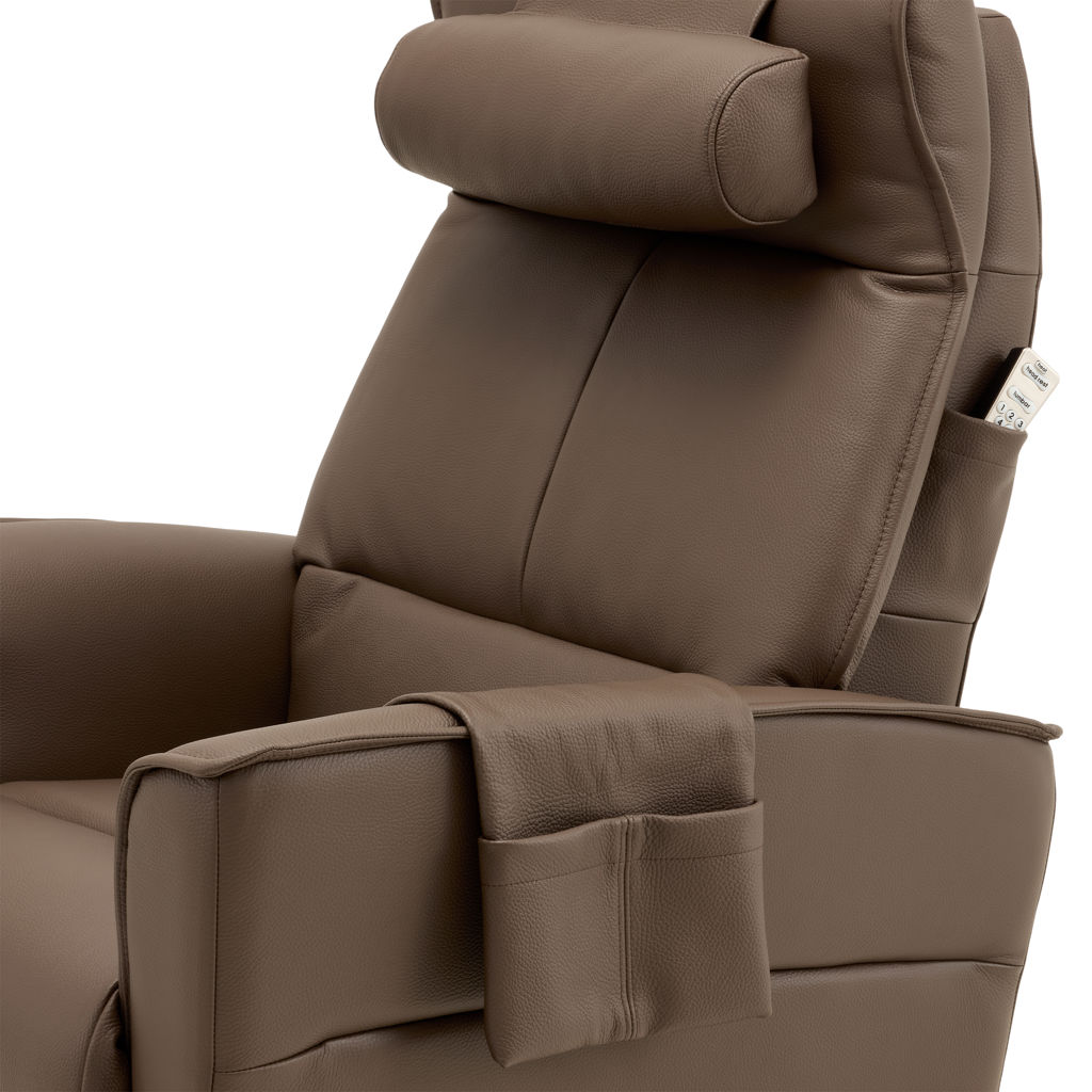 Fauteuil berçant, pivotant et inclinable doté d'un système à massage en 4 zones avec 3 modes différents ainsi que dos chauffant avec une intensité de chaleur et support lombaire. Télécommande sans fil inclus qui contrôle le système à massage ainsi que l'appui-tête électrique. Repose-pied pleine jambe et inclinable motorisé contrôlé par un bouton poussoir incluant un port USB. Coussin rondin pour appui-tête inclus.