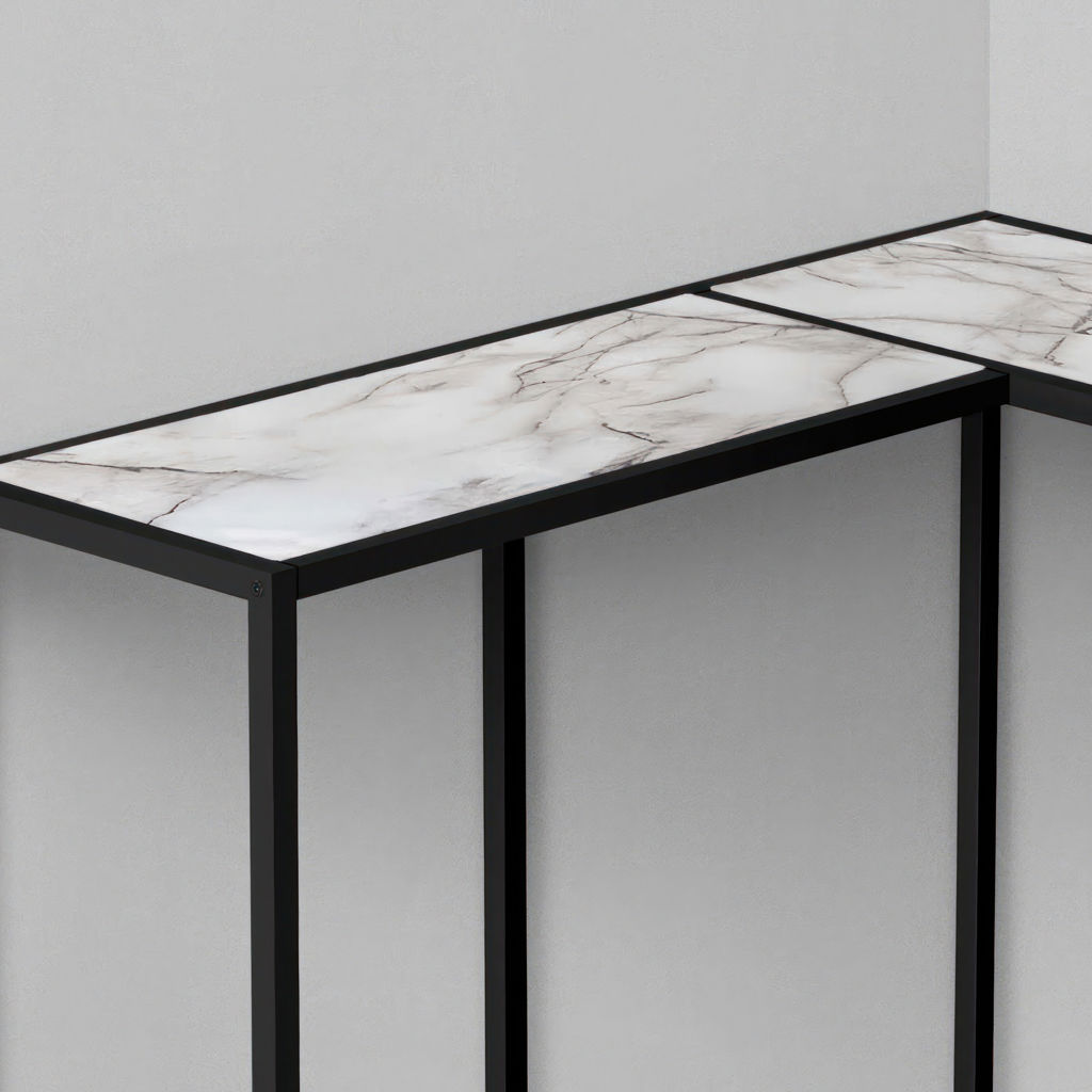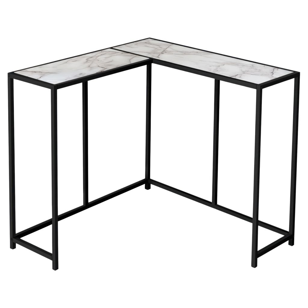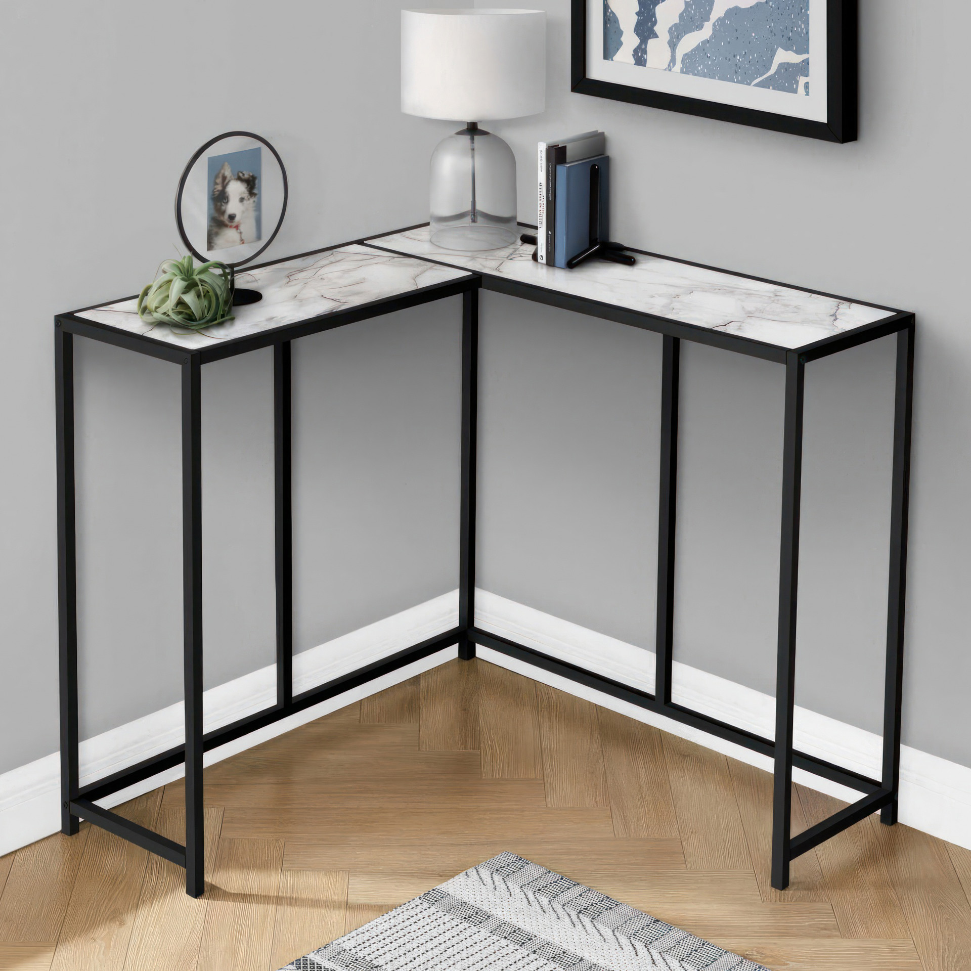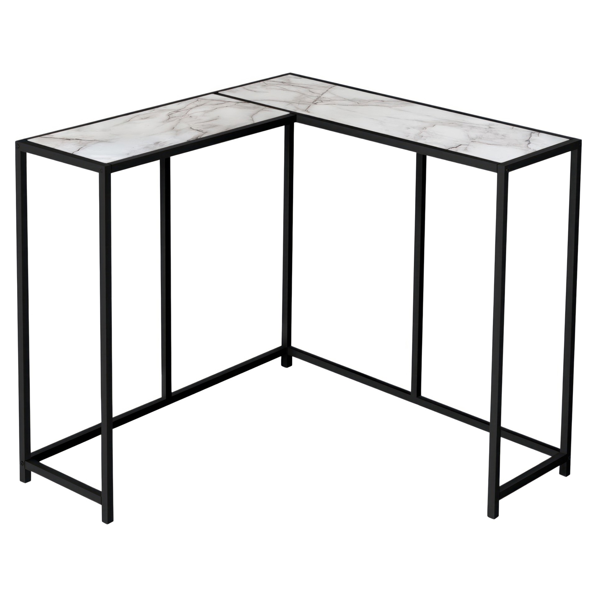 Sa conception en forme de L prend moins de place que les tables de coin de forme triangulaire, ce qui en fait un choix idéal pour les petites salons. Le dessus de table en stratifié fini faux marbre blanc offrent de grandes surfaces pour exposer des objets décoratifs.