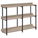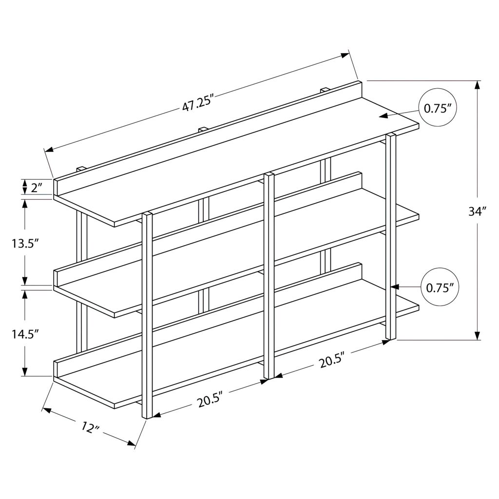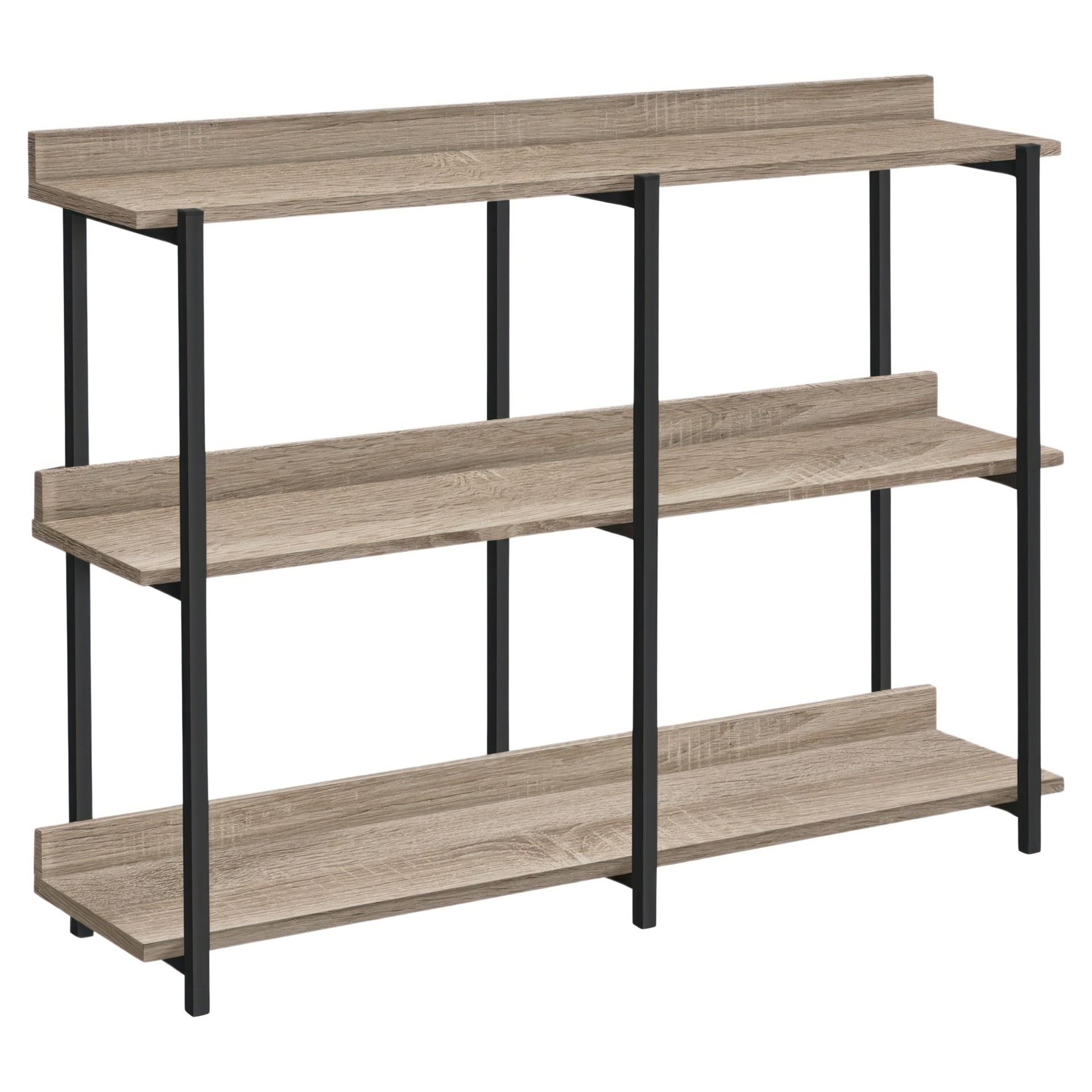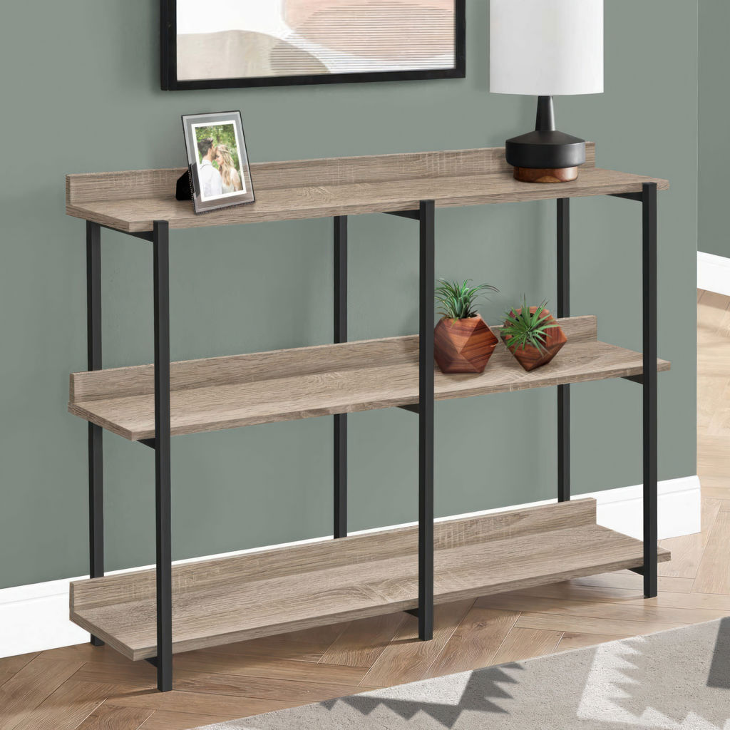 Afficher fièrement votre décoration sur cette table console rectangulaire avec des étagères à 3 niveaux. Sous le long et étroit dessus de table, trouvez des étagères ouvertes sur 2 niveaux. Placez des livres, des plantes et des objets de décoration entre le dessus et les étagères finies en faux bois taupe foncé .