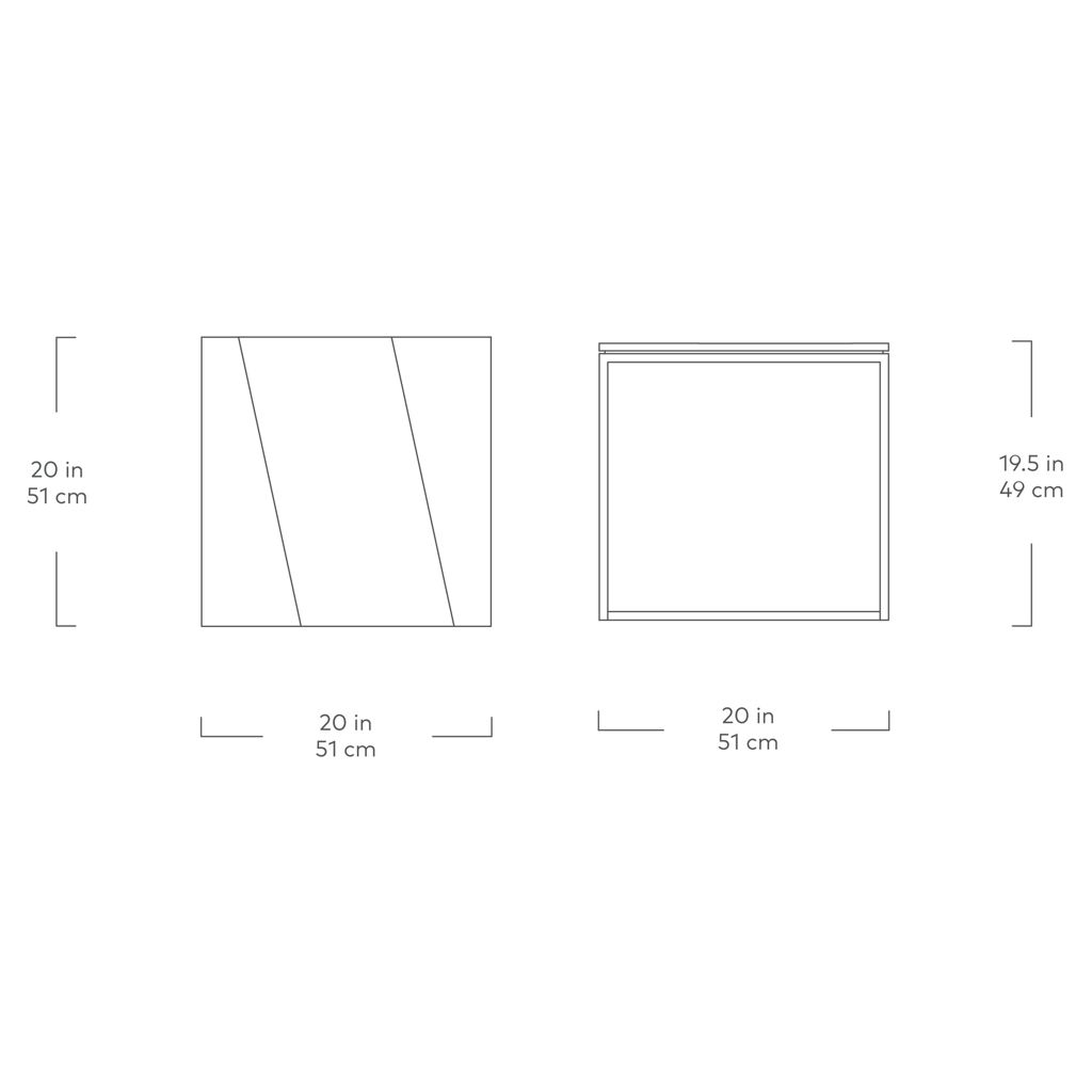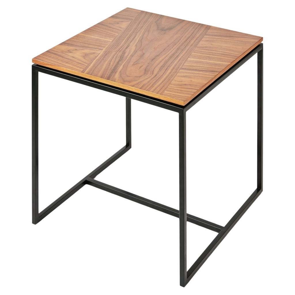 La table de bout Tobias est une pièce d'accent minimaliste et géométrique bien adaptée aux espaces modernes. Le plateau carré présente un agencement dynamique de panneaux en grain de bois de noyer, qui reposent sur une base en acier mince et solide. Une révélation subtile le long du bord de la table crée l'illusion d'un plateau flottant.