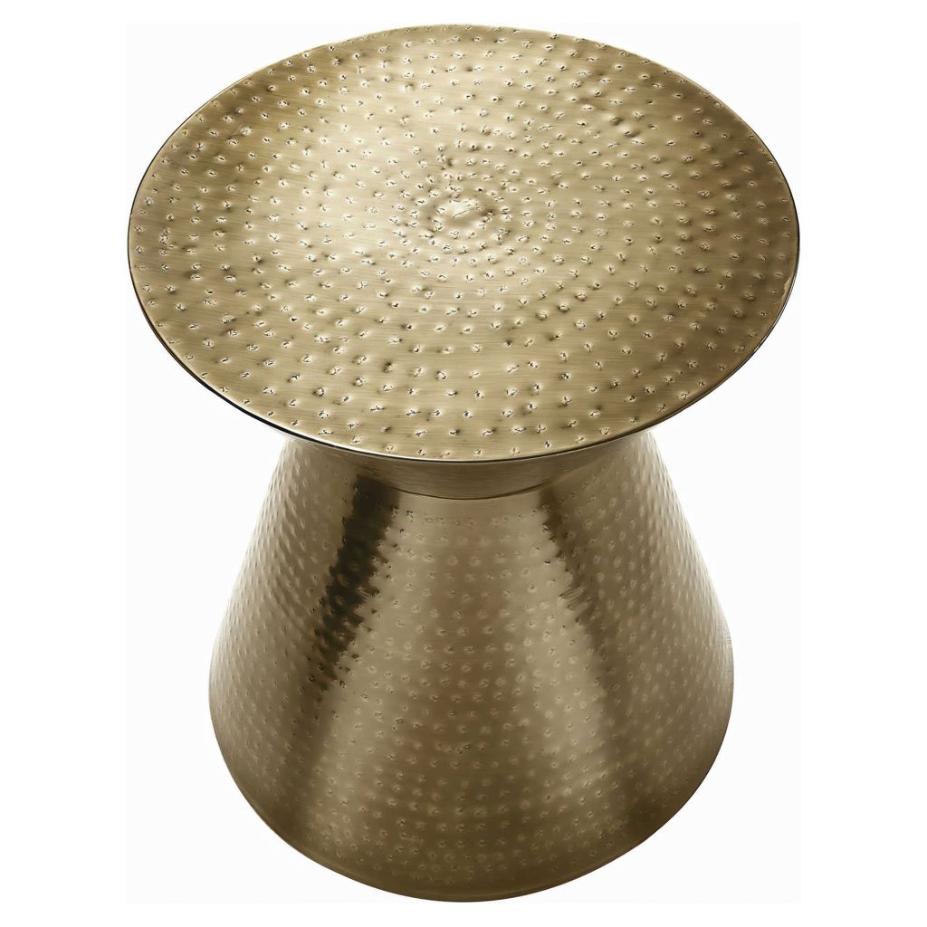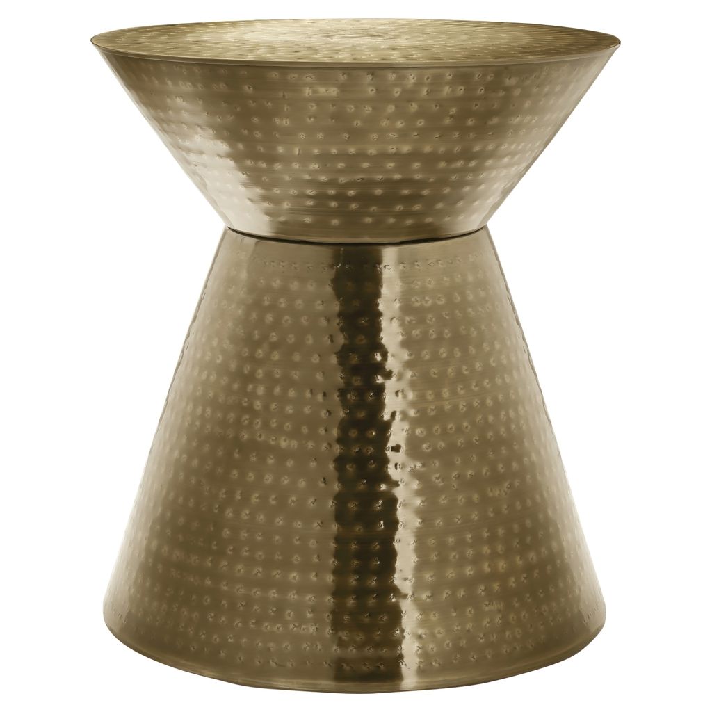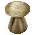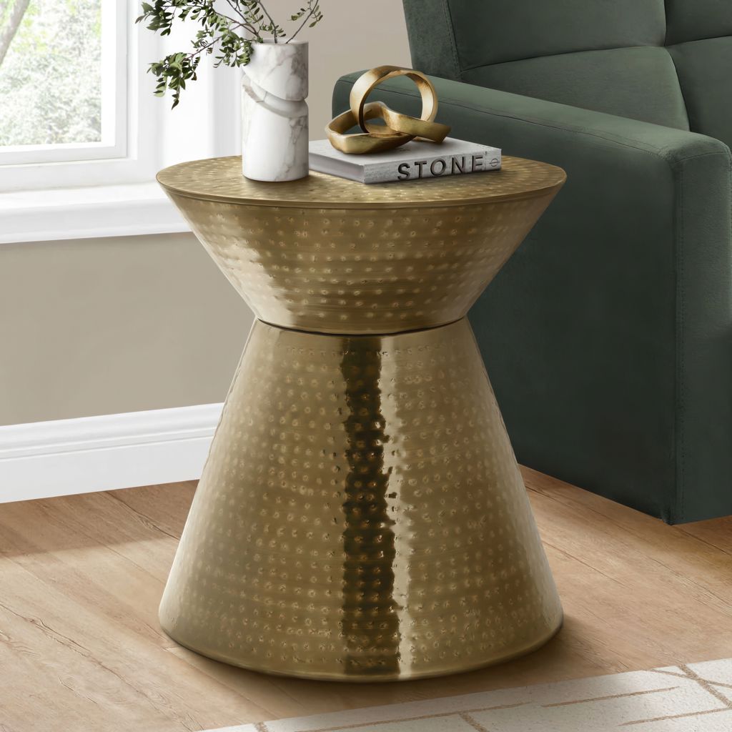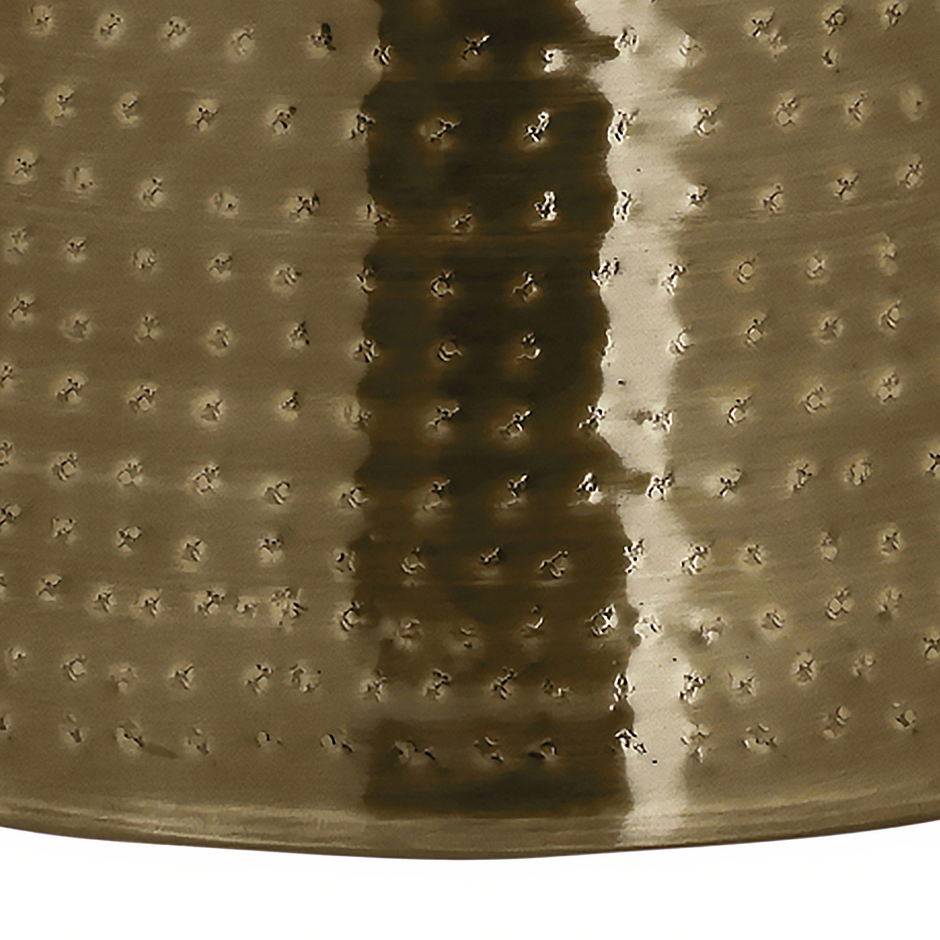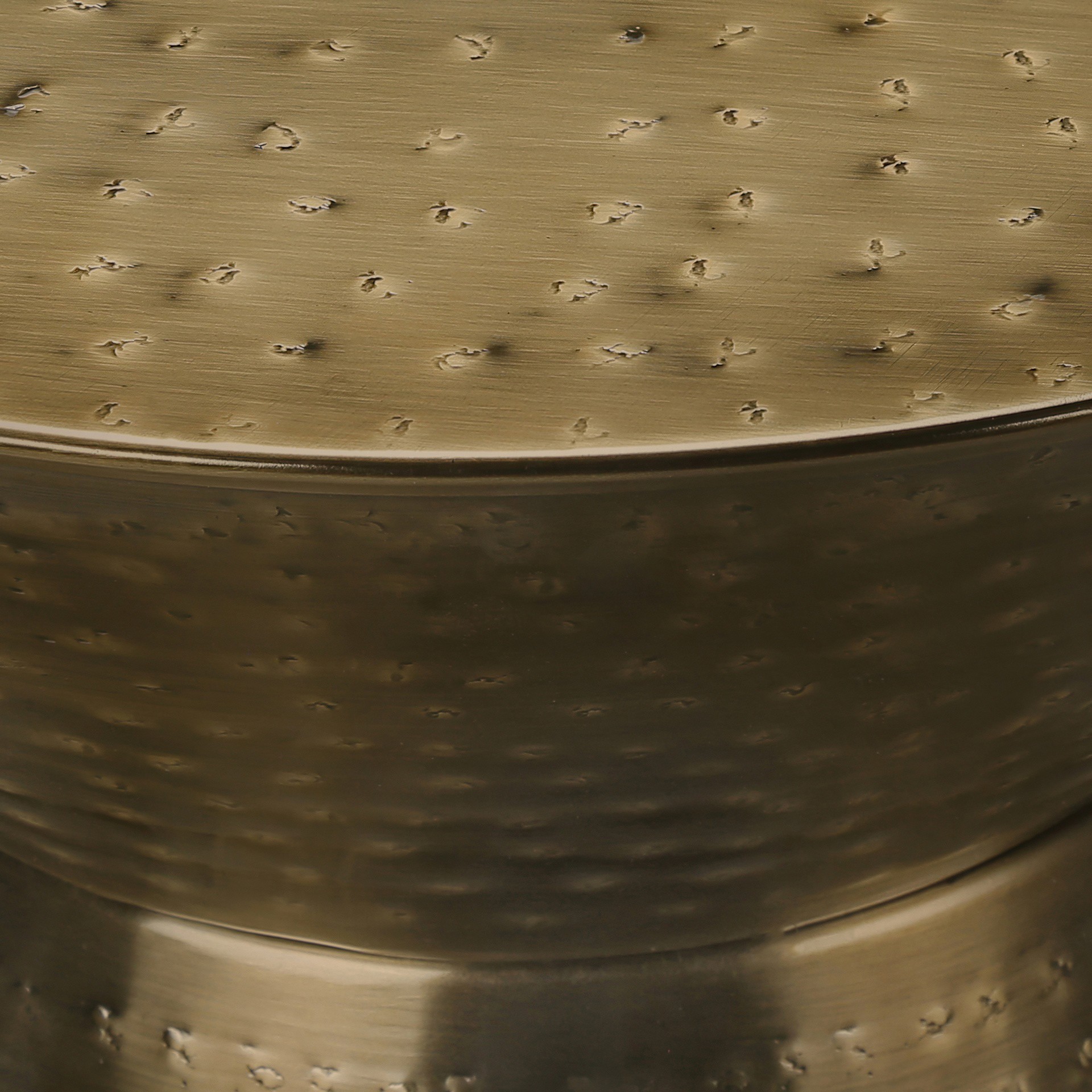 Cette table tambour en métal de couleur dorée, à la mode et peu encombrante, avec une texture martelée sur toutes les faces, est aussi pratique comme une table d'appoint ou d'extrémité dans un salon, ainsi qu'une table de nuit pour un look glamour sophistiqué dans une chambre.