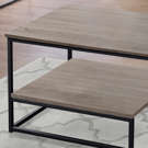 La finition bois chaleureux se marie harmonieusement avec la structure métallique noire, créant un contraste sophistiqué qui s'intègre facilement à tout décor. Le design ingénieux de la table basse, avec son plateau inférieur supplémentaire, maximise l'espace de rangement tout en conservant une silhouette épurée.