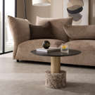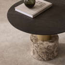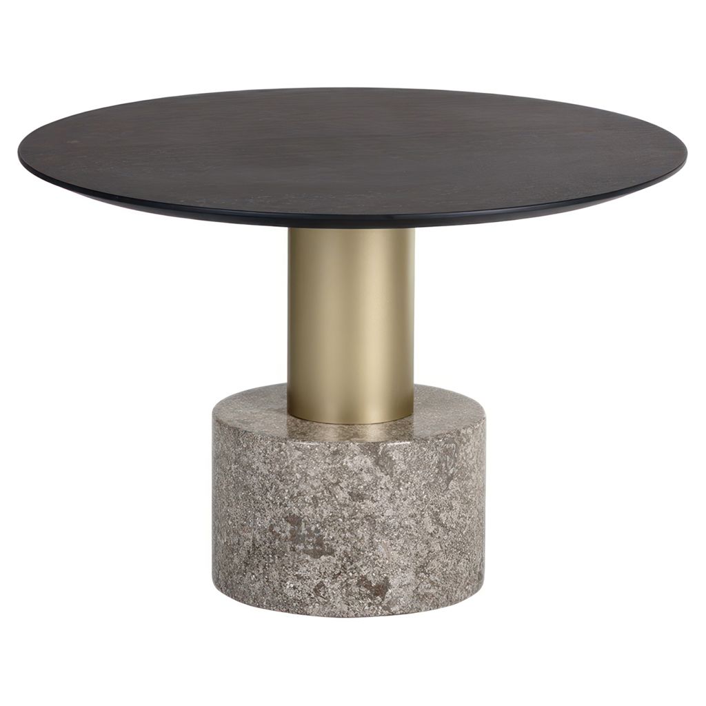 La structure en métal doré apporte une touche de raffinement contemporain, tandis que la base en pierre naturelle assure une stabilité parfaite et une présence sculpturale unique. Chaque veine de la pierre raconte une histoire, faisant de chaque table une œuvre singulière.
