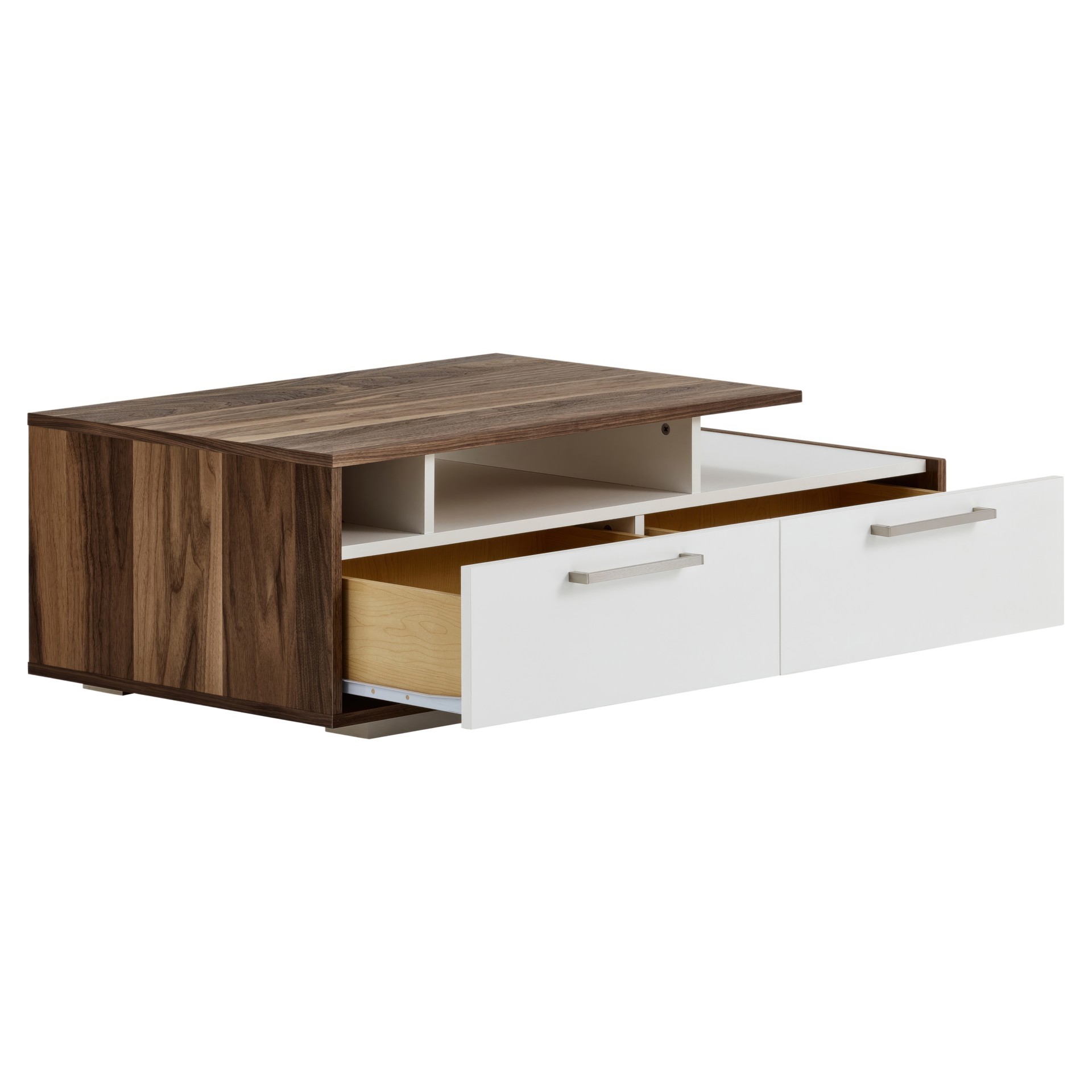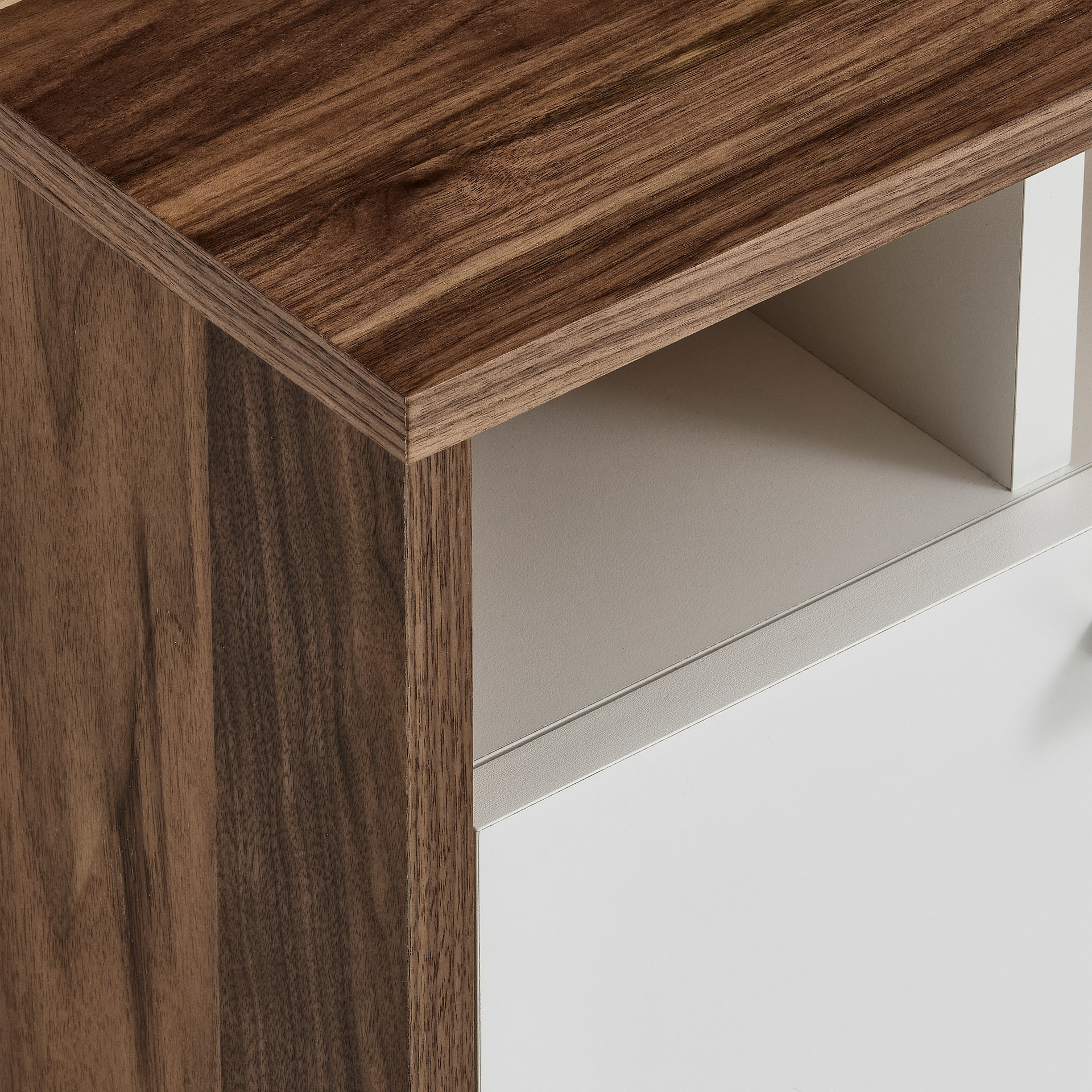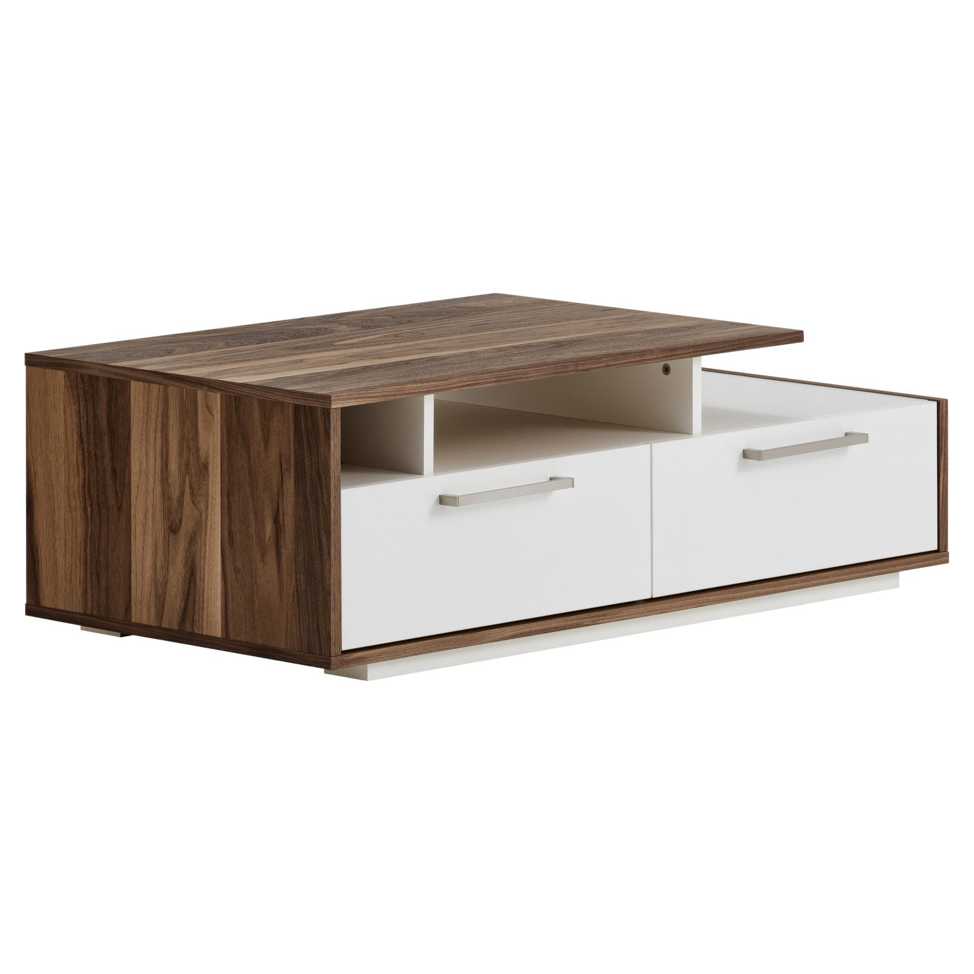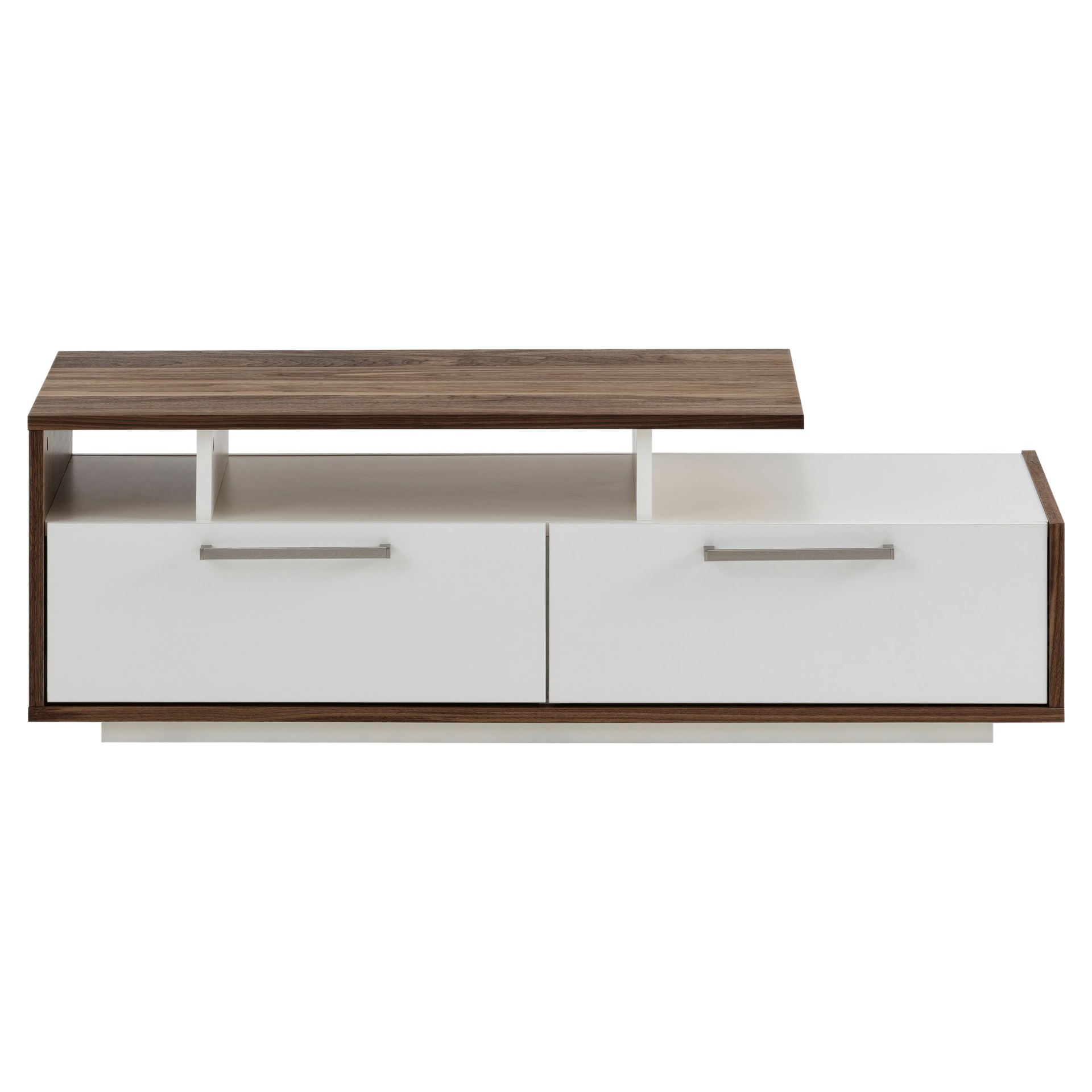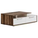 Les deux tiroirs spacieux vous permettent de ranger télécommandes, magazines et petits objets du quotidien, tandis que les compartiments ouverts accueillent vos livres préférés ou objets décoratifs. La finition bicolore crée un contraste saisissant qui s'harmonise avec tous les décors.