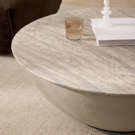 Voici la table basse Eave, où l'élégance rencontre le design moderne. Avec son superbe plateau en marbre travertin gris argenté, cette table rehausse sans effort tout espace de vie, disponible en petit et grand format. Les plateaux arrondis ajoutent une touche de douceur, invitant chaleur et intimité à vos réunions.