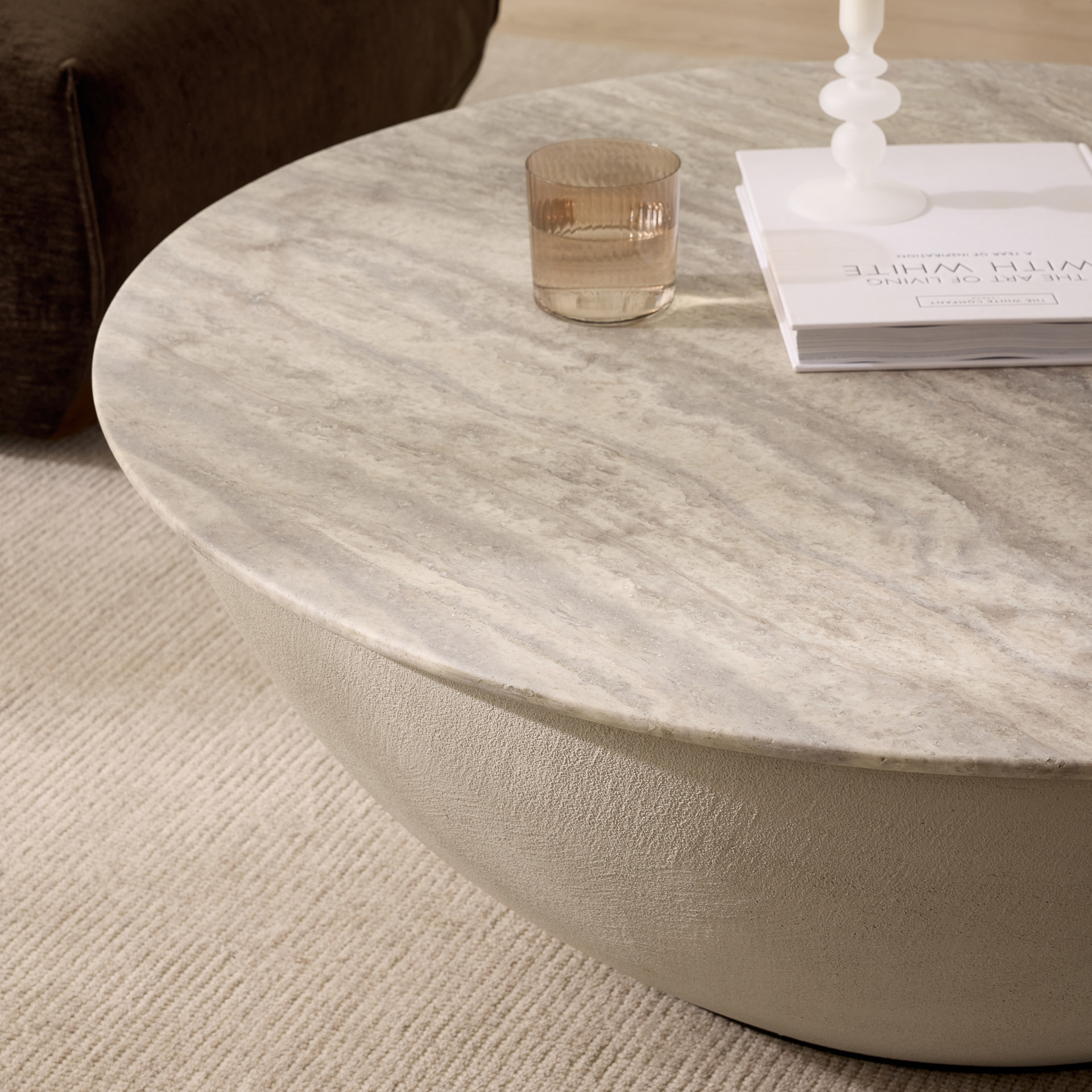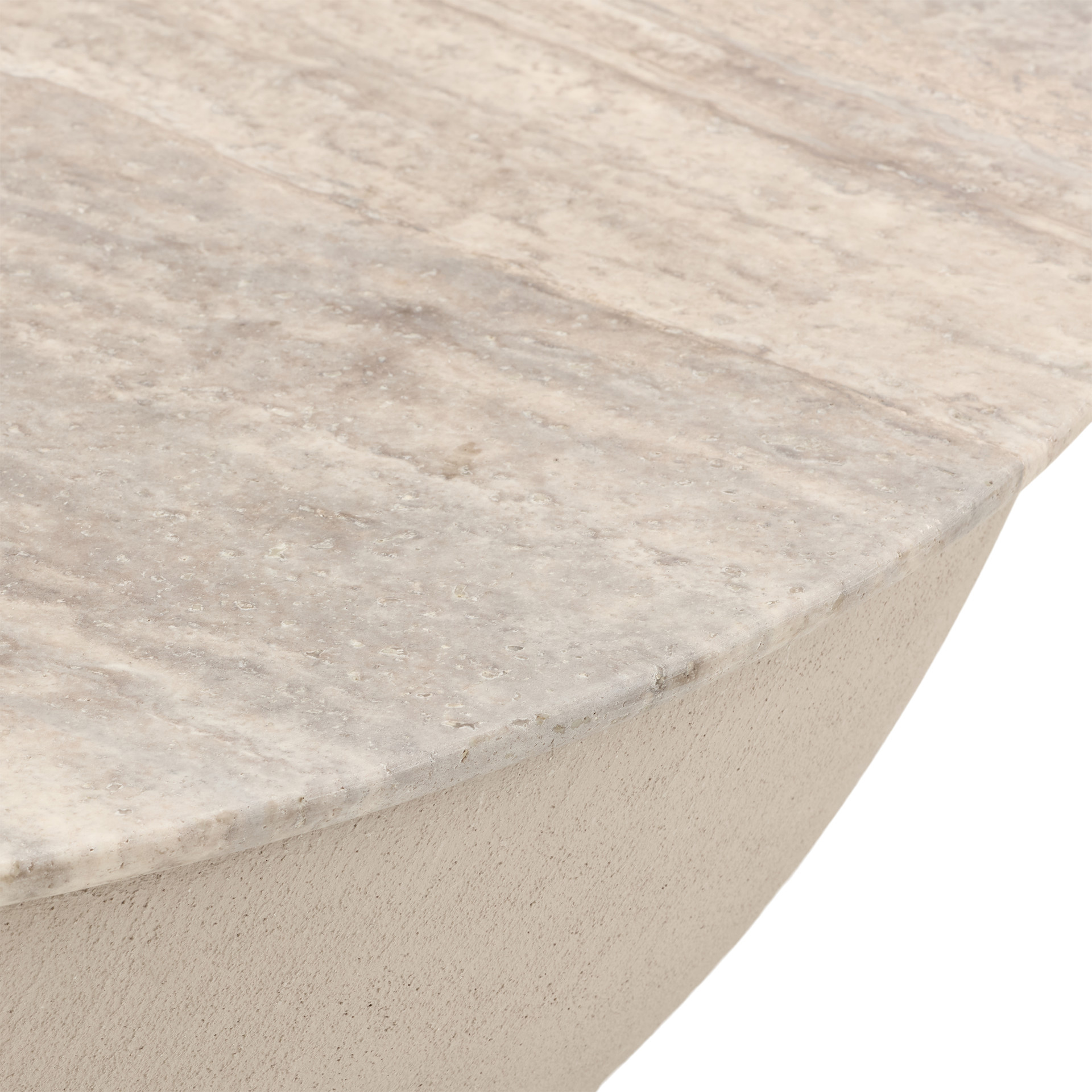 La base minimale est faite de micro ciment dans un taupe argenté qui complète la luxueuse surface en marbre. La collection Travertine offre une grande polyvalence avec des options supplémentaires, notamment une table de salle à manger ronde et rectangulaire, un buffet élégant et une paire de tables d'appoint chic emboîtées. Chaque pièce est conçue pour créer un look cohérent, parfait pour les repas de tous les jours et les occasions spéciales.