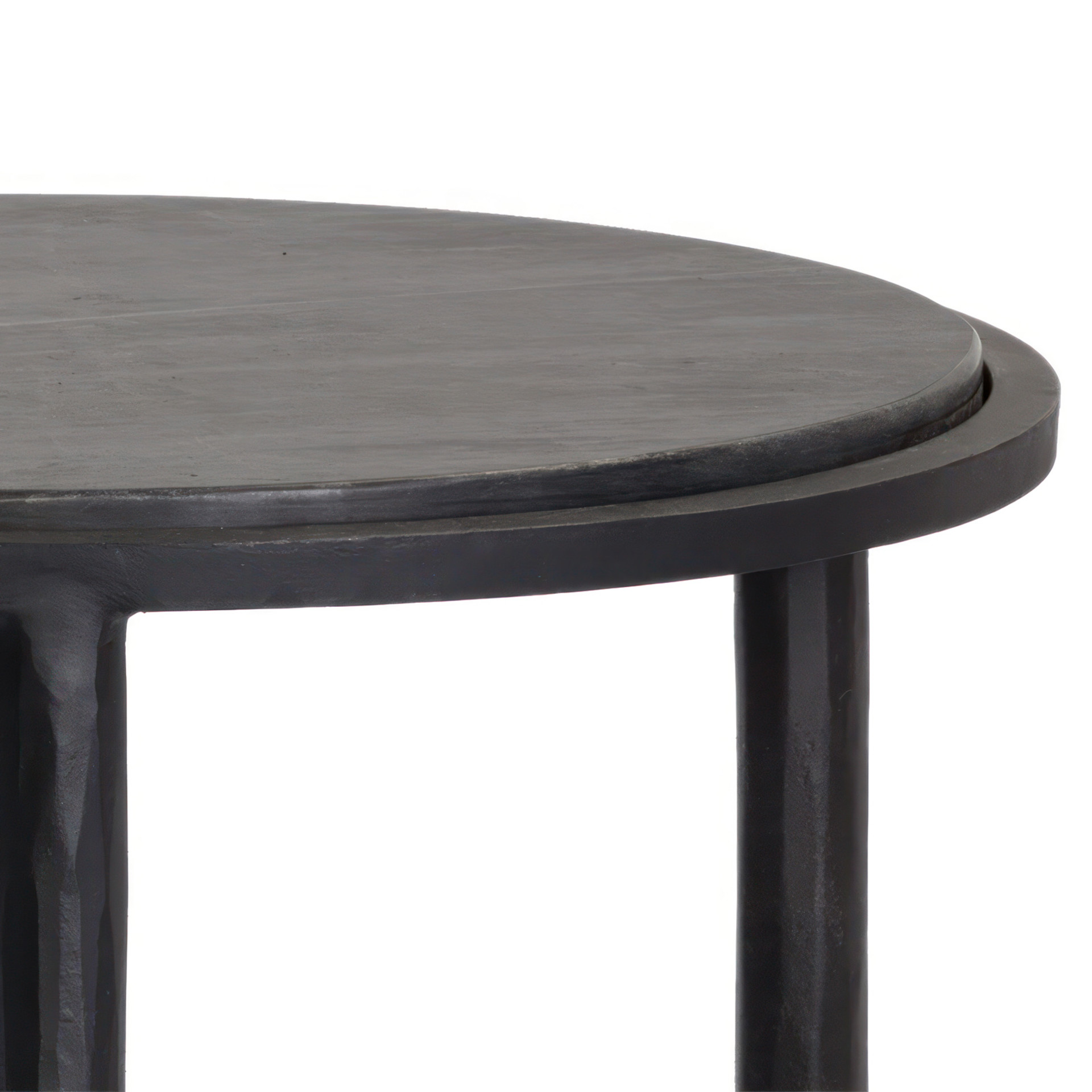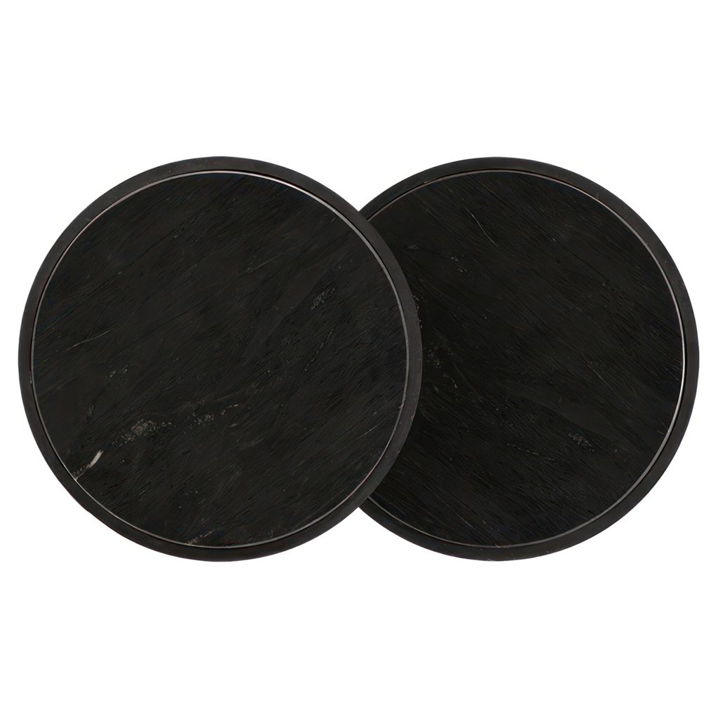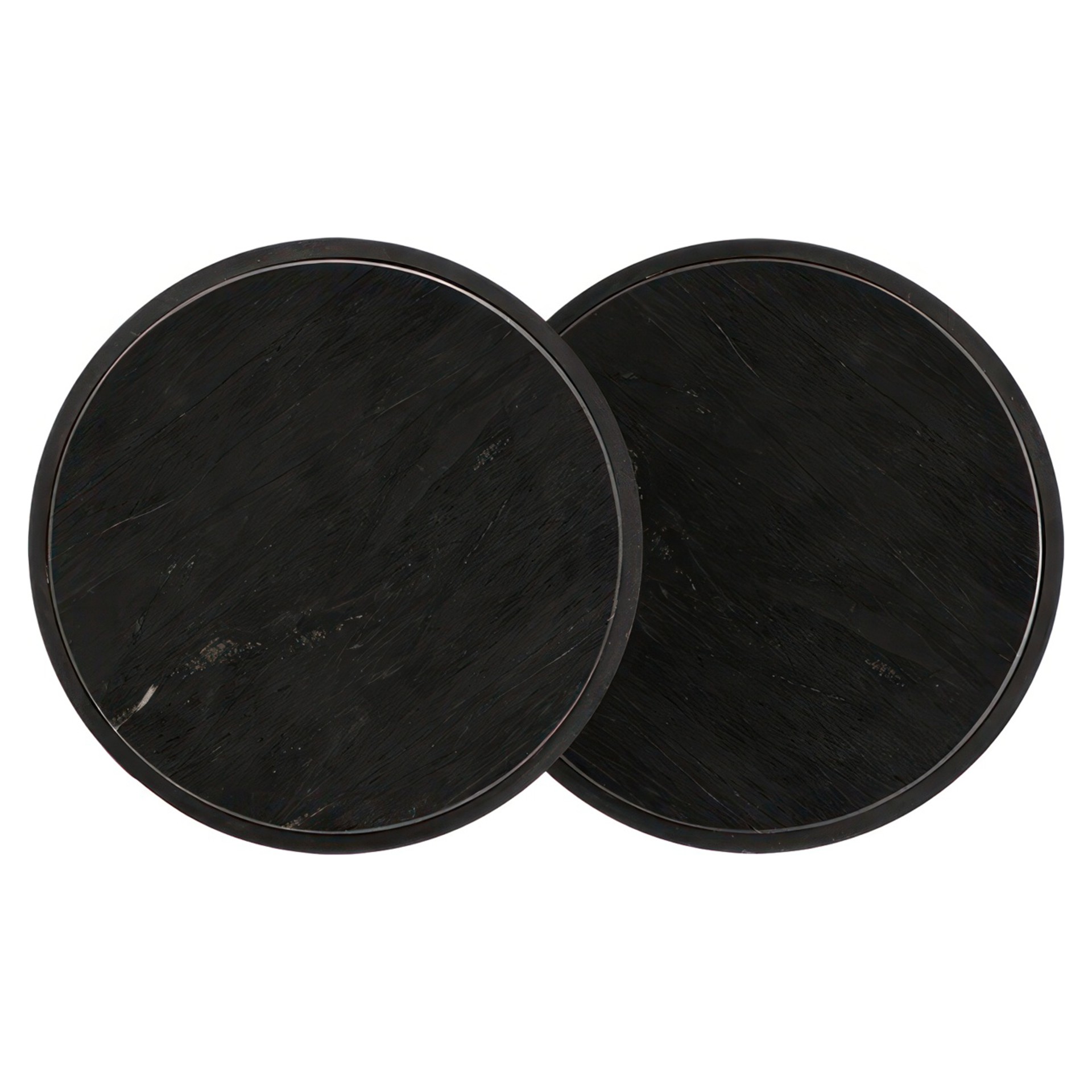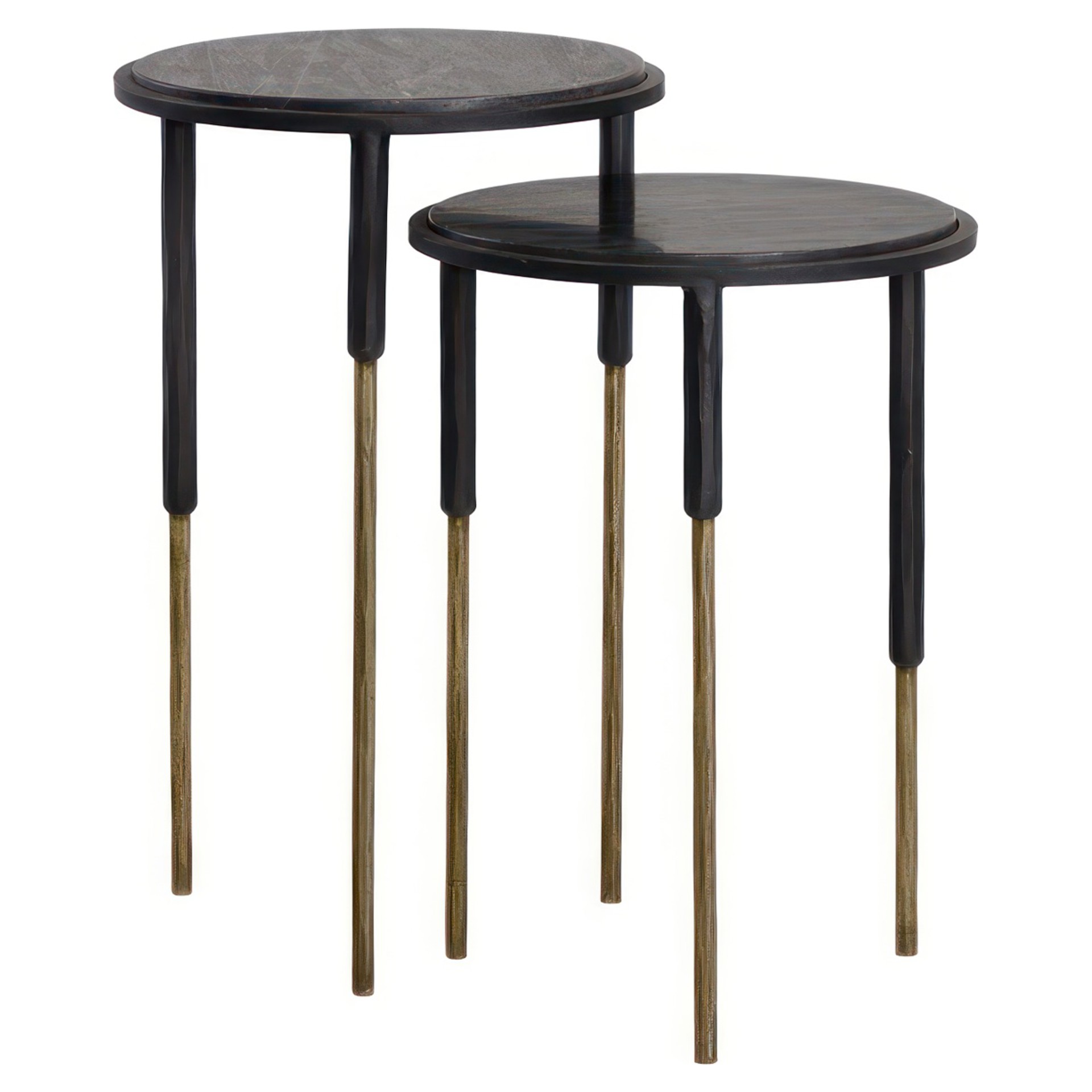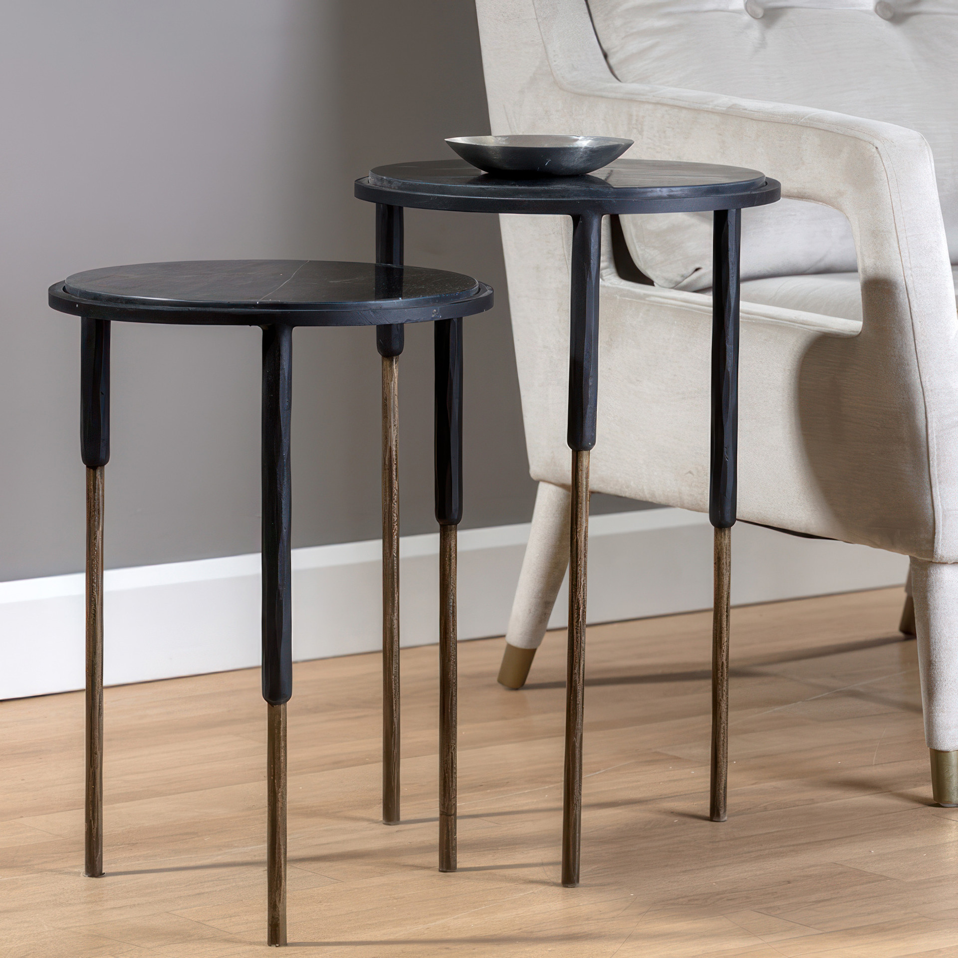 Un ensemble surréaliste de tables d'appoint gigognes fabriquées en Inde. Chaque table est dotée d'un plateau en marbre noir spectaculaire et de pieds en fer noir fini à la main et en laiton antique. Fabriqué en Inde: avec un savoir-faire raffiné, ce design a été donné vie par des artisans locaux qualifiés. Par nature, ces matériaux développent des imperfections uniques telles que des fissures, des marques et des variations de couleur pour une pièce vraiment unique en son genre.