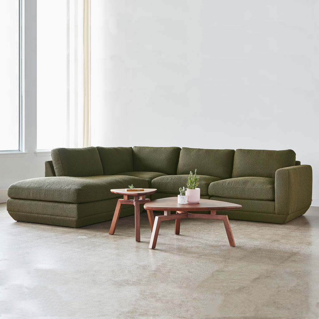 Les composants peuvent ensuite être facilement reconfigurés ou ajoutés ultérieurement pour s'adapter à l'évolution de votre style de vie. Chaque composant présente une silhouette décontractée inspirée du modernisme des années 1970 : une assise basse et profonde créée par des coussins de siège et de dossier moelleux, et une base attrayante, subtilement inclinée et chanfreinée.