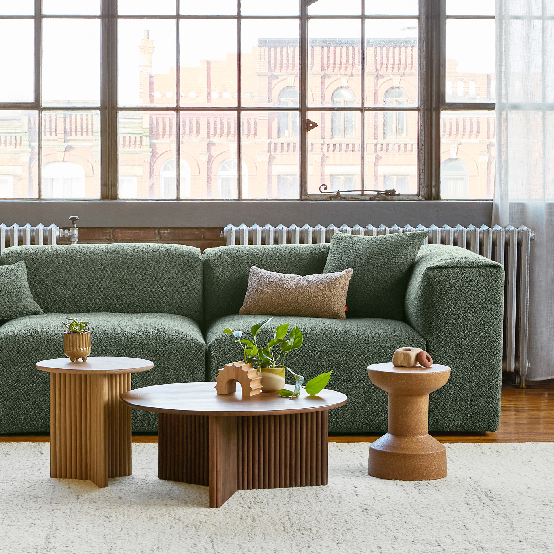 Chaque pièce présente un profil bas et dodu (grâce à un rembourrage en plumes de qualité supérieure) recouvert d'un tissu bouclé nubby, avec une forme moderne d'inspiration scandinave qui est suffisamment polyvalente pour tenir la cour dans une maison de plage, une escapade en montagne ou le hall d'un hôtel-boutique.