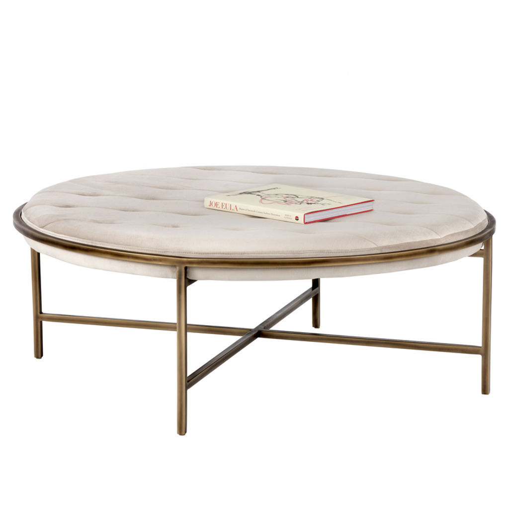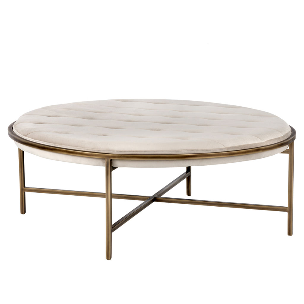 Transformez votre salon en un havre de confort avec cet ottoman Ethel au design raffiné. Son plateau matelassé offre un accueil moelleux pour vos pieds fatigués, tandis que sa structure élégante en métal doré apporte une touche de sophistication à votre intérieur.