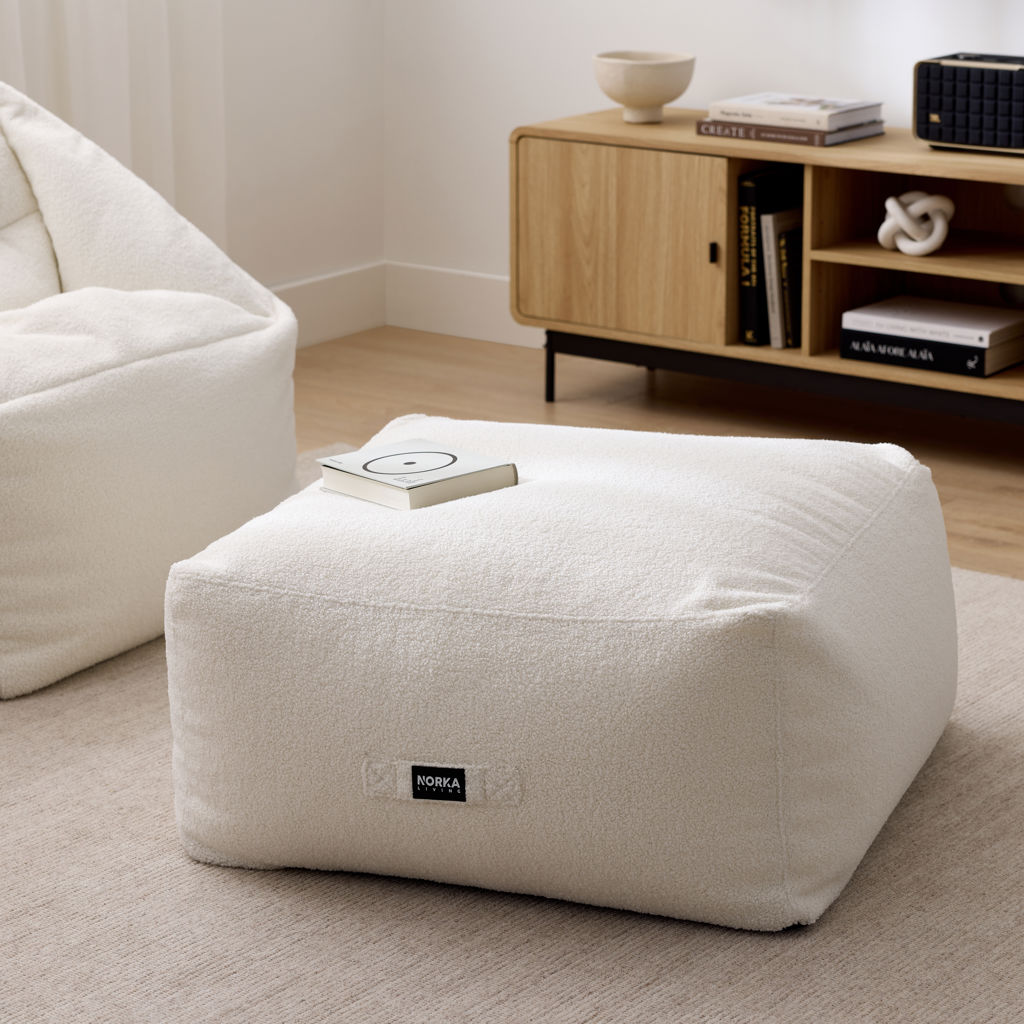 Élégance rectangulaire pouf , fabriqué en Sherpa 100% polyester, rempli de billes de polystyrène 100% recyclables.