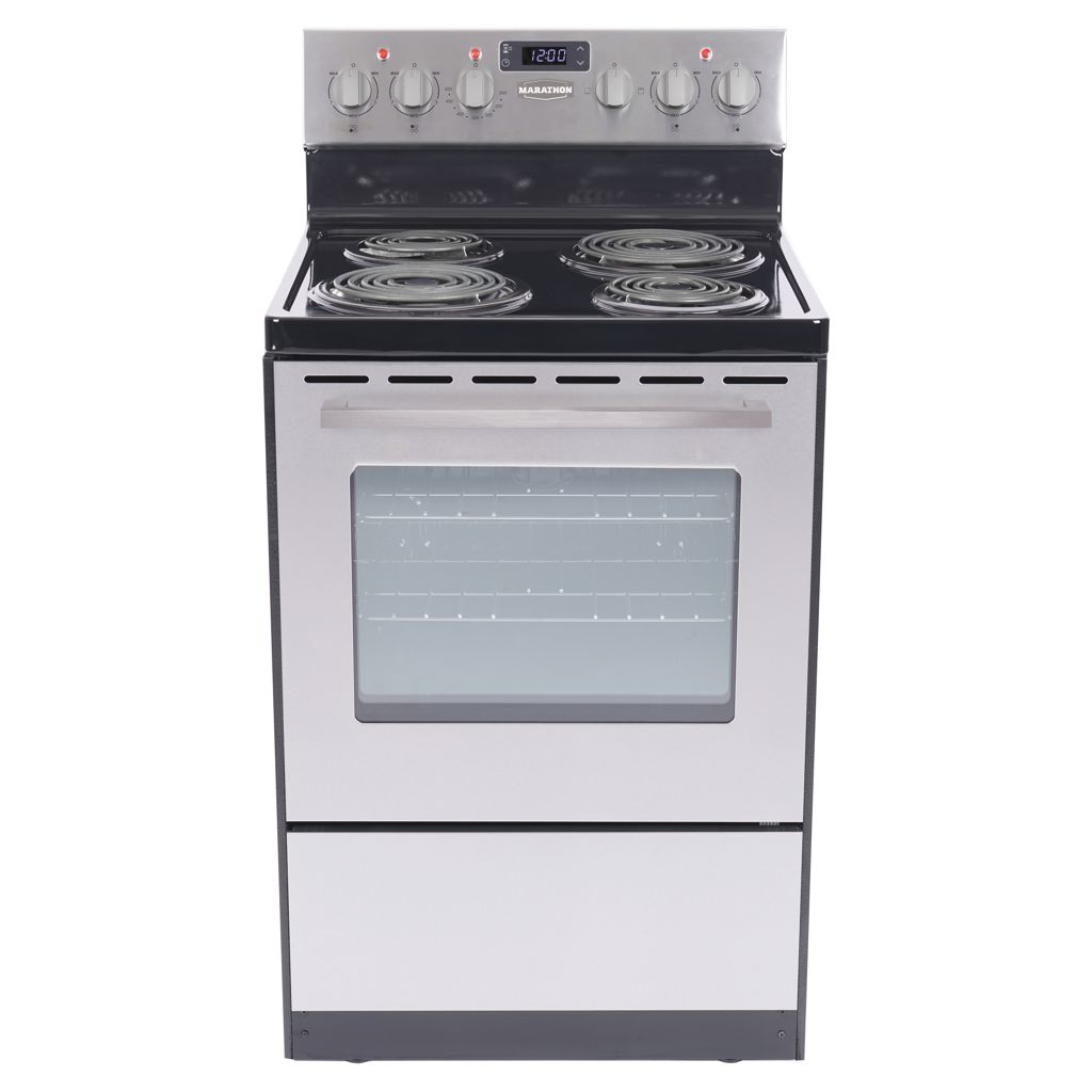 Parfaite pour le chalet, l'appartement ou partout où l'espace est restreint, cette cuisinière de style contemporain Marathon en acier inoxydable de 24 po de large comprend deux éléments de brûleur à serpentin à 6 po et 2 éléments de brûleur à chauffage rapide de 8 po avec des bols de brûleur en porcelaine.