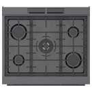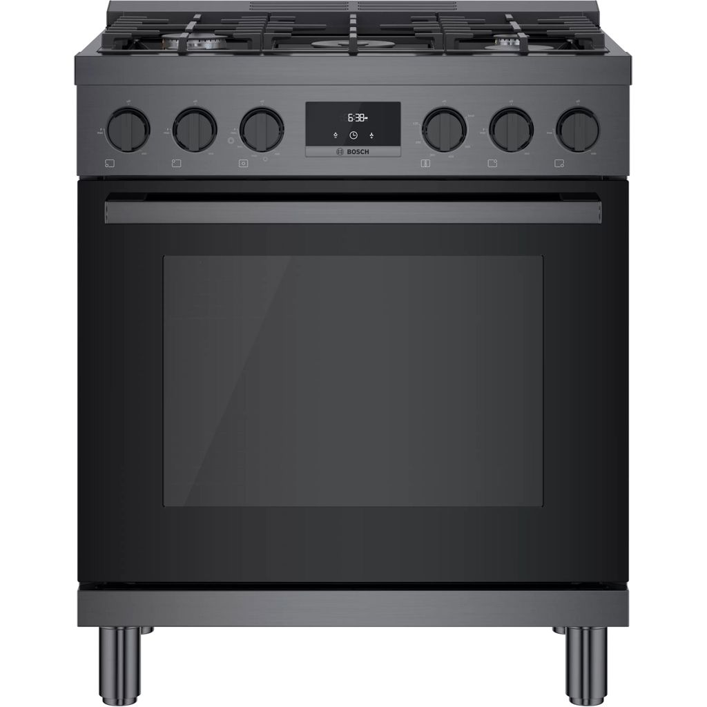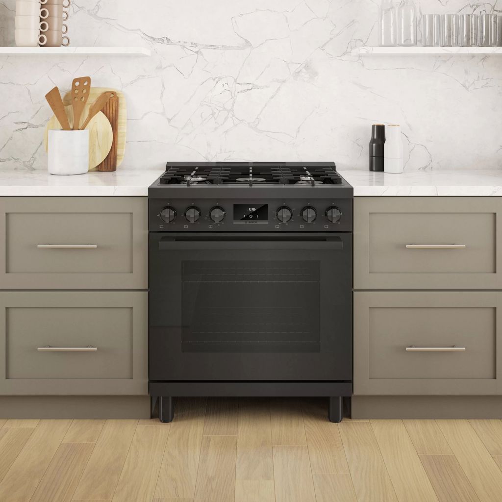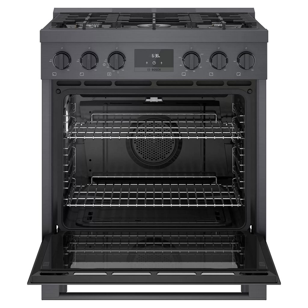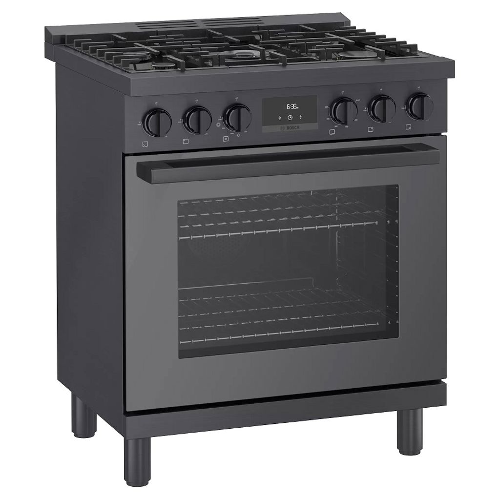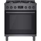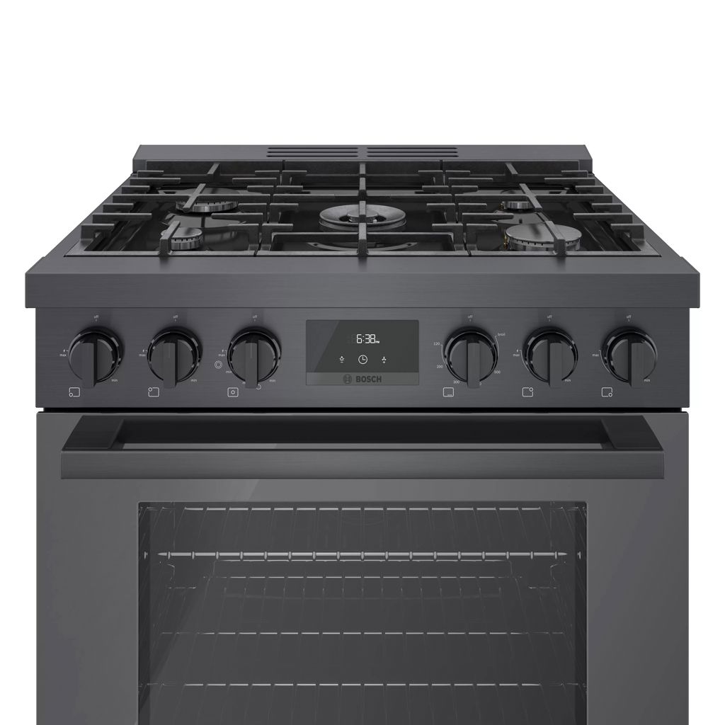 Cuisinière au gaz naturel de style industriel de 30 pouces en acier noir Bosch série 800.  Avec un look moderne et robuste et des boutons de commande avant en métal moulé sous pression, cette gamme devient le point central dans n'importe quelle cuisine.