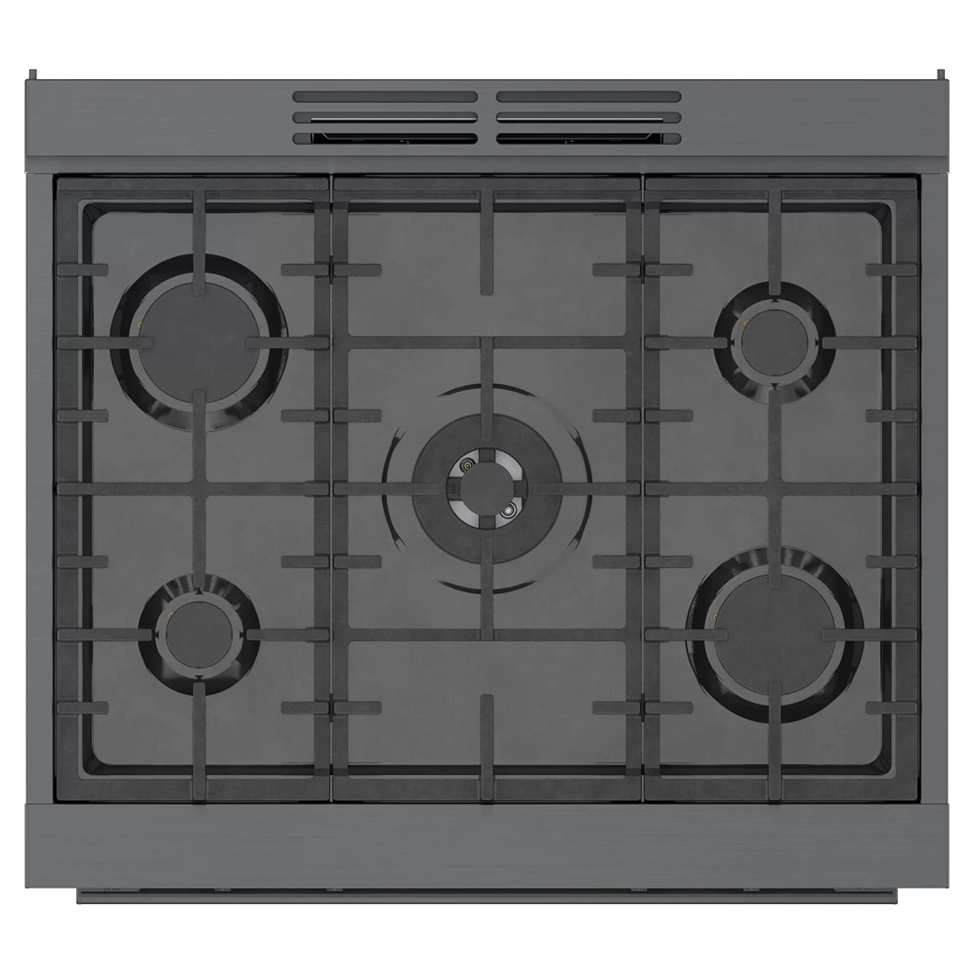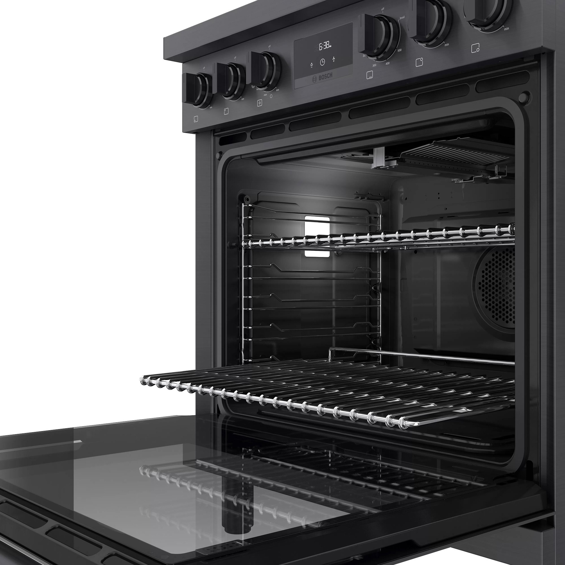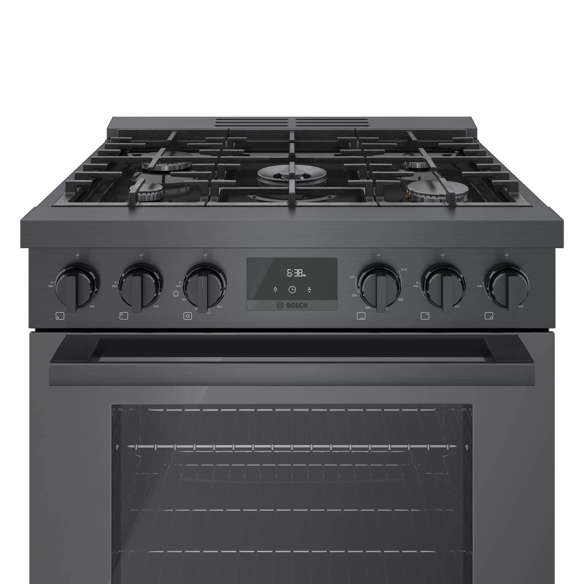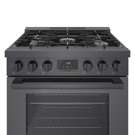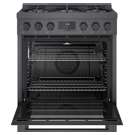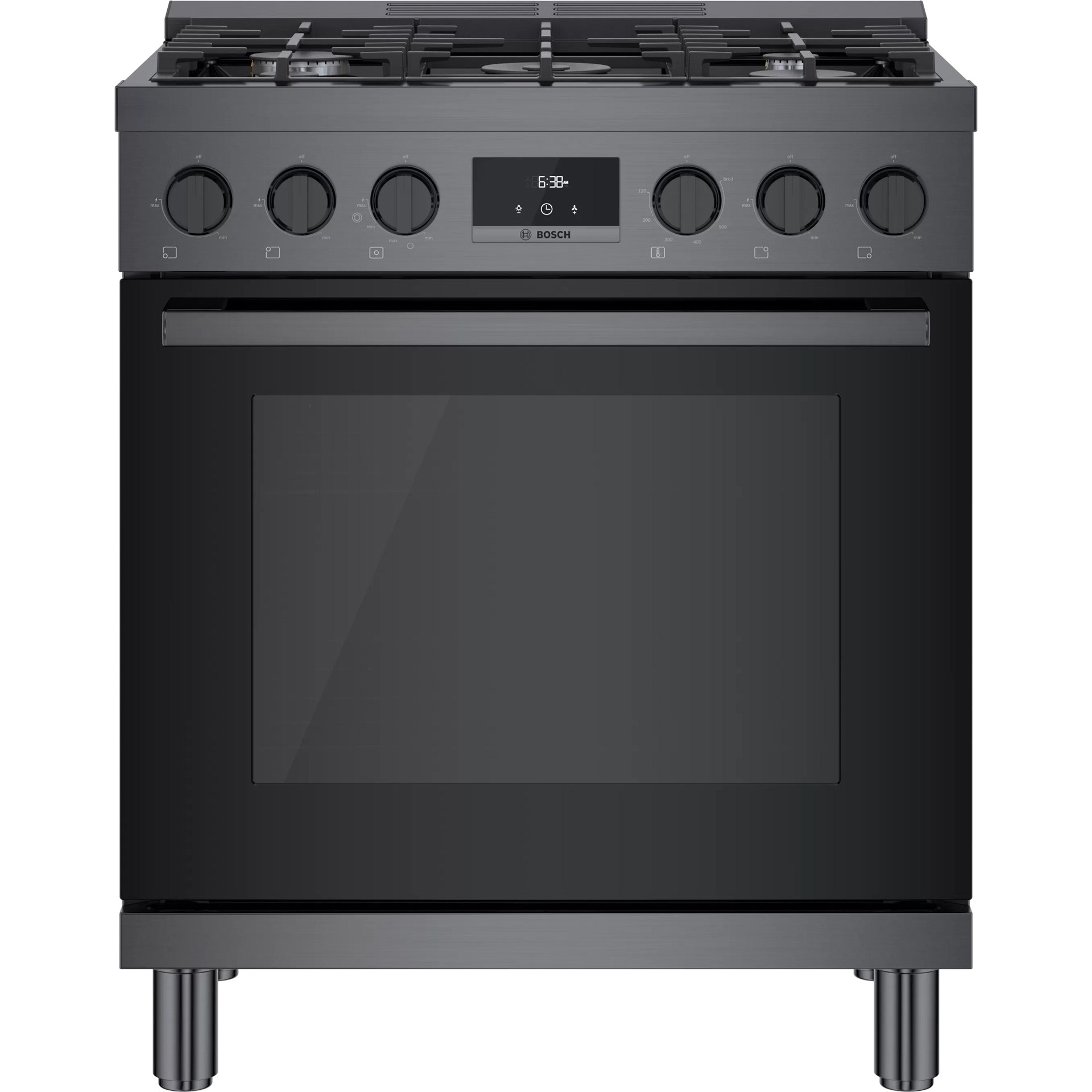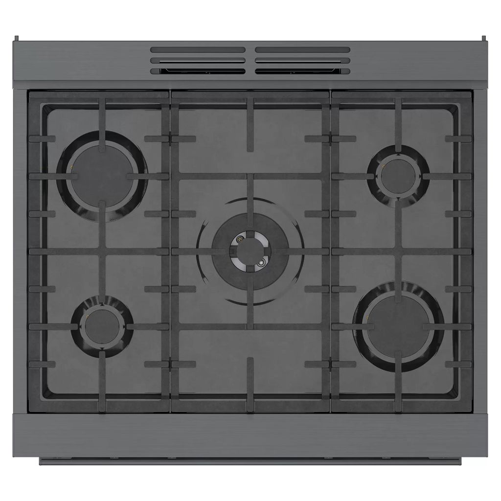 Cuisinière au gaz naturel de style industriel de 30 pouces en acier noir Bosch série 800.  Avec un look moderne et robuste et des boutons de commande avant en métal moulé sous pression, cette gamme devient le point central dans n'importe quelle cuisine.