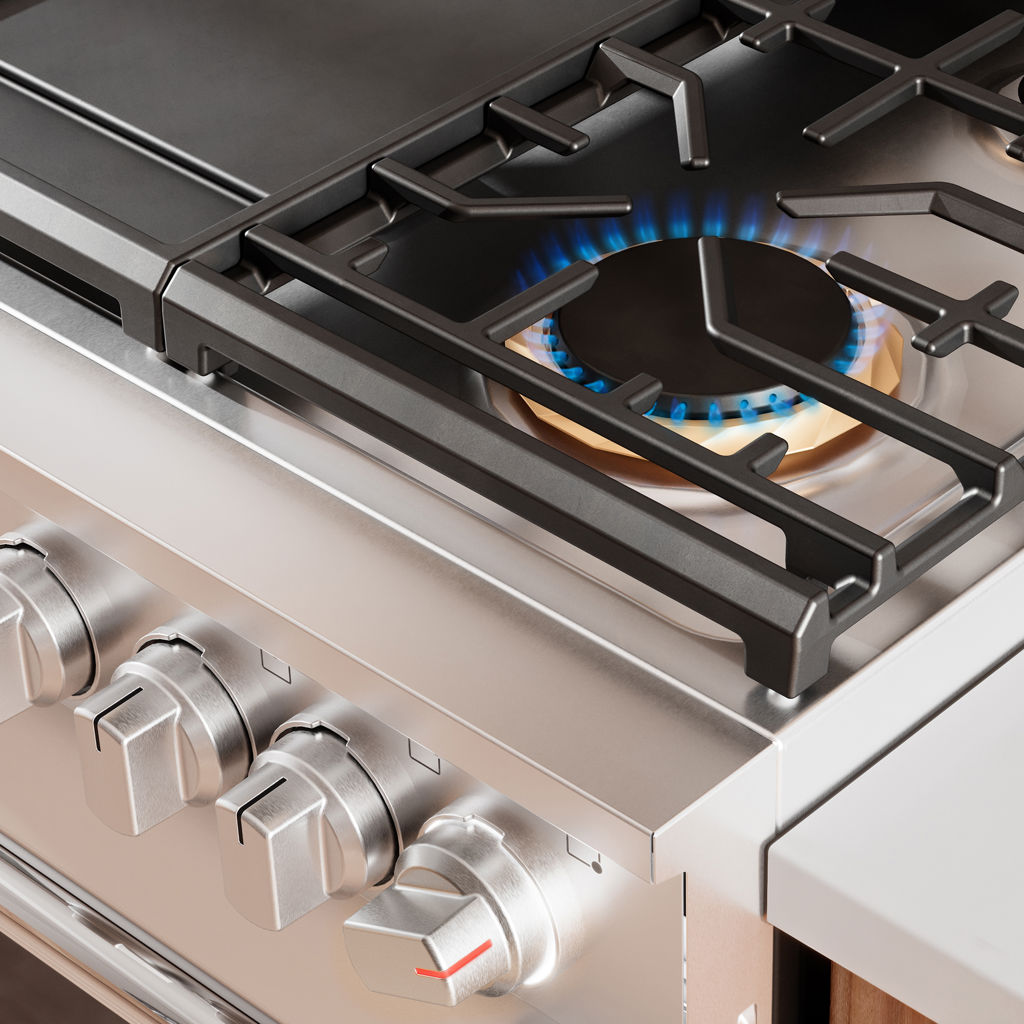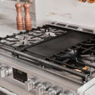 La cuisinière à gaz Frigidaire Professional de 30 po à commande frontale avec convection totale est dotée de notre système de convection le plus puissant et le plus sophistiqué, qui permet des modes de cuisson tels que l'absence de préchauffage, la friture à air chaud, la mijote, la cuisson à la vapeur, le rôtissage à la vapeur, le sous-vide à l'air, le rôtissage par convection, la cuisson par convection, le pain à l'épreuve et bien d'autres encore! La table de cuisson flexible à six brûleurs comprend notre brûleur Even TempTM de 18 000 BTU et une plaque chauffante en fonte intégrée.