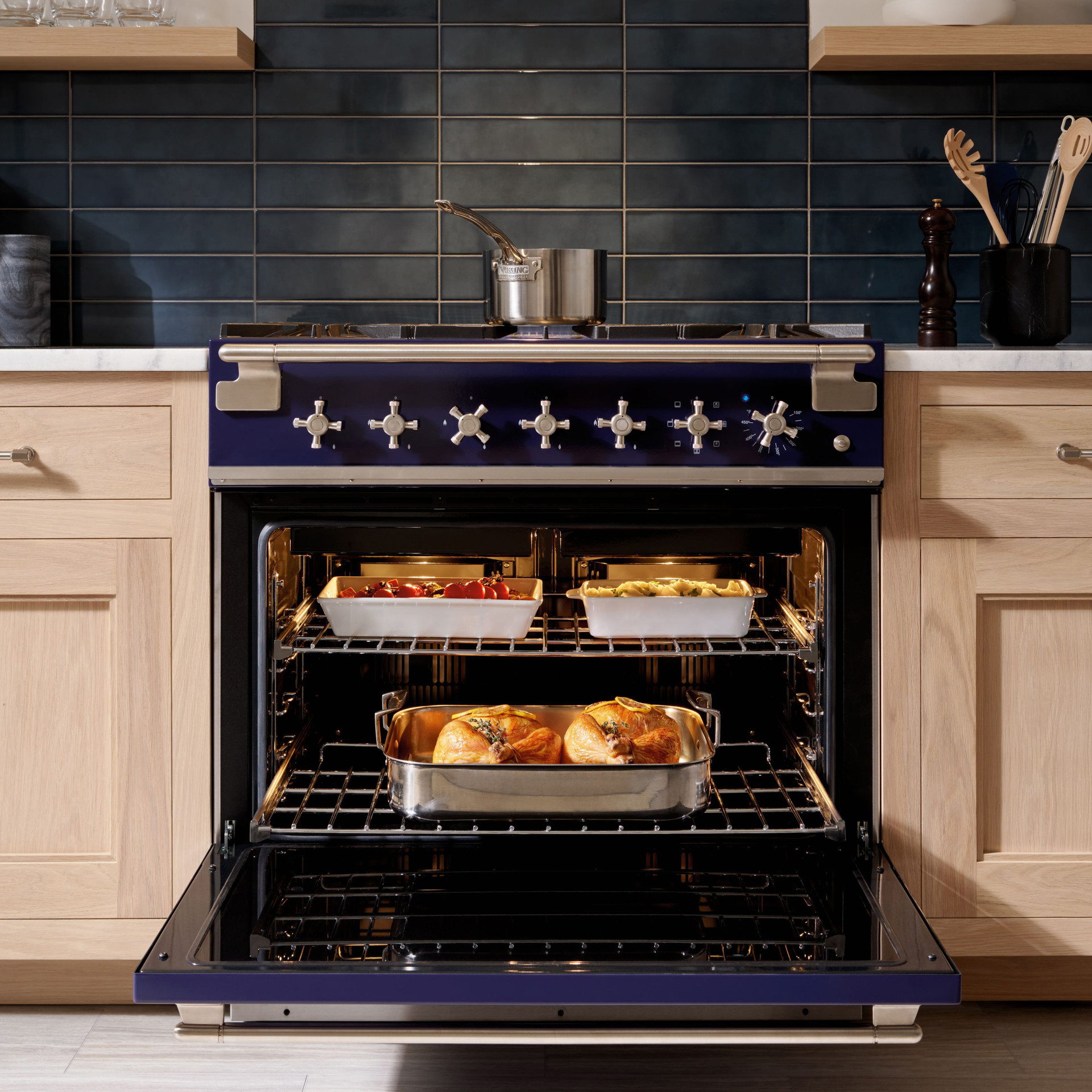 Le modèle AGA Elise 36" à double combustible comprend un grand four multifonction avec sept réglages, dont la véritable cuisson à double convection européenne, la cuisson à convection forcée, le brunissement, la décongélation et le service, la cuisson au gril par convection, le réchauffage et la cuisson conventionnelle.