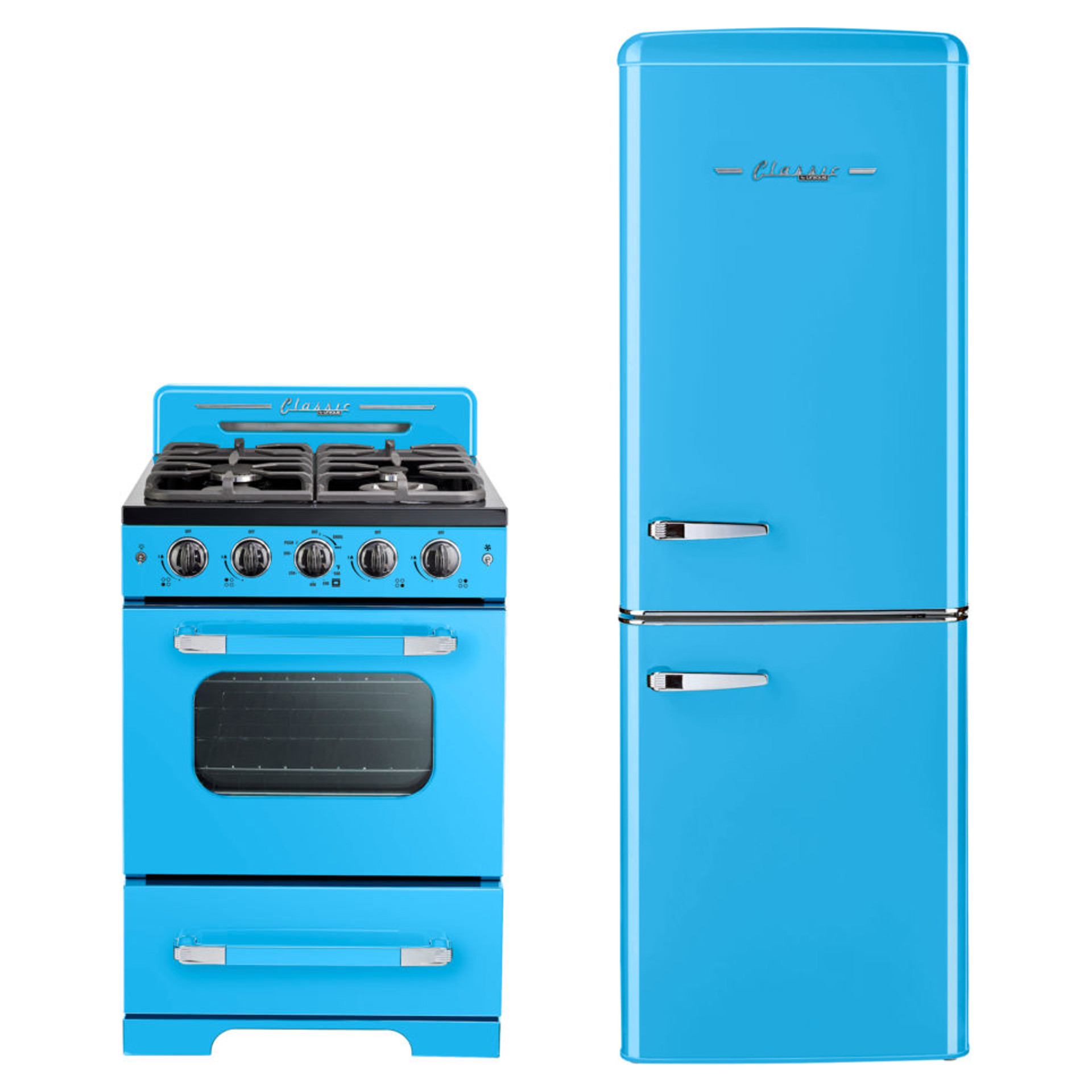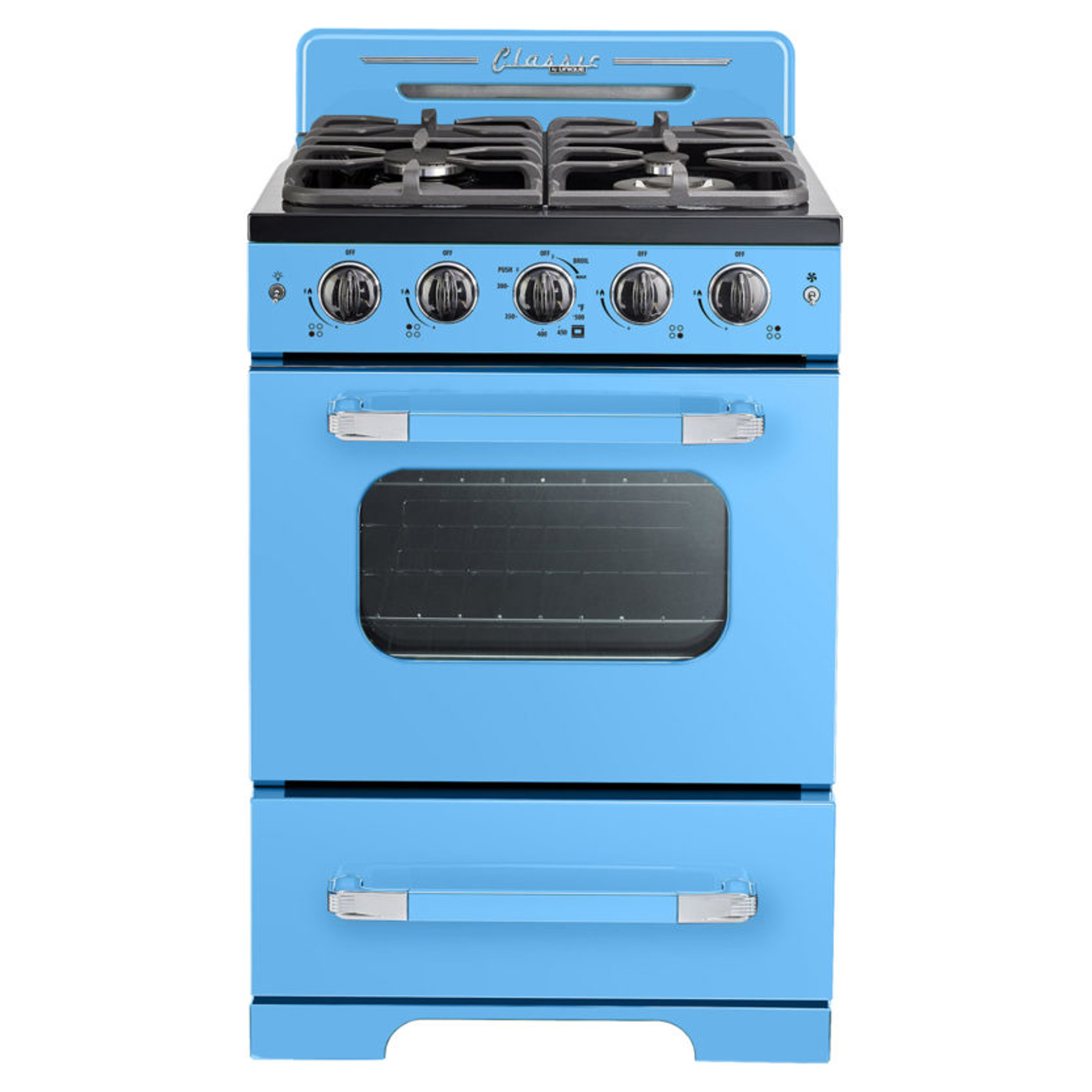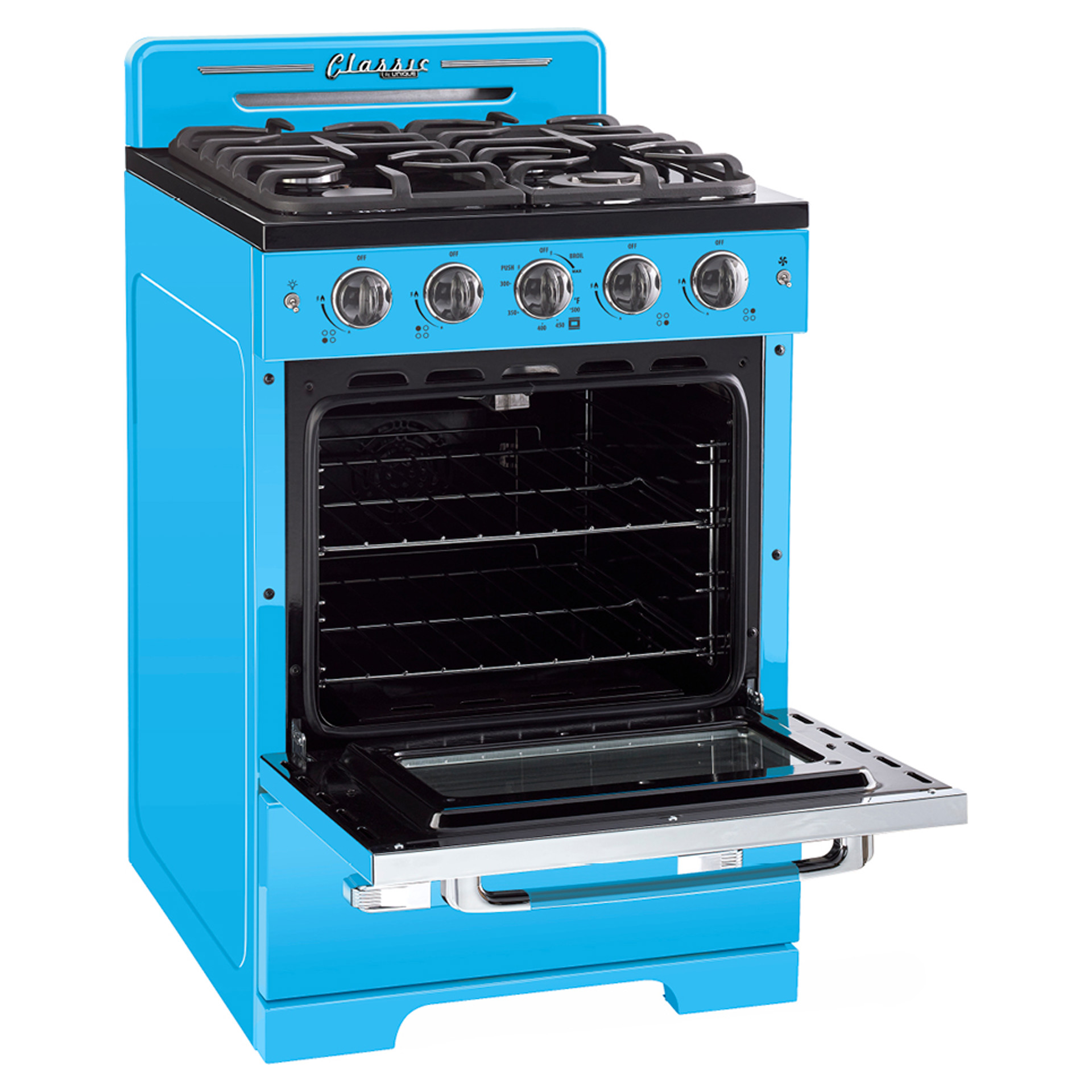 Invitez un style inspiré des années 1950 dans votre cuisine avec la cuisinière à gaz Unique Classic Retro. Cette gamme autonome dispose d'un 2,9 cu. pi. capacité et 4 brûleurs avec une grille en fonte continue pratique. Il est équipé d'un ventilateur à convection pour une cuisson magnifiquement uniforme et d'un gril à hauteur de taille pour que vous puissiez dorer vos plats à la perfection.