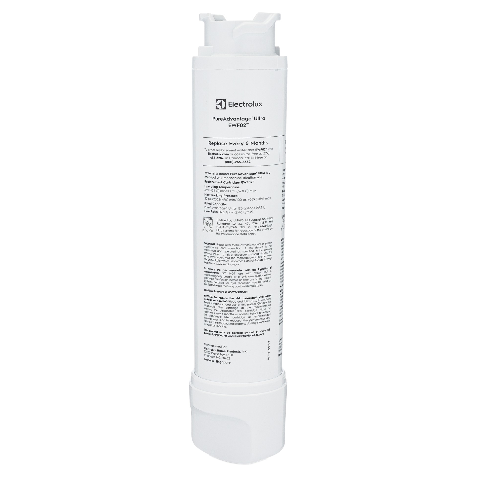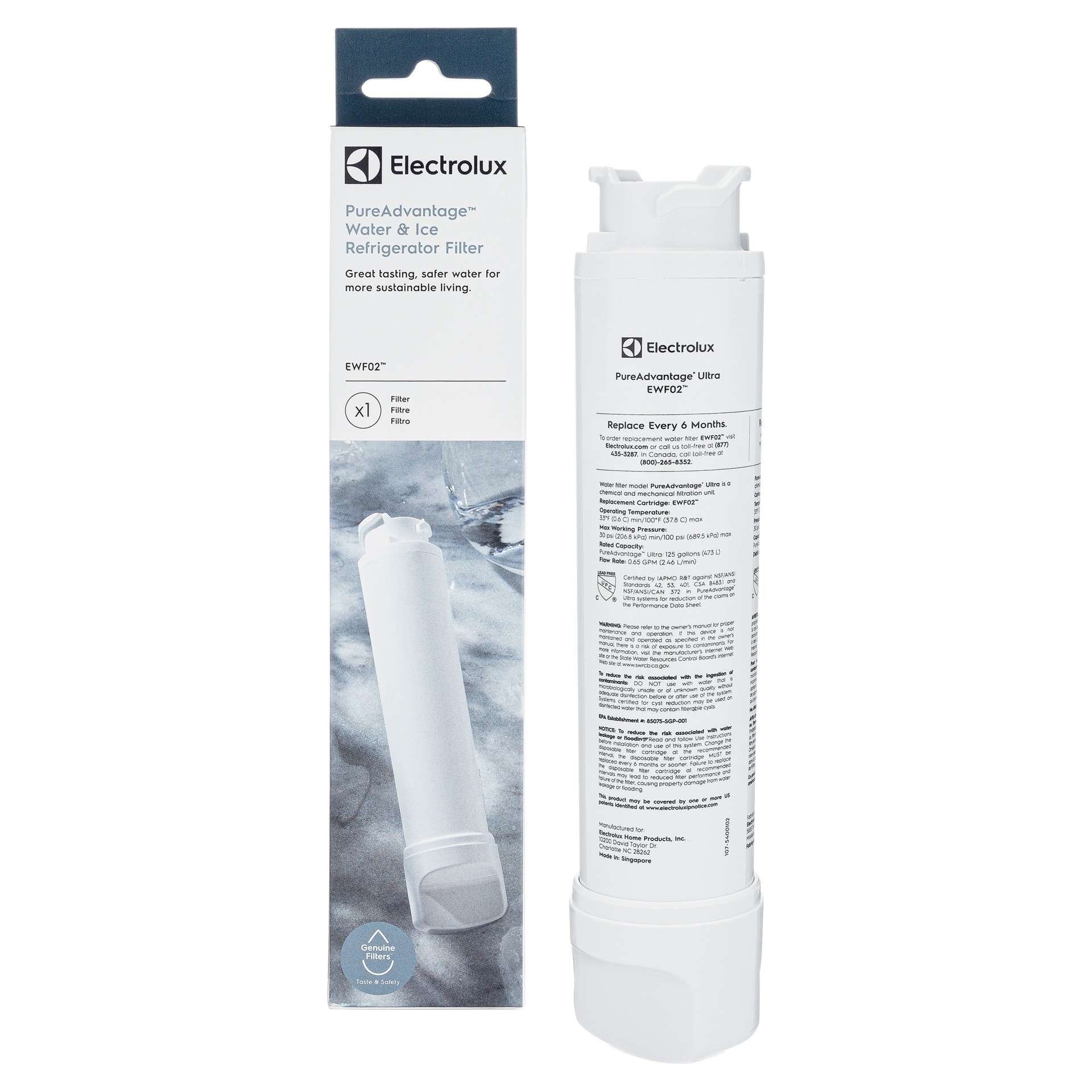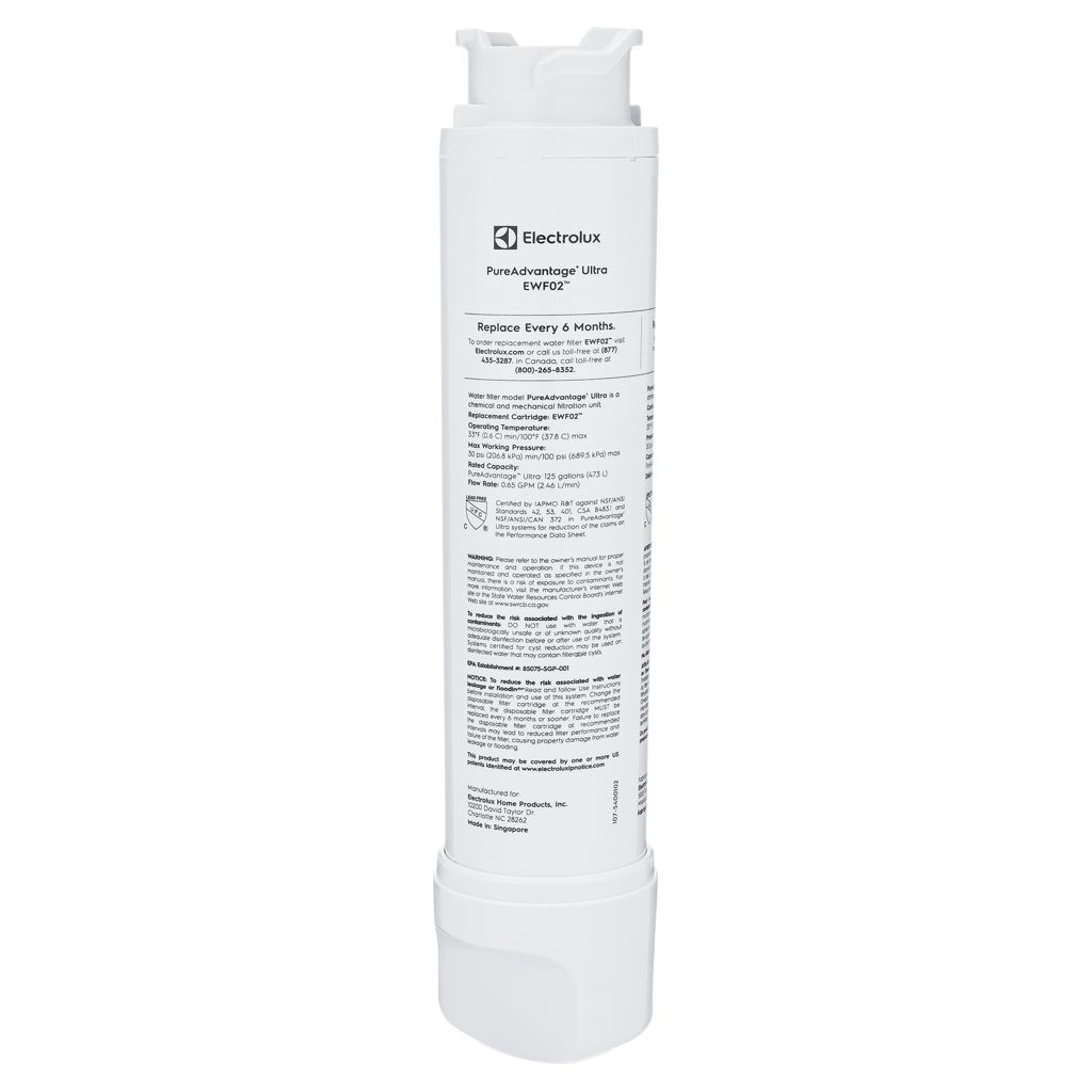 Profitez chaque jour d'une eau propre et vivifiante provenant de votre réfrigérateur grâce aux filtres à eau PureAdvantage™. Le filtre push-twist PureAdvantage™ EWF02 d'Electrolux est certifié par IAPMO R&T pour répondre aux normes NSF/ANSI 42 et 53. Le filtre dure généralement jusqu'à 6 mois.