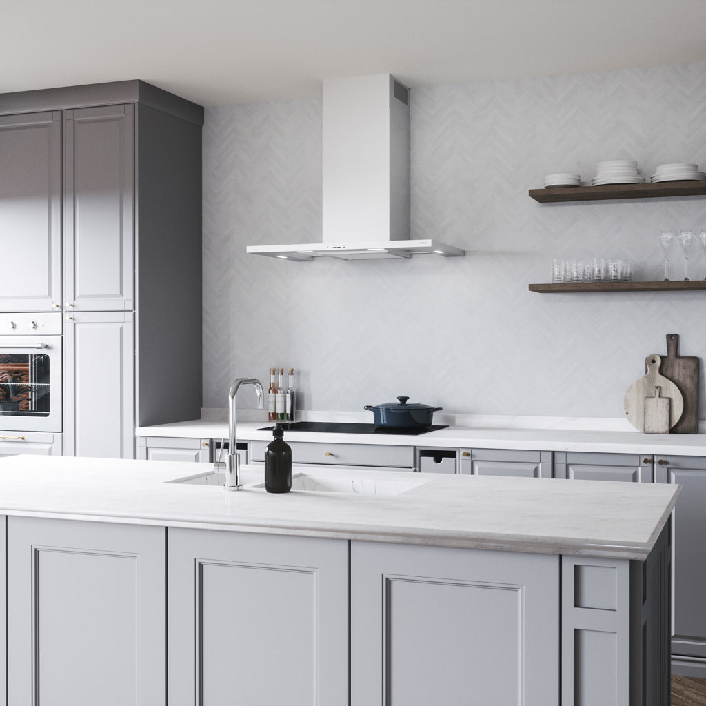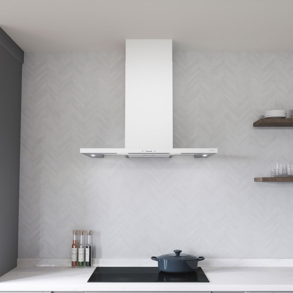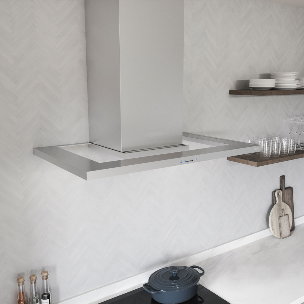 Ressemblant à une île flottante en acier et en verre, Modena abrite un éclairage LED LumiLight et des commandes ICON Touch® à 5 vitesses dans son auvent en acier inoxydable d'un pouce.