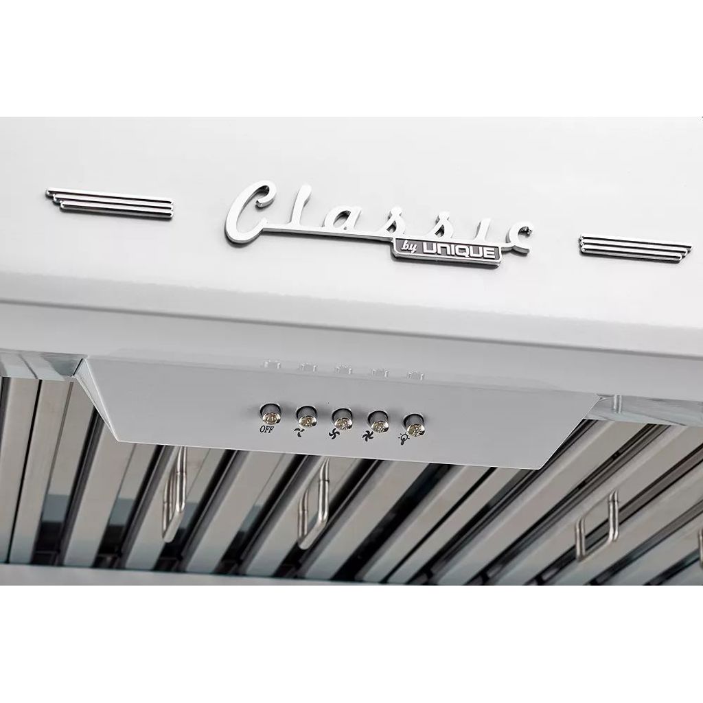 La hotte de cuisinière Classic Retro de 24 po par Unique vous transporte dans les années 50 avec son design rétro emblématique et ses finitions chromées. L'accompagnement parfait pour la cuisinière Retro Classic de 24 po.