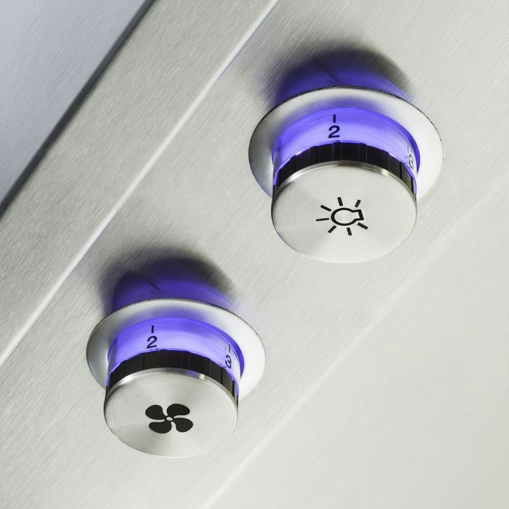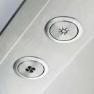 Les boutons LED rétroéclairés s'étendent et s'illuminent pour contrôler le niveau d'éclairage et la vitesse du ventilateur, puis se rétractent complètement lorsqu'ils ne sont pas utilisés.