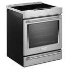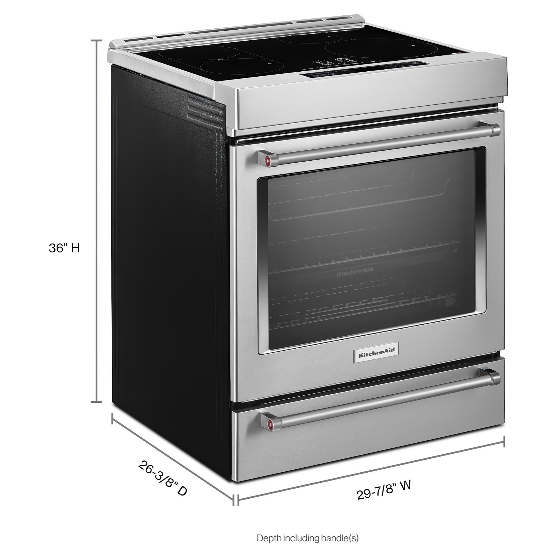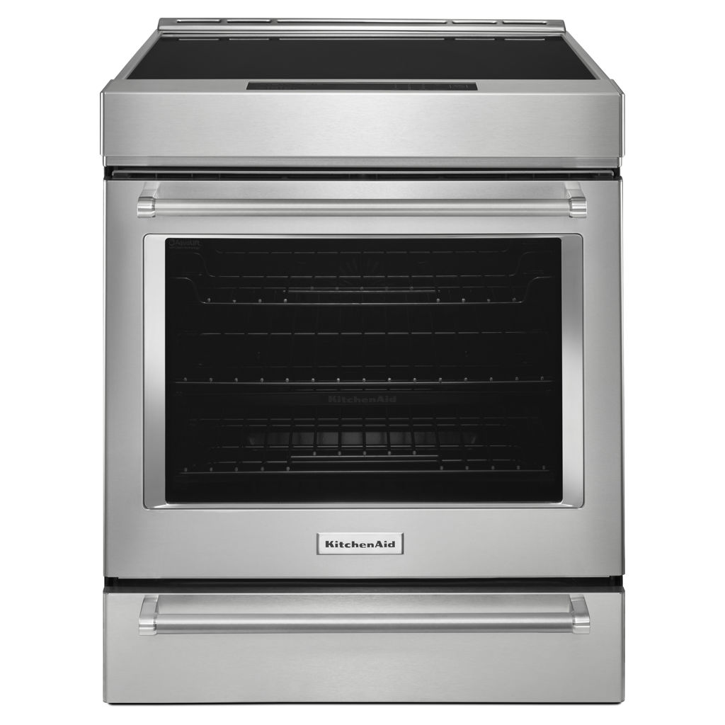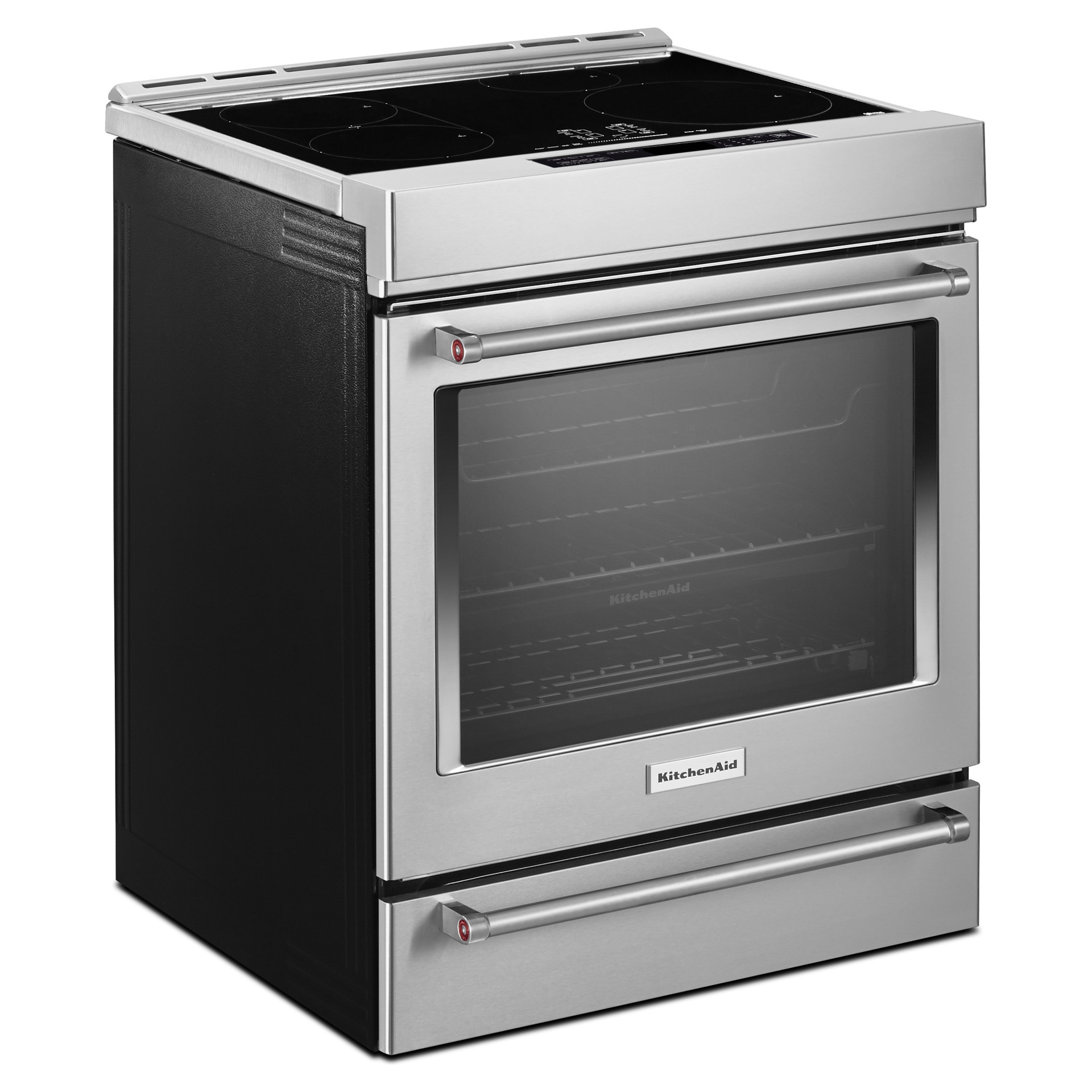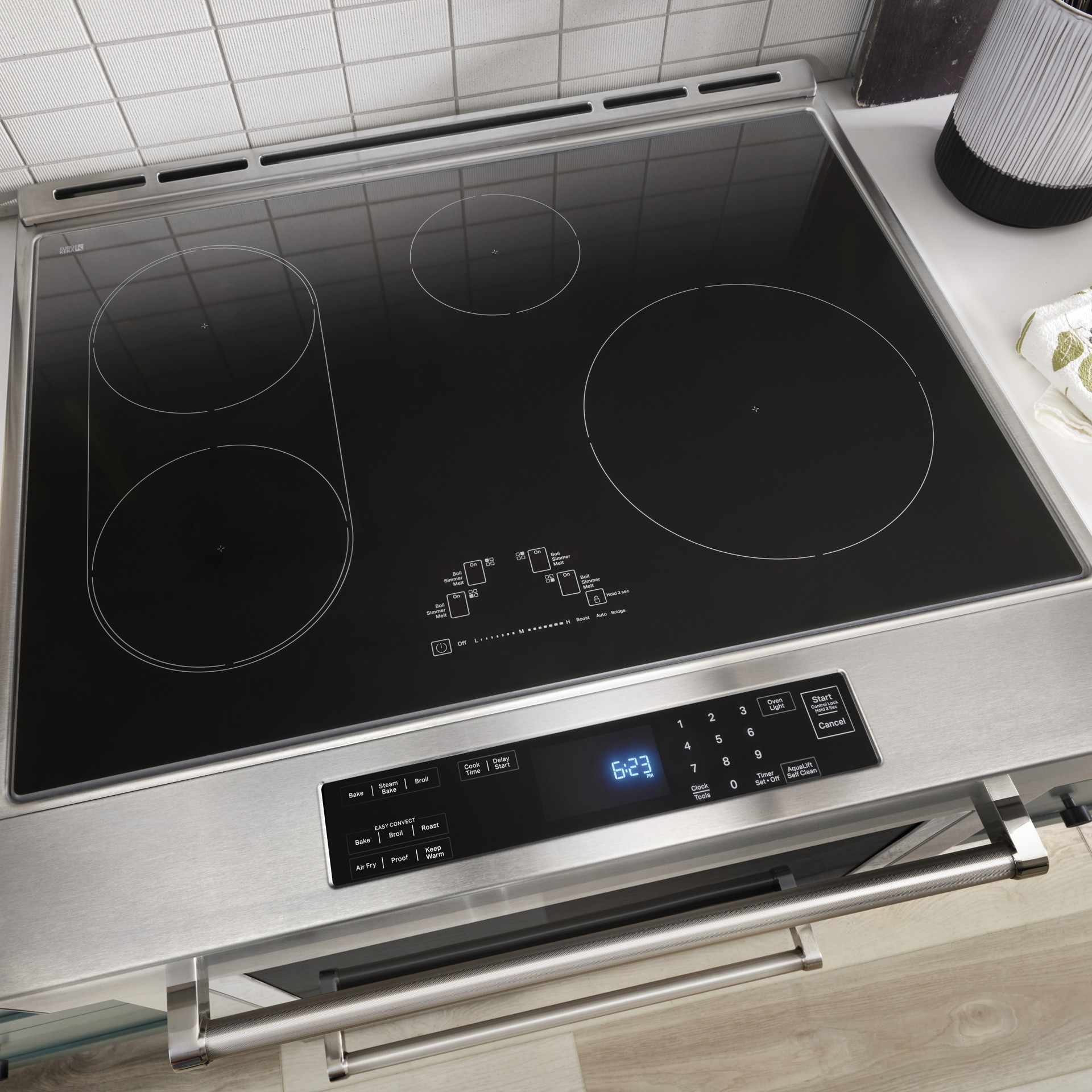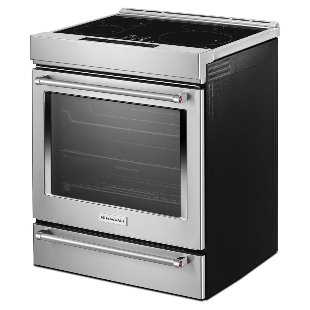 Cette cuisinière coulissante KitchenAid® en acier inoxydable à induction, à convection et à 4 éléments de 30 po et 6,4 pi cu combine la précision de l’induction avec la puissance de la friture à air. La surface de cuisson à induction par capteur génère la chaleur directement dans la batterie de cuisine et le four est doté de la convection véritable Even-Heat™ ainsi que du mode de friture à air; avec un panier spécial lavable au lave-vaisselle qui contribue à bien faire dorer et croustiller les aliments.