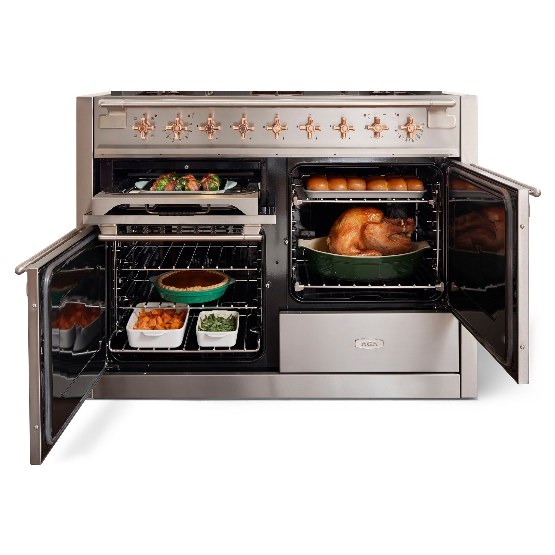 Le modèle à induction AGA Elise 48" comprend trois fours distincts. Le premier est un four électrique multifonction avec sept réglages, dont la véritable cuisson à double convection européenne, la cuisson à convection assistée, le brunissement, la décongélation et le service, la cuisson au gril par convection, le réchauffage et la cuisson conventionnelle.