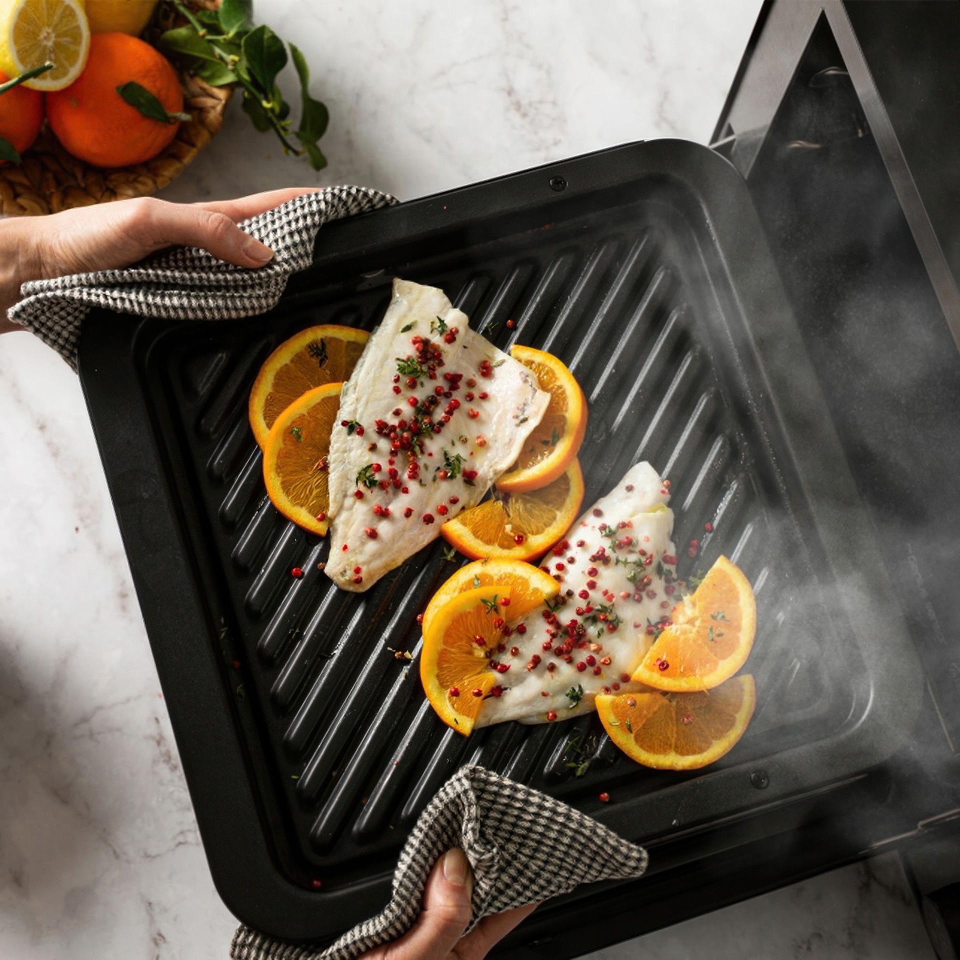Rendez vos aliments frits plus sains simplement en les faisant griller avec le DS59. La graisse libérée pendant la cuisson coule dans les rainures du plateau de gril, éliminant l'huile afin que les aliments soient juteux à l'intérieur et croustillants tout autour, sans qu'il soit nécessaire de les retourner.