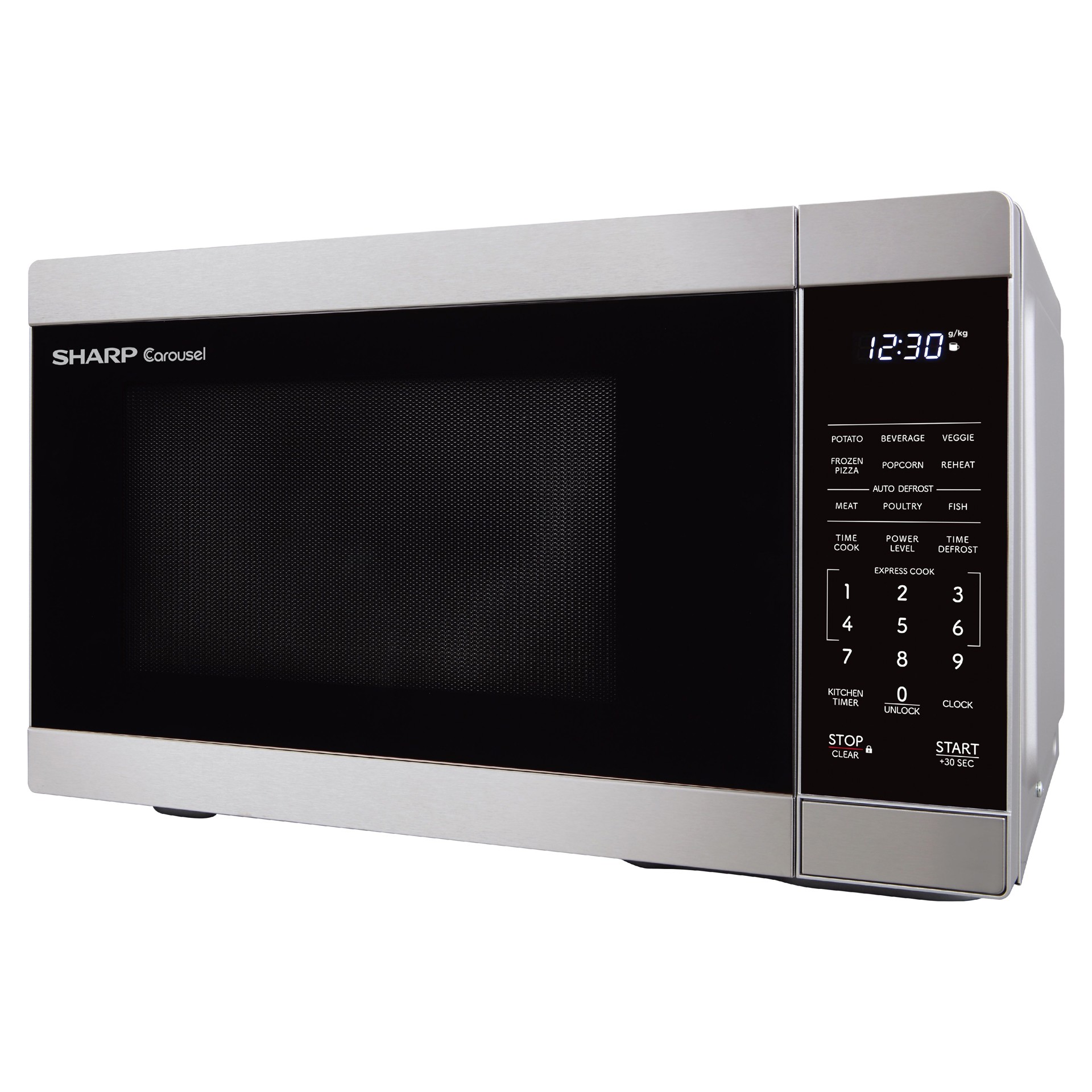 La fonction Express Cook permet de cuire jusqu'à six minutes à l'aide d'une seule touche.  La touche +30 peut être utilisée pour un démarrage instantané et pour ajouter du temps pendant la cuisson.  La finition en acier inoxydable facile à nettoyer, l'intérieur gris élégant et l'éclairage LED complètent votre style. Le plateau en verre de 12,4 pouces du système de plateau tournant Carousel®, lavable au lave-vaisselle, facilite le nettoyage.  L'écran LED blanc est lumineux et facile à lire.