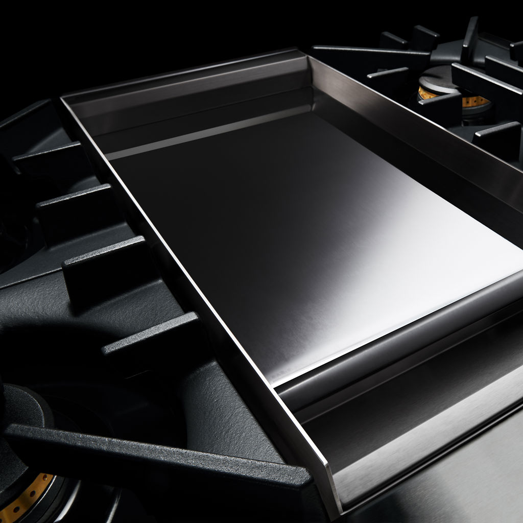 Des grilles géométriques robustes forment une surface élégante, conçue pour résister aux woks et batteries de cuisine lourdes.