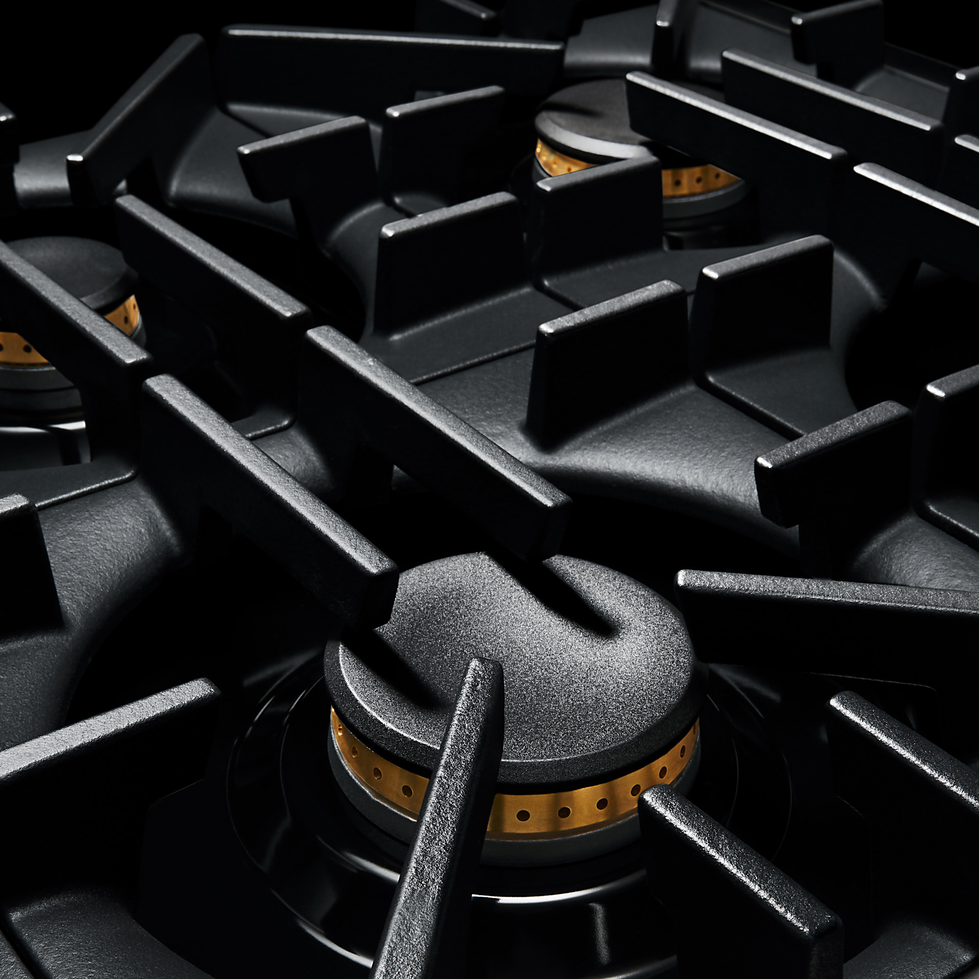 Brûleurs en laiton scellés. Flammes doubles précises. Une puissance de feu incomparable surgit à travers des grilles en fonte. Allumez le feu sans cliquetis, puis faites saisir et mijoter pour satisfaire votre faim la plus enragée.